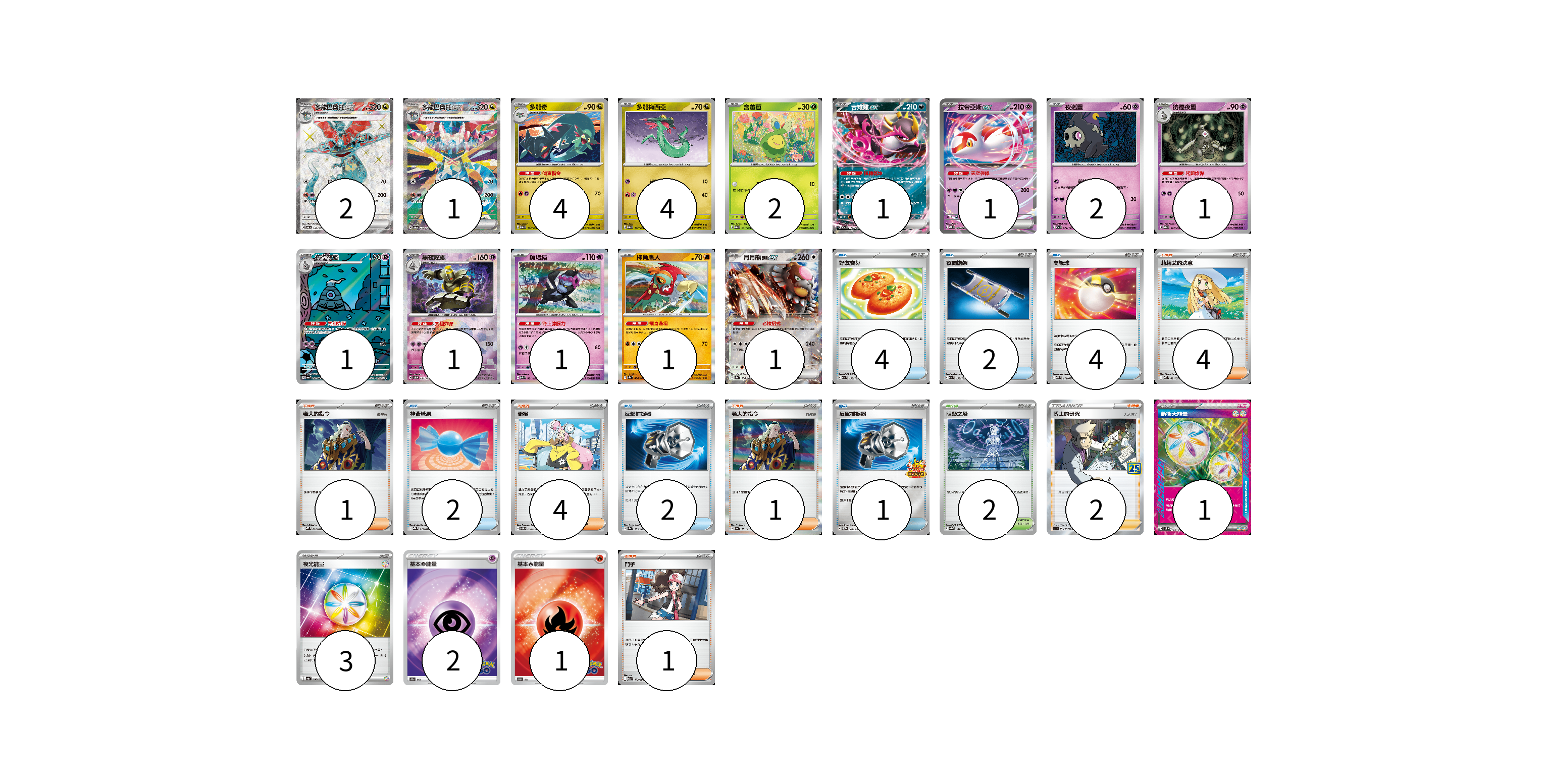 牌組構築方案 以此牌組為基礎新構築牌組 顯示卡面 顯示列表 寶可夢卡(23) 2 1 4 4 2 1 1 2 1 1 1 1 1 1 物品卡(15) 4 2 4 2 2 1 支援者卡(13) 4 1 4 1 2 1 競技場卡(2) 2 能量卡(7) 1 3 2 1 寶可夢卡(23) 卡牌名稱 張數 卡牌名稱 張數 多龍巴魯托ex SV6 120/101 02 多龍巴魯托ex SV8a 221/187 01 多龍奇 M2a 133/193 04 多龍梅西亞 M2a 132/193 04 含羞苞 M2a 011/193 02 吉雉雞ex M2a 114/193 01 拉帝亞斯ex MBD 003/022 01 夜巡靈 M2a 072/193 02 彷徨夜靈 M2a 073/193 01 彷徨夜靈 SV6a 069/064 01 黑夜魔靈 SV8a 066/187 01 願增猿 M2a 081/193 01 摔角鷹人 SV8a 084/187 01 月月熊 赫月ex SV8a 134/187 01 物品卡(15) 卡牌名稱 張數 卡牌名稱 張數 好友寶芬 M2a 153/193 04 夜間擔架 M2a 159/193 02 高級球 MBD 014/022 04 神奇糖果 MBG 013/022 02 反擊捕捉器 SV8a 139/187 02 反擊捕捉器 SV-P 083/SV-P 01 支援者卡(13) 卡牌名稱 張數 卡牌名稱 張數 莉莉艾的決意 MBD 021/022 04 老大的指令 MBD 020/022 01 奇樹 SVOM 018/021 04 老大的指令 SV4a 181/190 01 博士的研究(大木博士) S8a 003/028 02 鬥子 M2a 172/193 01 競技場卡(2) 卡牌名稱 張數 卡牌名稱 張數 阻礙之塔 SV8a 181/187 02 能量卡(7) 卡牌名稱 張數 卡牌名稱 張數 新衝天能量 SV5K 071/071 01 夜光能量 SV4a 190/190 03 基本超能量 S10b PSY 02 基本火能量 S10b FIR 01 以此牌組為基礎新構築牌組 牌組編碼 VNBFXE-kHqBYa-SwaLQV copy 列印牌組單 牌組編碼已複製 分享至SNS