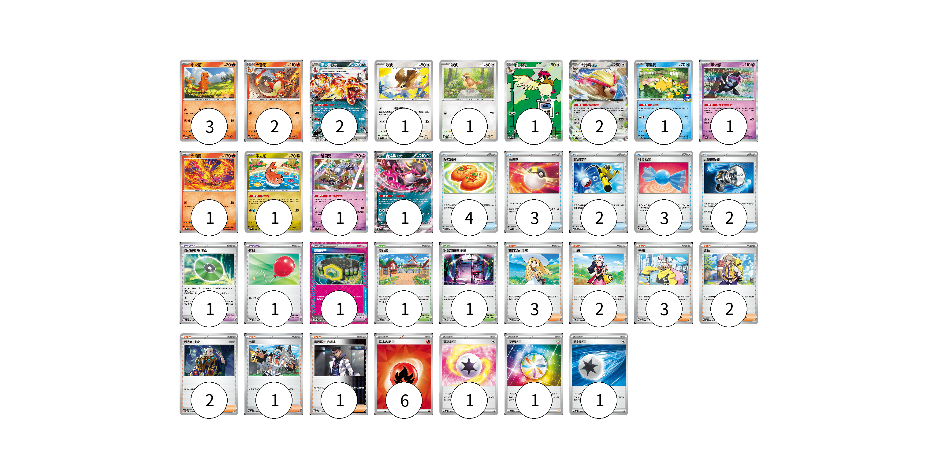 牌組構築方案 以此牌組為基礎新構築牌組 顯示卡面 顯示列表 寶可夢卡(18) 3 2 2 1 1 1 2 1 1 1 1 1 1 寶可夢道具(2) 1 1 物品卡(15) 4 3 2 3 2 1 支援者卡(14) 3 2 3 2 2 1 1 競技場卡(2) 1 1 能量卡(9) 6 1 1 1 寶可夢卡(18) 卡牌名稱 張數 卡牌名稱 張數 小火龍 SV4a 025/190 03 火恐龍 M2 012/080 02 噴火龍ex SV3 066/108 02 波波 SV2a 016/165 01 波波 SV3 087/108 01 比比鳥 SV3 119/108 01 大比鳥ex SV3 089/108 02 可達鴨 SV-P 220/SV-P 01 願增猿 SV8a 075/187 01 火焰鳥 M2 014/080 01 米立龍 SV8a 121/187 01 鑰圈兒 SV1V 045/078 01 吉雉雞ex SV6a 038/064 01 寶可夢道具(2) 卡牌名稱 張數 卡牌名稱 張數 招式學習器 演進 SV4M 063/066 01 極限腰帶 SV8a 159/187 01 物品卡(15) 卡牌名稱 張數 卡牌名稱 張數 好友寶芬 SVTG 011/019 04 高級球 SVM 134/175 03 厲害釣竿 SVOD 010/020 02 神奇糖果 SV3a 053/062 03 反擊捕捉器 SVTS 009/022 02 氣球 MBD 018/022 01 支援者卡(14) 卡牌名稱 張數 卡牌名稱 張數 莉莉艾的決意 M1L 062/063 03 小光 M2 077/080 02 奇樹 SVOD 016/020 03 派帕 SVOD 018/020 02 老大的指令 SVOD 019/020 02 枇琶 SV5K 068/071 01 弗圖博士的劇本 SV8a 175/187 01 競技場卡(2) 卡牌名稱 張數 卡牌名稱 張數 深缽鎮 SVK 039/042 01 對戰圓形競技場 M2 079/080 01 能量卡(9) 卡牌名稱 張數 卡牌名稱 張數 基本【火】能量 SVM FIR 06 薄霧能量 SV8a 186/187 01 夜光能量 SVK 042/042 01 噴射能量 SV8a 185/187 01 以此牌組為基礎新構築牌組 牌組編碼 VQrpqm-DHrCDa-RBhhkc copy 列印牌組單 牌組編碼已複製 分享至SNS