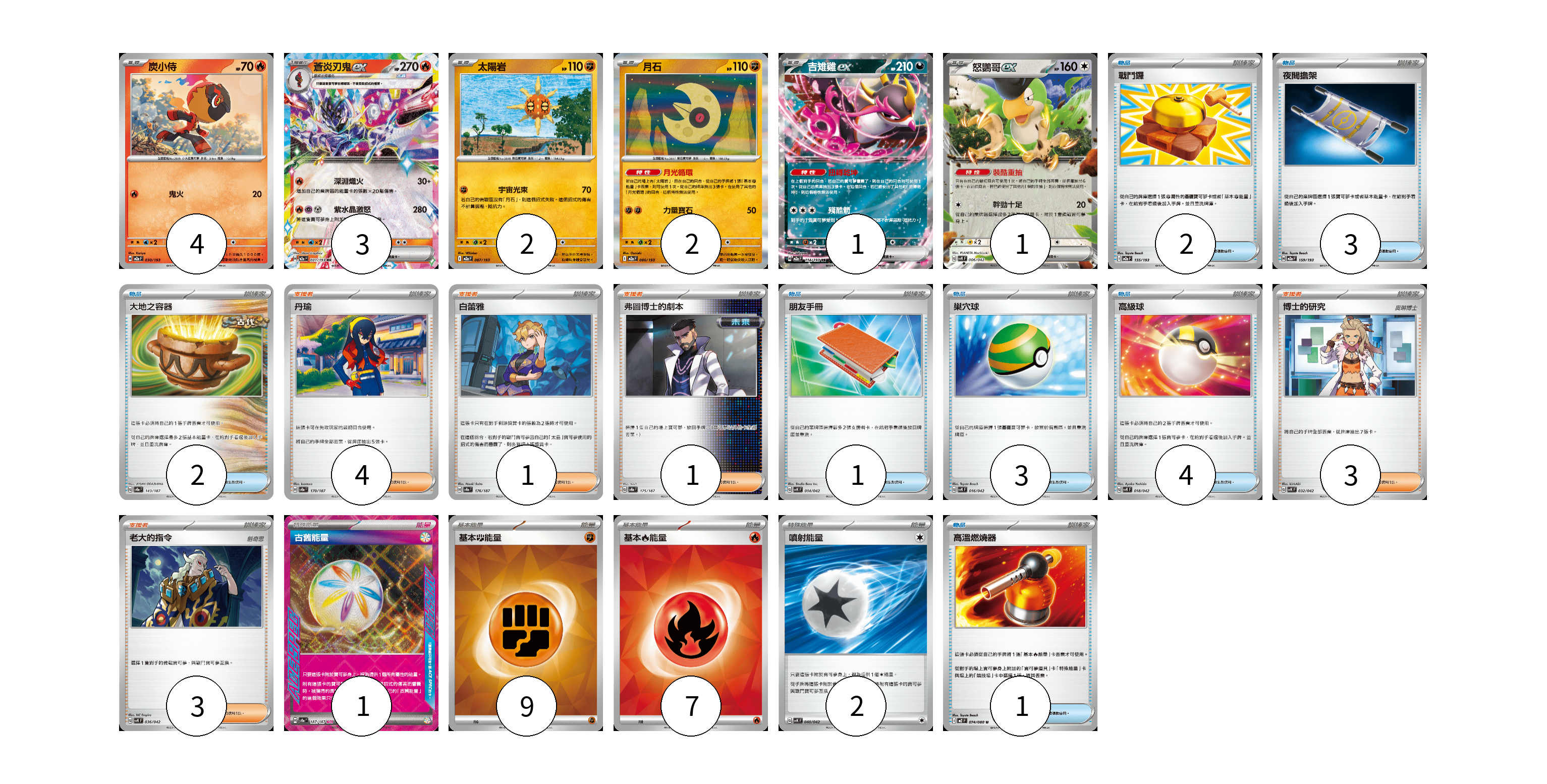 牌組構築方案 以此牌組為基礎新構築牌組 顯示卡面 顯示列表 寶可夢卡(13) 4 3 2 2 1 1 物品卡(16) 2 3 2 1 3 4 1 支援者卡(12) 4 1 1 3 3 能量卡(19) 1 9 7 2 寶可夢卡(13) 卡牌名稱 張數 卡牌名稱 張數 炭小侍 M2a 030/193 04 蒼炎刃鬼ex M2a 031/193 03 太陽岩 M2a 087/193 02 月石 M2a 086/193 02 吉雉雞ex M2a 114/193 01 怒鸚哥ex SVK 006/042 01 物品卡(16) 卡牌名稱 張數 卡牌名稱 張數 戰鬥鑼 M2a 155/193 02 夜間擔架 M2a 159/193 03 大地之容器 SV8a 143/187 02 朋友手冊 SVK 014/042 01 巢穴球 SVK 016/042 03 高級球 SVK 018/042 04 高溫燃燒器 M2 074/080 01 支援者卡(12) 卡牌名稱 張數 卡牌名稱 張數 丹瑜 SV8a 170/187 04 白蕾雅 SV8a 176/187 01 弗圖博士的劇本 SV8a 175/187 01 博士的研究 SVK 032/042 03 老大的指令 SVK 036/042 03 能量卡(19) 卡牌名稱 張數 卡牌名稱 張數 古舊能量 SV8a 187/187 01 基本【鬥】能量 SVK FIG 09 基本【火】能量 SVK FIR 07 噴射能量 SVK 040/042 02 以此牌組為基礎新構築牌組 牌組編碼 VSFfua-JCIjOv-PErRyp copy 列印牌組單 牌組編碼已複製 分享至SNS