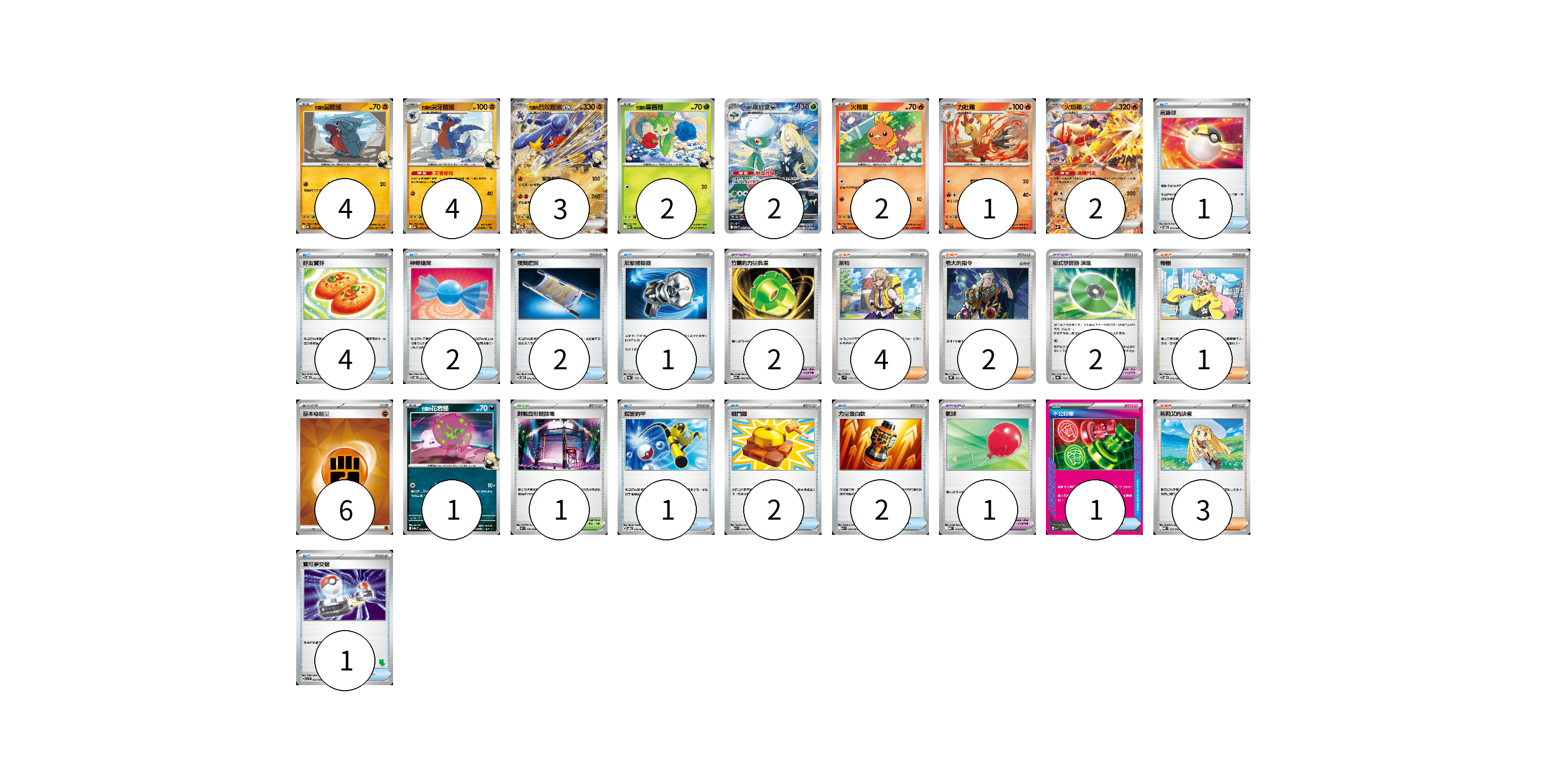 牌組構築方案 以此牌組為基礎新構築牌組 顯示卡面 顯示列表 寶可夢卡(21) 4 4 3 2 2 2 1 2 1 寶可夢道具(4) 2 2 物品卡(18) 1 4 2 2 1 1 2 2 1 1 1 支援者卡(10) 4 2 1 3 競技場卡(1) 1 能量卡(6) 6 寶可夢卡(21) 卡牌名稱 張數 卡牌名稱 張數 <竹蘭的>圓陸鯊 SV9a 042/063 04 <竹蘭的>尖牙陸鯊 SV9a 043/063 04 <竹蘭的>烈咬陸鯊ex SV9a 044/063 03 <竹蘭的>毒薔薇 SV9a 004/063 02 <竹蘭的>羅絲雷朵 SV9a 065/063 02 火稚雞 SV10 018/098 02 力壯雞 SV10 019/098 01 火焰雞ex SVM 016/175 02 <竹蘭的>花岩怪 SV9a 050/063 01 寶可夢道具(4) 卡牌名稱 張數 卡牌名稱 張數 竹蘭的力量負重 SV9a 060/063 02 招式學習器 演進 SV8a 160/187 02 物品卡(18) 卡牌名稱 張數 卡牌名稱 張數 高級球 SVOD 012/020 01 好友寶芬 SVOD 011/020 04 神奇糖果 SVOD 013/020 02 夜間擔架 SVOM 016/021 02 反擊捕捉器 SV8a 139/187 01 厲害釣竿 SVOD 010/020 01 戰鬥鑼 M1L 059/063 02 力量蛋白飲 M1L 058/063 02 氣球 MBD 018/022 01 不公印章 MBD 011/022 01 寶可夢交替 SVI 054/066 01 支援者卡(10) 卡牌名稱 張數 卡牌名稱 張數 派帕 SV1V 076/078 04 老大的指令 SVHK 022/022 02 奇樹 SVOD 016/020 01 莉莉艾的決意 MBD 021/022 03 競技場卡(1) 卡牌名稱 張數 卡牌名稱 張數 對戰圓形競技場 M2 079/080 01 能量卡(6) 卡牌名稱 張數 卡牌名稱 張數 基本【鬥】能量 SVK FIG 06 以此牌組為基礎新構築牌組 牌組編碼 VUonDf-oNrici-jgGSqS copy 列印牌組單 牌組編碼已複製 分享至SNS