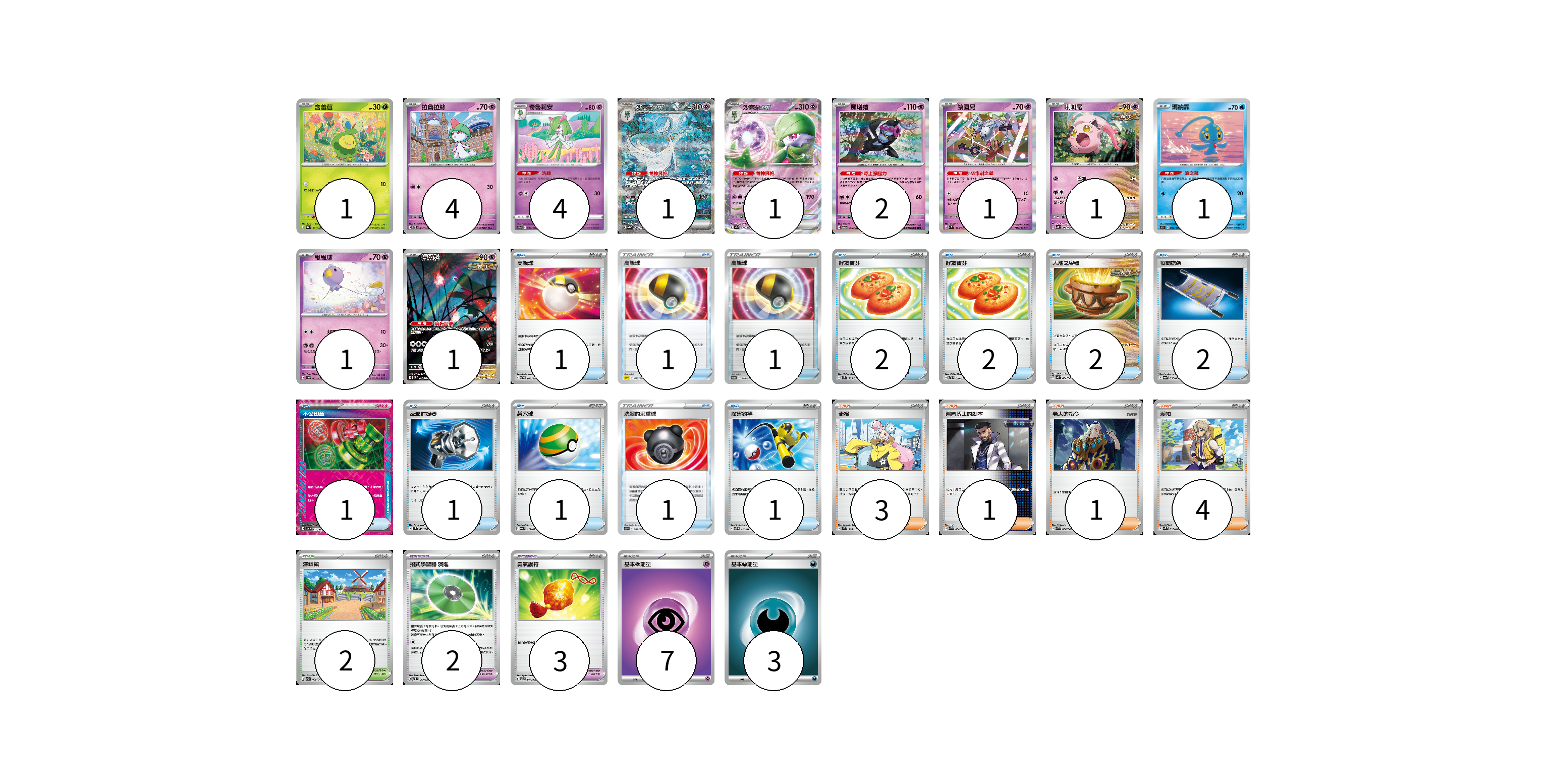 牌組構築方案 以此牌組為基礎新構築牌組 顯示卡面 顯示列表 寶可夢卡(18) 1 4 4 1 1 2 1 1 1 1 1 寶可夢道具(5) 2 3 物品卡(16) 1 1 1 2 2 2 2 1 1 1 1 1 支援者卡(9) 3 1 1 4 競技場卡(2) 2 能量卡(10) 7 3 寶可夢卡(18) 卡牌名稱 張數 卡牌名稱 張數 含羞苞 SV8a 001/187 01 拉魯拉絲 SVTS 002/022 04 奇魯莉安 S11a 037/068 04 沙奈朵ex SV4a 348/190 01 沙奈朵ex SV1S 028/078 01 願增猿 SV6 055/101 02 鑰圈兒 SV1V 045/078 01 吼叫尾 SV4K 032/066 01 瑪納霏 S9 031/100 01 飄飄球 SVD 052/139 01 振翼髮 SV5K 076/071 01 寶可夢道具(5) 卡牌名稱 張數 卡牌名稱 張數 招式學習器 演進 SVTL 017/021 02 勇氣護符 SVTS 017/022 03 物品卡(16) 卡牌名稱 張數 卡牌名稱 張數 高級球 SVTG 013/019 01 高級球 SDP 015/022 01 高級球 S-P 148/S-P 01 好友寶芬 SV5K 063/071 02 好友寶芬 SVTL 010/021 02 大地之容器 SV4K 060/066 02 夜間擔架 SV6a 056/064 02 不公印章 SV5a 053/066 01 反擊捕捉器 SV4M 059/066 01 巢穴球 SVAL 012/021 01 洗翠的沉重球 S10P 062/067 01 厲害釣竿 SVTS 010/022 01 支援者卡(9) 卡牌名稱 張數 卡牌名稱 張數 奇樹 SVM 160/175 03 弗圖博士的劇本 SVK 034/042 01 老大的指令 SVK 036/042 01 派帕 SVK 035/042 04 競技場卡(2) 卡牌名稱 張數 卡牌名稱 張數 深缽鎮 SVK 039/042 02 能量卡(10) 卡牌名稱 張數 卡牌名稱 張數 基本超能量 sv-p PSY 07 基本惡能量 sv-p DAR 03 以此牌組為基礎新構築牌組 牌組編碼 VWjerG-LVeOXl-SPQObv copy 列印牌組單 牌組編碼已複製 分享至SNS