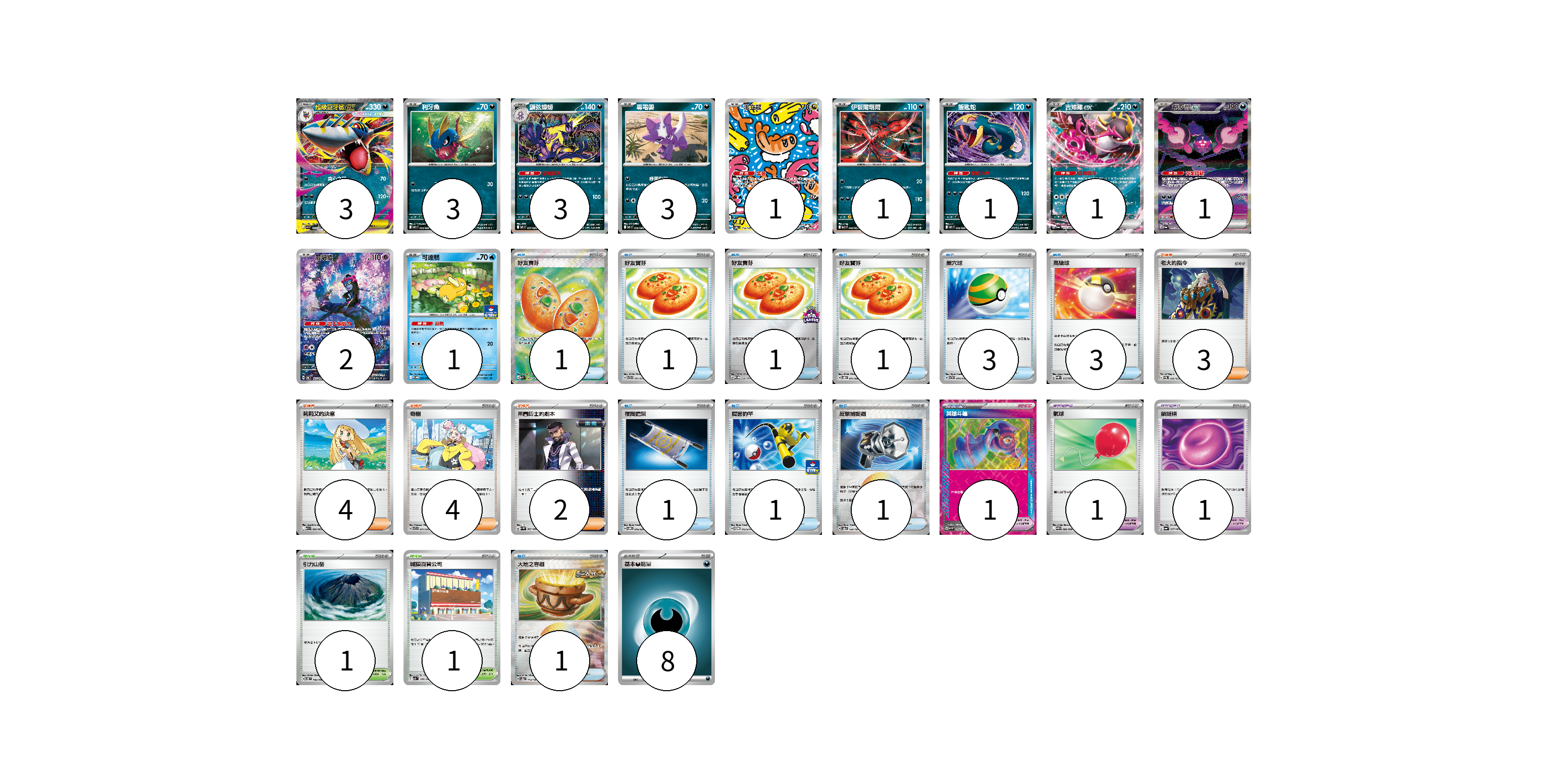 牌組構築方案 以此牌組為基礎新構築牌組 顯示卡面 顯示列表 寶可夢卡(20) 3 3 3 3 1 1 1 1 1 2 1 寶可夢道具(3) 1 1 1 物品卡(14) 1 1 1 1 3 3 1 1 1 1 支援者卡(13) 3 4 4 2 競技場卡(2) 1 1 能量卡(8) 8 寶可夢卡(20) 卡牌名稱 張數 卡牌名稱 張數 超級巨牙鯊ex M2 051/080 03 利牙魚 M2 050/080 03 顫弦蠑螈 M2 057/080 03 毒電嬰 M2 056/080 03 米立龍 SV6 112/101 01 伊裴爾塔爾 M1L 040/063 01 飯匙蛇 M2 052/080 01 吉雉雞ex SV6a 038/064 01 桃歹郎ex SV6a 090/064 01 願增猿 SV6 107/101 02 可達鴨 SV-P 220/SV-P 01 寶可夢道具(3) 卡牌名稱 張數 卡牌名稱 張數 英雄斗篷 SV5M 064/071 01 氣球 SV11B 082/086 01 鎖鏈糬 SV6a 057/064 01 物品卡(14) 卡牌名稱 張數 卡牌名稱 張數 好友寶芬 M1S 081/063 01 好友寶芬 SVTG 011/019 01 好友寶芬 SV-P 230/SV-P 01 好友寶芬 SVOD 011/020 01 巢穴球 SVTH 010/018 03 高級球 SVQP 015/023 03 夜間擔架 SVOM 016/021 01 厲害釣竿 SV-P 112/SV-P 01 反擊捕捉器 SV8a 139/187 01 大地之容器 SV8a 143/187 01 支援者卡(13) 卡牌名稱 張數 卡牌名稱 張數 老大的指令 SVEM 020/020 03 莉莉艾的決意 M1L 062/063 04 奇樹 SVTR 017/021 04 弗圖博士的劇本 SV4M 065/066 02 競技場卡(2) 卡牌名稱 張數 卡牌名稱 張數 引力山岳 SV8 106/106 01 城鎮百貨公司 SV3 107/108 01 能量卡(8) 卡牌名稱 張數 卡牌名稱 張數 基本【惡】能量 SVF DAR 08 以此牌組為基礎新構築牌組 牌組編碼 VZtLSO-kzhaSl-lXYGSn copy 列印牌組單 牌組編碼已複製 分享至SNS