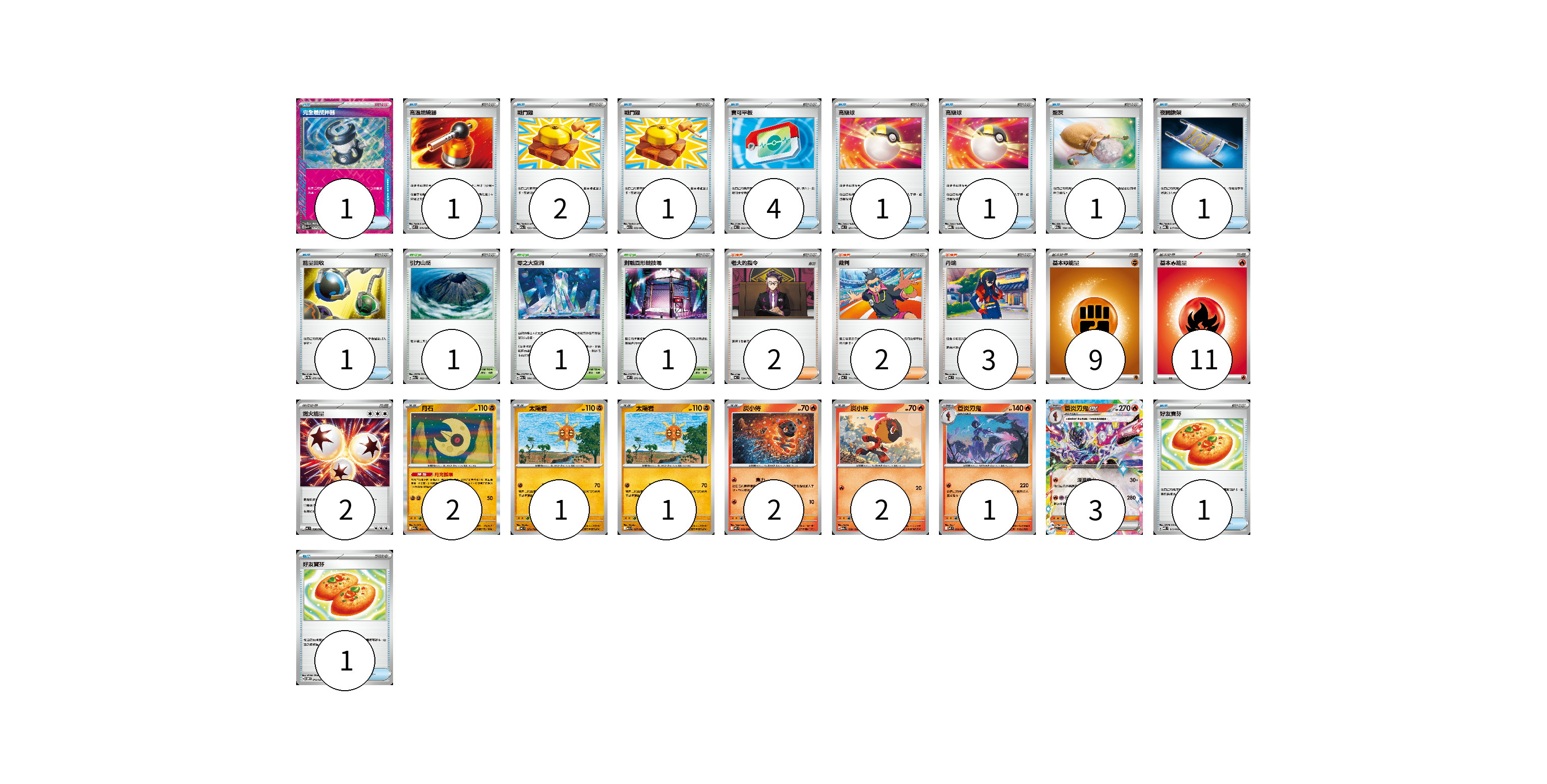 牌組構築方案 以此牌組為基礎新構築牌組 顯示卡面 顯示列表 寶可夢卡(12) 2 1 1 2 2 1 3 物品卡(16) 1 1 2 1 4 1 1 1 1 1 1 1 支援者卡(7) 2 2 3 競技場卡(3) 1 1 1 能量卡(22) 9 11 2 寶可夢卡(12) 卡牌名稱 張數 卡牌名稱 張數 月石 M2a 086/193 02 太陽岩 MC 372/742 01 太陽岩 M1L 027/063 01 炭小侍 M2 019/080 02 炭小侍 M2a 030/193 02 蒼炎刃鬼 M2 020/080 01 蒼炎刃鬼ex M2a 031/193 03 物品卡(16) 卡牌名稱 張數 卡牌名稱 張數 完全體攪拌器 SVK 017/042 01 高溫燃燒器 M2 074/080 01 戰鬥鑼 M2a 155/193 02 戰鬥鑼 M1L 059/063 01 寶可平板 MC 662/742 04 高級球 MC 651/742 01 高級球 MBG 012/022 01 聖灰 M2a 150/193 01 夜間擔架 MBG 017/022 01 能量回收 SV11W 079/086 01 好友寶芬 MBD 013/022 01 好友寶芬 SVOM 012/021 01 支援者卡(7) 卡牌名稱 張數 卡牌名稱 張數 老大的指令 MC 724/742 02 裁判 MC 711/742 02 丹瑜 MC 715/742 03 競技場卡(3) 卡牌名稱 張數 卡牌名稱 張數 引力山岳 M2a 183/193 01 零之大空洞 M2a 184/193 01 對戰圓形競技場 M2 079/080 01 能量卡(22) 卡牌名稱 張數 卡牌名稱 張數 基本【鬥】能量 MC FIG 09 基本【火】能量 MC FIR 11 燃火能量 MC 736/742 02 以此牌組為基礎新構築牌組 牌組編碼 VatVGU-shYQbU-NrqpxN copy 列印牌組單 牌組編碼已複製 分享至SNS