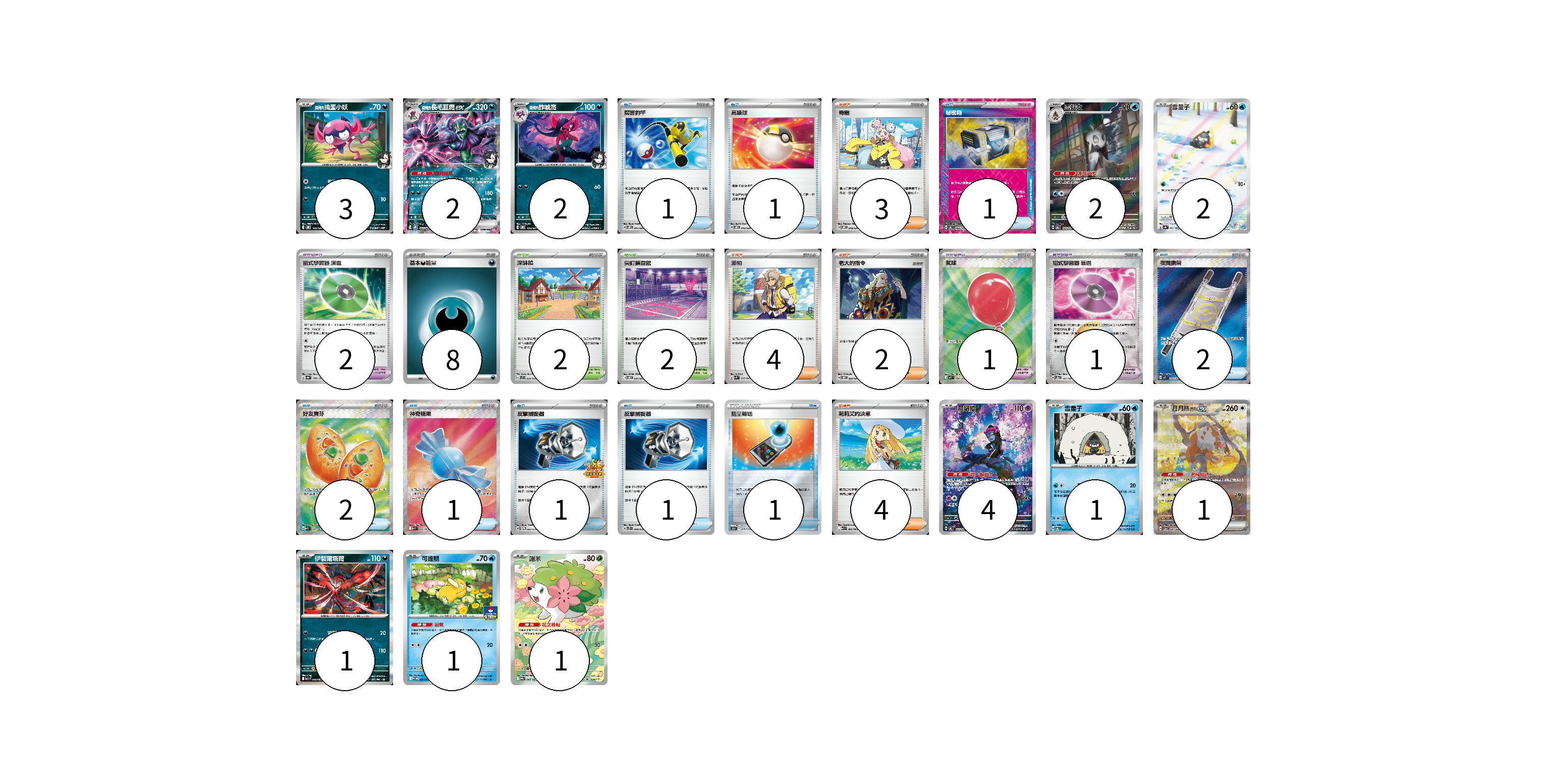 牌組構築方案 以此牌組為基礎新構築牌組 顯示卡面 顯示列表 寶可夢卡(20) 3 2 2 2 2 4 1 1 1 1 1 寶可夢道具(4) 2 1 1 物品卡(11) 1 1 1 2 2 1 1 1 1 支援者卡(13) 3 4 2 4 競技場卡(4) 2 2 能量卡(8) 8 寶可夢卡(20) 卡牌名稱 張數 卡牌名稱 張數 <瑪俐的>搗蛋小妖 SVOM 005/021 03 <瑪俐的>長毛巨魔ex SVOM 007/021 02 <瑪俐的>詐唬魔 SVOM 006/021 02 雪妖女 SV6 104/101 02 雪童子 SV3a 063/062 02 願增猿 SV6 107/101 04 雪童子 SV6 031/101 01 月月熊 赫月 ex SV5a 091/066 01 伊裴爾塔爾 M1L 040/063 01 可達鴨 SV-P 220/SV-P 01 謝米 SV9a 066/063 01 寶可夢道具(4) 卡牌名稱 張數 卡牌名稱 張數 招式學習器 演進 SV8a 160/187 02 氣球 M1L 084/063 01 招式學習器 衰退 SV8a 161/187 01 物品卡(11) 卡牌名稱 張數 卡牌名稱 張數 厲害釣竿 SVOM 011/021 01 高級球 SVOM 013/021 01 秘密箱 SV6 092/101 01 夜間擔架 M1L 083/063 02 好友寶芬 M1S 081/063 02 神奇糖果 M1S 082/063 01 反擊捕捉器 SV-P 083/SV-P 01 反擊捕捉器 SVTS 009/022 01 能量輸送 SO 018/030 01 支援者卡(13) 卡牌名稱 張數 卡牌名稱 張數 奇樹 SVOM 018/021 03 派帕 SVK 035/042 04 老大的指令 SVOM 020/021 02 莉莉艾的決意 M1L 062/063 04 競技場卡(4) 卡牌名稱 張數 卡牌名稱 張數 深缽鎮 SVF 036/038 02 尖釘鎮道館 SVOM 021/021 02 能量卡(8) 卡牌名稱 張數 卡牌名稱 張數 基本【惡】能量 SVF DAR 08 以此牌組為基礎新構築牌組 牌組編碼 VbqPxC-fQnBmm-eWjWOo copy 列印牌組單 牌組編碼已複製 分享至SNS