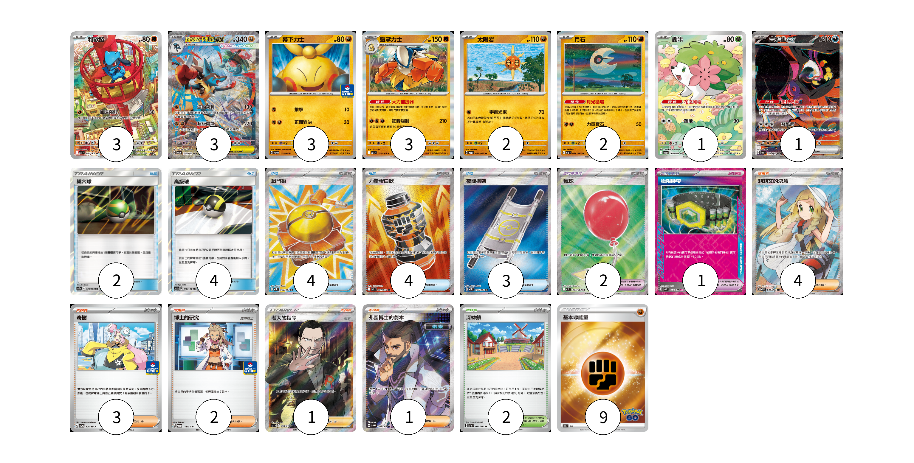 牌組構築方案 以此牌組為基礎新構築牌組 顯示卡面 顯示列表 寶可夢卡(18) 3 3 3 3 2 2 1 1 寶可夢道具(3) 2 1 物品卡(17) 2 4 4 4 3 支援者卡(11) 4 3 2 1 1 競技場卡(2) 2 能量卡(9) 9 寶可夢卡(18) 卡牌名稱 張數 卡牌名稱 張數 利歐路 M1L 068/063 03 超級路卡利歐ex M1L 088/063 03 幕下力士 M-P 015/M-P 03 鐵掌力士 M1L 025/063 03 太陽岩 M1L 027/063 02 月石 M1L 026/063 02 謝米 SV9a 066/063 01 吉雉雞ex SV6a 089/064 01 寶可夢道具(3) 卡牌名稱 張數 卡牌名稱 張數 氣球 M1L 084/063 02 極限腰帶 SV5K 066/071 01 物品卡(17) 卡牌名稱 張數 卡牌名稱 張數 巢穴球 AS5a 178/184 02 高級球 AS5b 178/186 04 戰鬥鑼 M1L 082/063 04 力量蛋白飲 M1L 081/063 04 夜間擔架 M1L 083/063 03 支援者卡(11) 卡牌名稱 張數 卡牌名稱 張數 莉莉艾的決意 M1L 086/063 04 奇樹 SV-P 106/SV-P 03 博士的研究 SV-P 113/SV-P 02 老大的指令(坂木) SC1b 170/153 01 弗圖博士的劇本 SV4M 086/066 01 競技場卡(2) 卡牌名稱 張數 卡牌名稱 張數 深缽鎮 SV1a 070/073 02 能量卡(9) 卡牌名稱 張數 卡牌名稱 張數 基本鬥能量 S10b FIG 09 以此牌組為基礎新構築牌組 牌組編碼 VitzSP-FsAcDN-CnqOgd copy 列印牌組單 牌組編碼已複製 分享至SNS