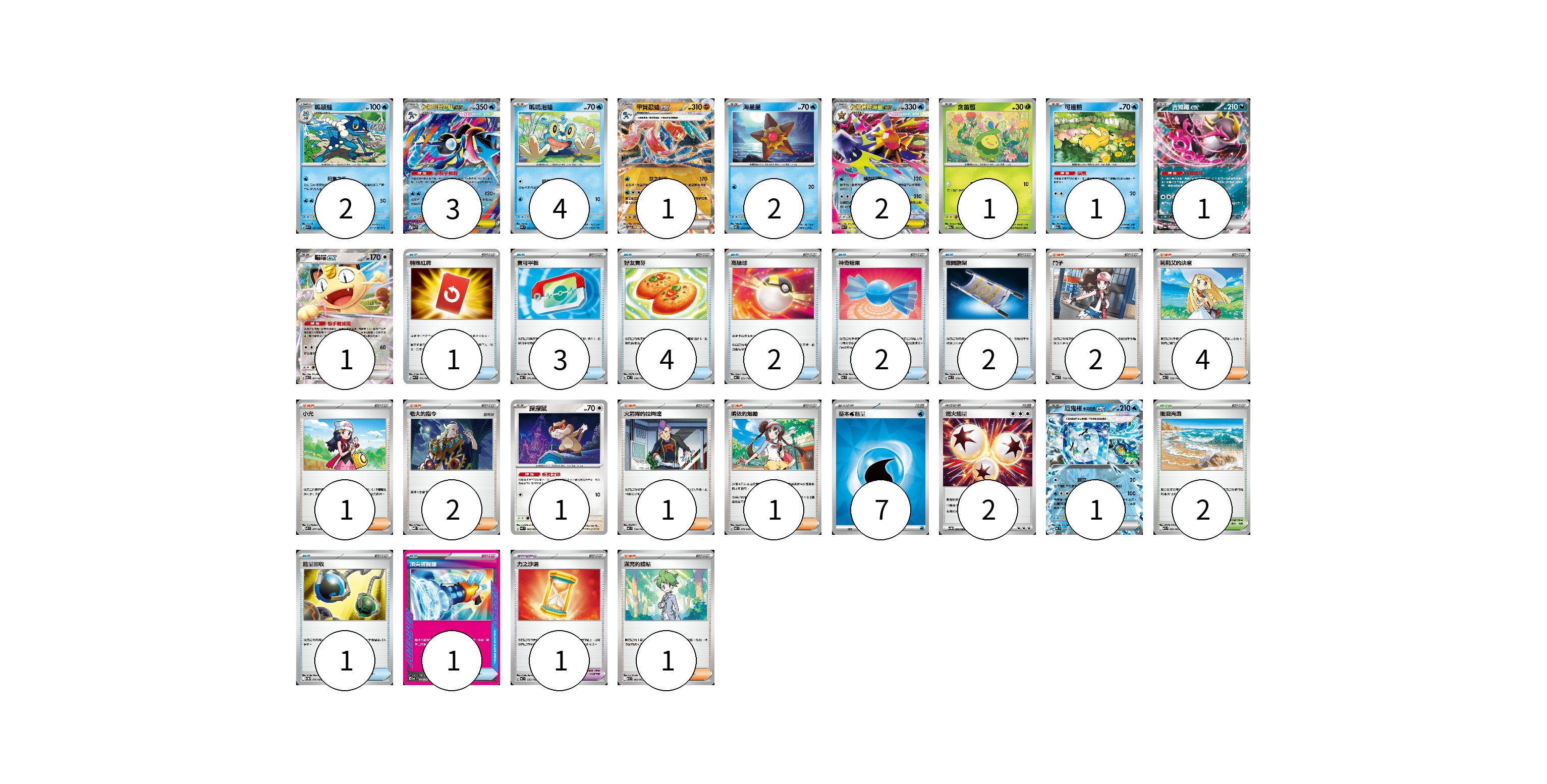 牌組構築方案 以此牌組為基礎新構築牌組 顯示卡面 顯示列表 寶可夢卡(20) 2 3 4 1 2 2 1 1 1 1 1 1 寶可夢道具(1) 1 物品卡(16) 1 3 4 2 2 2 1 1 支援者卡(12) 2 4 1 2 1 1 1 競技場卡(2) 2 能量卡(9) 7 2 寶可夢卡(20) 卡牌名稱 張數 卡牌名稱 張數 呱頭蛙 M4 021/083 02 超級甲賀忍蛙ex M4 022/083 03 呱呱泡蛙 M4 020/083 04 甲賀忍蛙ex SV5a 045/066 01 海星星 M3 020/080 02 超級寶石海星ex M3 021/080 02 含羞苞 M2a 011/193 01 可達鴨 M2a 032/193 01 吉雉雞ex SV6a 038/064 01 喵喵ex M3 061/080 01 探探鼠 M4 068/083 01 厄鬼椪 水井面具ex MC 224/742 01 寶可夢道具(1) 卡牌名稱 張數 卡牌名稱 張數 力之沙漏 MC 683/742 01 物品卡(16) 卡牌名稱 張數 卡牌名稱 張數 特殊紅牌 M4 072/083 01 寶可平板 M3 070/080 03 好友寶芬 MC 648/742 04 高級球 MC 651/742 02 神奇糖果 MC 655/742 02 夜間擔架 MC 670/742 02 能量回收 SV11W 079/086 01 頂尖捕捉器 MC 656/742 01 支援者卡(12) 卡牌名稱 張數 卡牌名稱 張數 鬥子 MC 718/742 02 莉莉艾的決意 MC 729/742 04 小光 M2 077/080 01 老大的指令 MBD 020/022 02 火箭隊的拉姆達 MC 734/742 01 鳴依的勉勵 M3 075/080 01 滿充的體貼 M1S 060/063 01 競技場卡(2) 卡牌名稱 張數 卡牌名稱 張數 衝浪海灘 M1S 062/063 02 能量卡(9) 卡牌名稱 張數 卡牌名稱 張數 基本【水】能量 SVM WAT 07 燃火能量 SV11W 086/086 02 以此牌組為基礎新構築牌組 牌組編碼 VkGpsZ-iYuXJU-qaYuNm copy 列印牌組單 牌組編碼已複製 分享至SNS