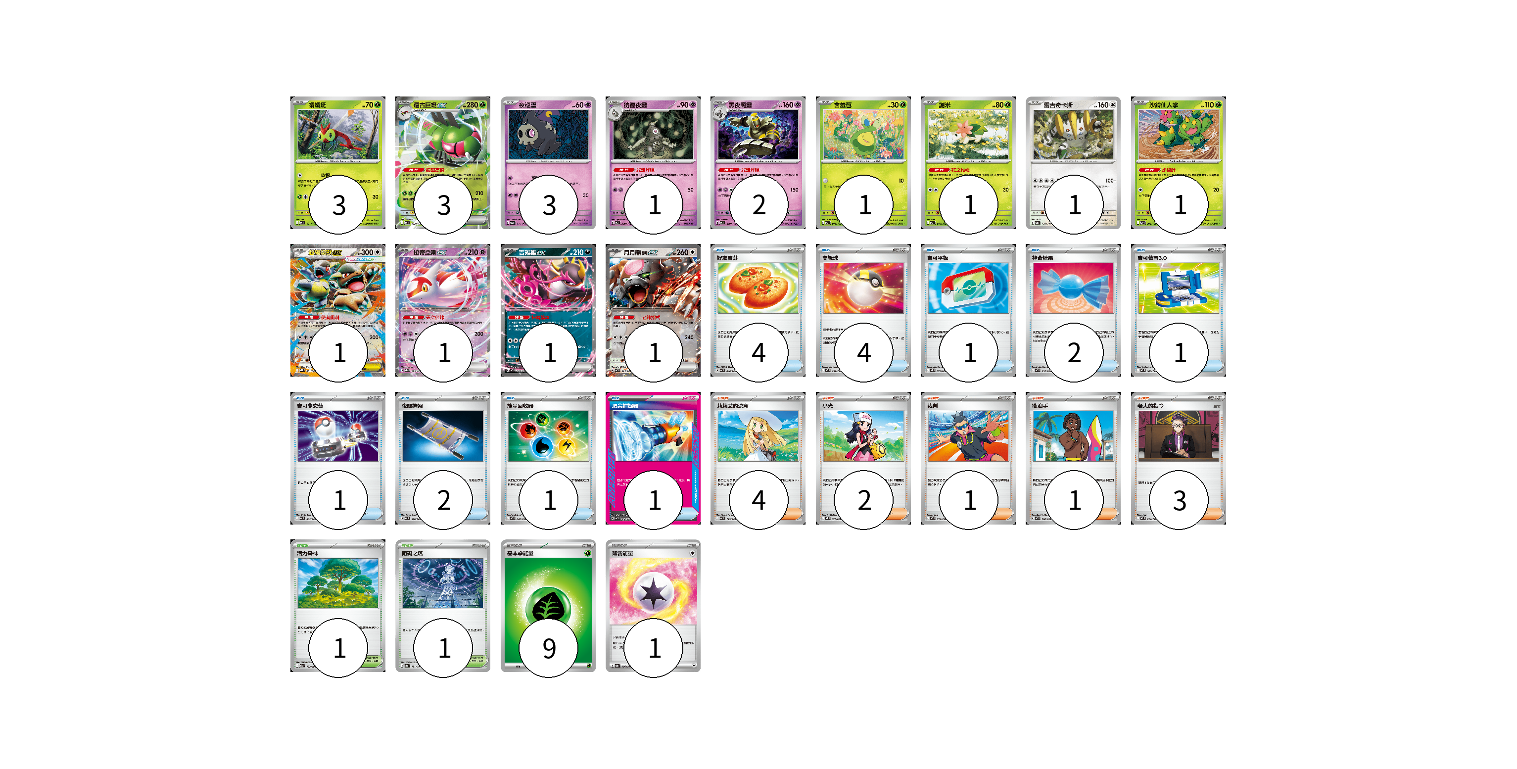牌組構築方案 以此牌組為基礎新構築牌組 顯示卡面 顯示列表 寶可夢卡(20) 3 3 3 1 2 1 1 1 1 1 1 1 1 物品卡(17) 4 4 1 2 1 1 2 1 1 支援者卡(11) 4 2 1 1 3 競技場卡(2) 1 1 能量卡(10) 9 1 寶可夢卡(20) 卡牌名稱 張數 卡牌名稱 張數 蜻蜻蜓 MC 021/742 03 遠古巨蜓ex MC 022/742 03 夜巡靈 SV6a 018/064 03 彷徨夜靈 MC 309/742 01 黑夜魔靈 MC 310/742 02 含羞苞 M2a 011/193 01 謝米 M2a 012/193 01 雷吉奇卡斯 SV8a 132/187 01 沙鈴仙人掌 SV9 006/100 01 超級袋獸ex M1S 051/063 01 拉帝亞斯ex M2a 075/193 01 吉雉雞ex MC 489/742 01 月月熊 赫月 ex MC 625/742 01 物品卡(17) 卡牌名稱 張數 卡牌名稱 張數 好友寶芬 MC 648/742 04 高級球 MC 651/742 04 寶可平板 M3 070/080 01 神奇糖果 MC 655/742 02 寶可裝置3.0 MC 660/742 01 寶可夢交替 MC 663/742 01 夜間擔架 MC 670/742 02 能量回收器 MC 640/742 01 頂尖捕捉器 MC 656/742 01 支援者卡(11) 卡牌名稱 張數 卡牌名稱 張數 莉莉艾的決意 MC 729/742 04 小光 M2 077/080 02 裁判 MC 711/742 01 衝浪手 MC 708/742 01 老大的指令 MC 724/742 03 競技場卡(2) 卡牌名稱 張數 卡牌名稱 張數 活力森林 M2a 182/193 01 阻礙之塔 SV8a 181/187 01 能量卡(10) 卡牌名稱 張數 卡牌名稱 張數 基本【草】能量 MJ GRA 09 薄霧能量 SV8a 186/187 01 以此牌組為基礎新構築牌組 牌組編碼 VkxGks-ZTcQyX-HBwMSU copy 列印牌組單 牌組編碼已複製 分享至SNS