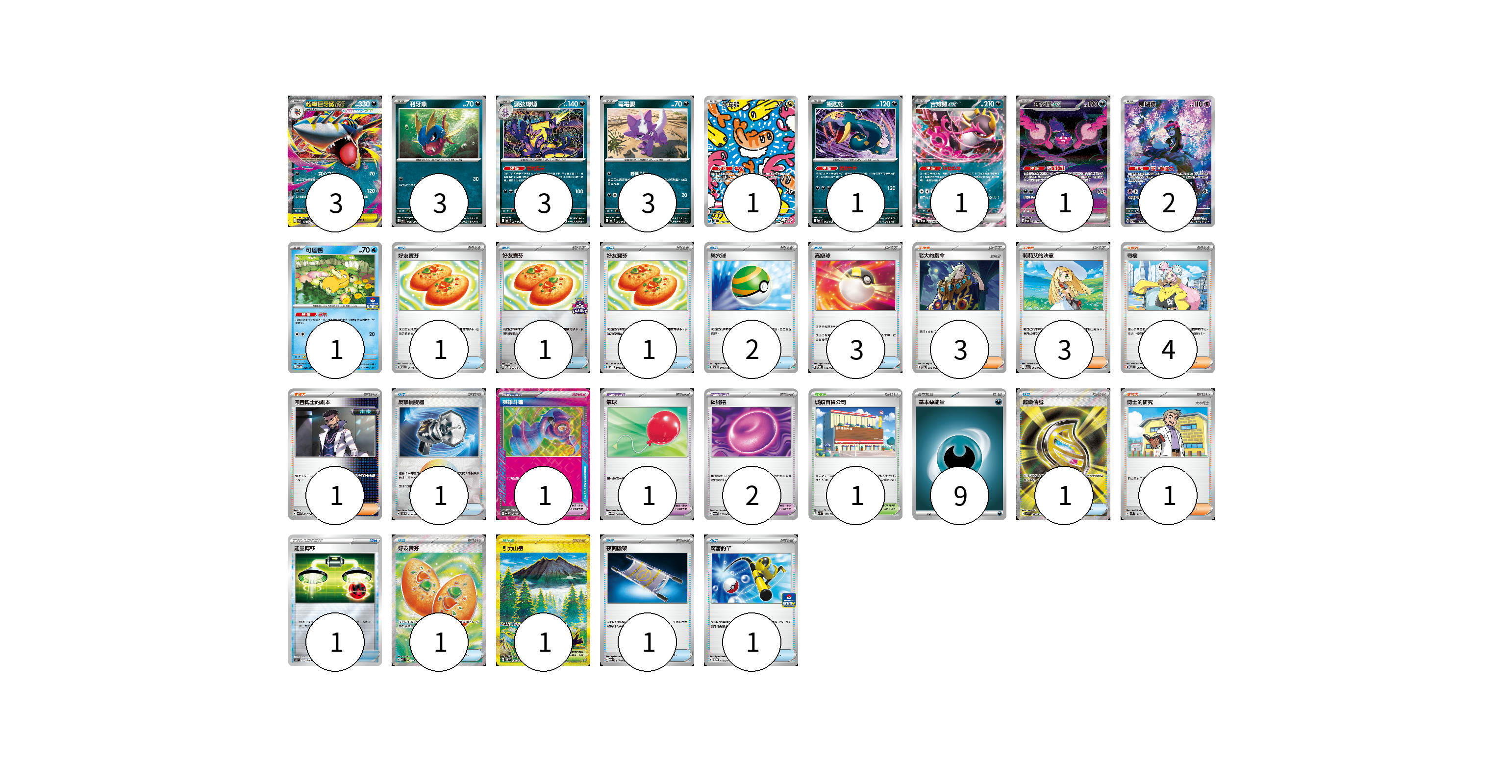 牌組構築方案 以此牌組為基礎新構築牌組 顯示卡面 顯示列表 寶可夢卡(19) 3 3 3 3 1 1 1 1 2 1 寶可夢道具(4) 1 1 2 物品卡(14) 1 1 1 2 3 1 1 1 1 1 1 支援者卡(12) 3 3 4 1 1 競技場卡(2) 1 1 能量卡(9) 9 寶可夢卡(19) 卡牌名稱 張數 卡牌名稱 張數 超級巨牙鯊ex M2 051/080 03 利牙魚 M2 050/080 03 顫弦蠑螈 M2 057/080 03 毒電嬰 M2 056/080 03 米立龍 SV6 112/101 01 飯匙蛇 M2 052/080 01 吉雉雞ex SV6a 038/064 01 桃歹郎ex SV6a 090/064 01 願增猿 SV6 107/101 02 可達鴨 SV-P 220/SV-P 01 寶可夢道具(4) 卡牌名稱 張數 卡牌名稱 張數 英雄斗篷 SV5M 064/071 01 氣球 SV11B 082/086 01 鎖鏈糬 SV6a 057/064 02 物品卡(14) 卡牌名稱 張數 卡牌名稱 張數 好友寶芬 SVTG 011/019 01 好友寶芬 SV-P 230/SV-P 01 好友寶芬 SVOD 011/020 01 巢穴球 SVTH 010/018 02 高級球 SVQP 015/023 03 反擊捕捉器 SV8a 139/187 01 超級信號 M1S 083/063 01 能量轉移 SO 017/030 01 好友寶芬 M1S 081/063 01 夜間擔架 MBG 017/022 01 厲害釣竿 SV-P 112/SV-P 01 支援者卡(12) 卡牌名稱 張數 卡牌名稱 張數 老大的指令 SVEM 020/020 03 莉莉艾的決意 M1L 062/063 03 奇樹 SVTR 017/021 04 弗圖博士的劇本 SV4M 065/066 01 博士的研究 SVM 162/175 01 競技場卡(2) 卡牌名稱 張數 卡牌名稱 張數 城鎮百貨公司 SV3 107/108 01 引力山岳 SV8 138/106 01 能量卡(9) 卡牌名稱 張數 卡牌名稱 張數 基本【惡】能量 SVF DAR 09 以此牌組為基礎新構築牌組 牌組編碼 VlCiBk-wxkqCV-KRYhaZ copy 列印牌組單 牌組編碼已複製 分享至SNS