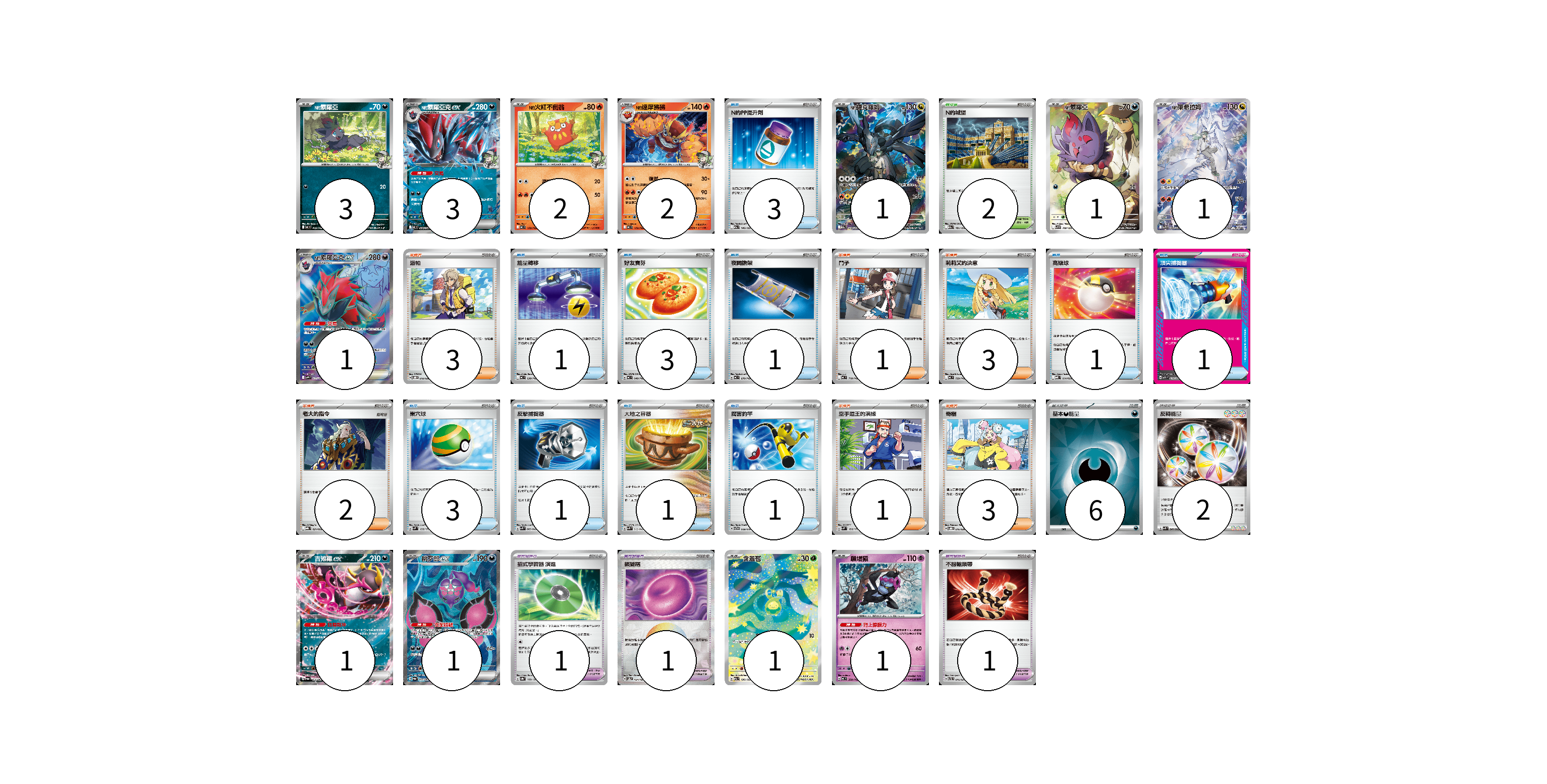 牌組構築方案 以此牌組為基礎新構築牌組 顯示卡面 顯示列表 寶可夢卡(18) 3 3 2 2 1 1 1 1 1 1 1 1 寶可夢道具(3) 1 1 1 物品卡(16) 3 1 3 1 1 1 3 1 1 1 支援者卡(13) 3 1 3 2 1 3 競技場卡(2) 2 能量卡(8) 6 2 寶可夢卡(18) 卡牌名稱 張數 卡牌名稱 張數 N的索羅亞 MC 469/742 03 N的索羅亞克ex MC 470/742 03 N的火紅不倒翁 MC 118/742 02 N的達摩狒狒 MC 119/742 02 N的捷克羅姆 M2a 210/193 01 N的索羅亞 SV9 108/100 01 N的萊希拉姆 SV9 109/100 01 N的索羅亞克ex SV9 117/100 01 吉雉雞ex SV6a 038/064 01 桃歹郎ex SV6a 082/064 01 含羞苞 M2a 196/193 01 願增猿 MC 358/742 01 寶可夢道具(3) 卡牌名稱 張數 卡牌名稱 張數 招式學習器 演進 SV8a 160/187 01 鎖鏈糬 SV8a 154/187 01 不服輸頭帶 SVTL 016/021 01 物品卡(16) 卡牌名稱 張數 卡牌名稱 張數 N的PP提升劑 M2a 146/193 03 能量轉移 MC 638/742 01 好友寶芬 MC 648/742 03 夜間擔架 MC 670/742 01 高級球 MBD 014/022 01 頂尖捕捉器 MBG 014/022 01 巢穴球 SVM 133/175 03 反擊捕捉器 SVK 009/042 01 大地之容器 SVK 012/042 01 厲害釣竿 SVTG 009/019 01 支援者卡(13) 卡牌名稱 張數 卡牌名稱 張數 派帕 SVOD 018/020 03 鬥子 MC 718/742 01 莉莉艾的決意 MC 729/742 03 老大的指令 MBG 021/022 02 空手道王的演練 SVM 150/175 01 奇樹 SVOD 016/020 03 競技場卡(2) 卡牌名稱 張數 卡牌名稱 張數 N的城堡 M2a 181/193 02 能量卡(8) 卡牌名稱 張數 卡牌名稱 張數 基本【惡】能量 SVM DAR 06 反轉能量 SVK 041/042 02 以此牌組為基礎新構築牌組 牌組編碼 VlXvdM-AXFXro-QRPTVS copy 列印牌組單 牌組編碼已複製 分享至SNS