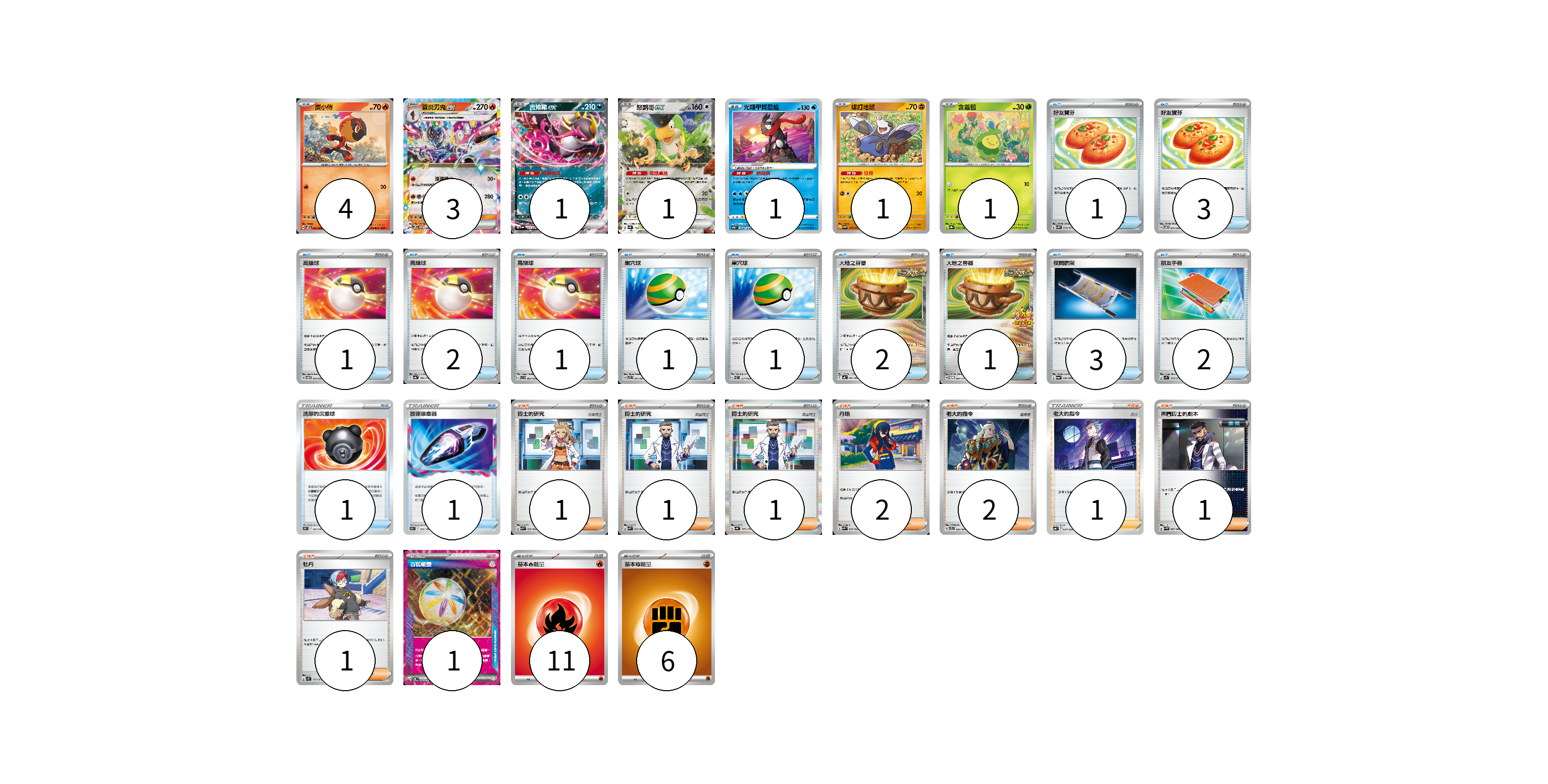 牌組構築方案 以此牌組為基礎新構築牌組 顯示卡面 顯示列表 寶可夢卡(12) 4 3 1 1 1 1 1 物品卡(20) 1 3 1 2 1 1 1 2 1 3 2 1 1 支援者卡(10) 1 1 1 2 2 1 1 1 能量卡(18) 1 11 6 寶可夢卡(12) 卡牌名稱 張數 卡牌名稱 張數 炭小侍 SVPS 005/008 04 蒼炎刃鬼ex SVPS 006/008 03 吉雉雞ex SV6a 038/064 01 怒鸚哥ex SV4a 154/190 01 光輝甲賀忍蛙 SVTS 001/022 01 螺釘地鼠 SV5M 039/071 01 含羞苞 SV8a 001/187 01 物品卡(20) 卡牌名稱 張數 卡牌名稱 張數 好友寶芬 SV5K 063/071 01 好友寶芬 SVTM 011/022 03 高級球 SVTM 012/022 01 高級球 SV4a 161/190 02 高級球 SVB 002/028 01 巢穴球 SVTL 011/021 01 巢穴球 SVEL 011/020 01 大地之容器 SV4K 060/066 02 大地之容器 SV-P 084/SV-P 01 夜間擔架 SV6a 056/064 03 朋友手冊 SV1S 069/078 02 洗翠的沉重球 S10P 062/067 01 放逐吸塵器 S11 093/100 01 支援者卡(10) 卡牌名稱 張數 卡牌名稱 張數 博士的研究 SVK 032/042 01 博士的研究 SVK 033/042 01 博士的研究 SV4a 177/190 01 丹瑜 SVK 030/042 02 老大的指令 SVTL 021/021 02 老大的指令(赤日) SVB 024/028 01 弗圖博士的劇本 SV4M 065/066 01 牡丹 SV1S 077/078 01 能量卡(18) 卡牌名稱 張數 卡牌名稱 張數 古舊能量 SV6 101/101 01 基本火能量 sv-p FIR 11 基本鬥能量 sv-p FIG 06 以此牌組為基礎新構築牌組 牌組編碼 VnHMyX-TCBzcK-FfuWmI copy 列印牌組單 牌組編碼已複製 分享至SNS