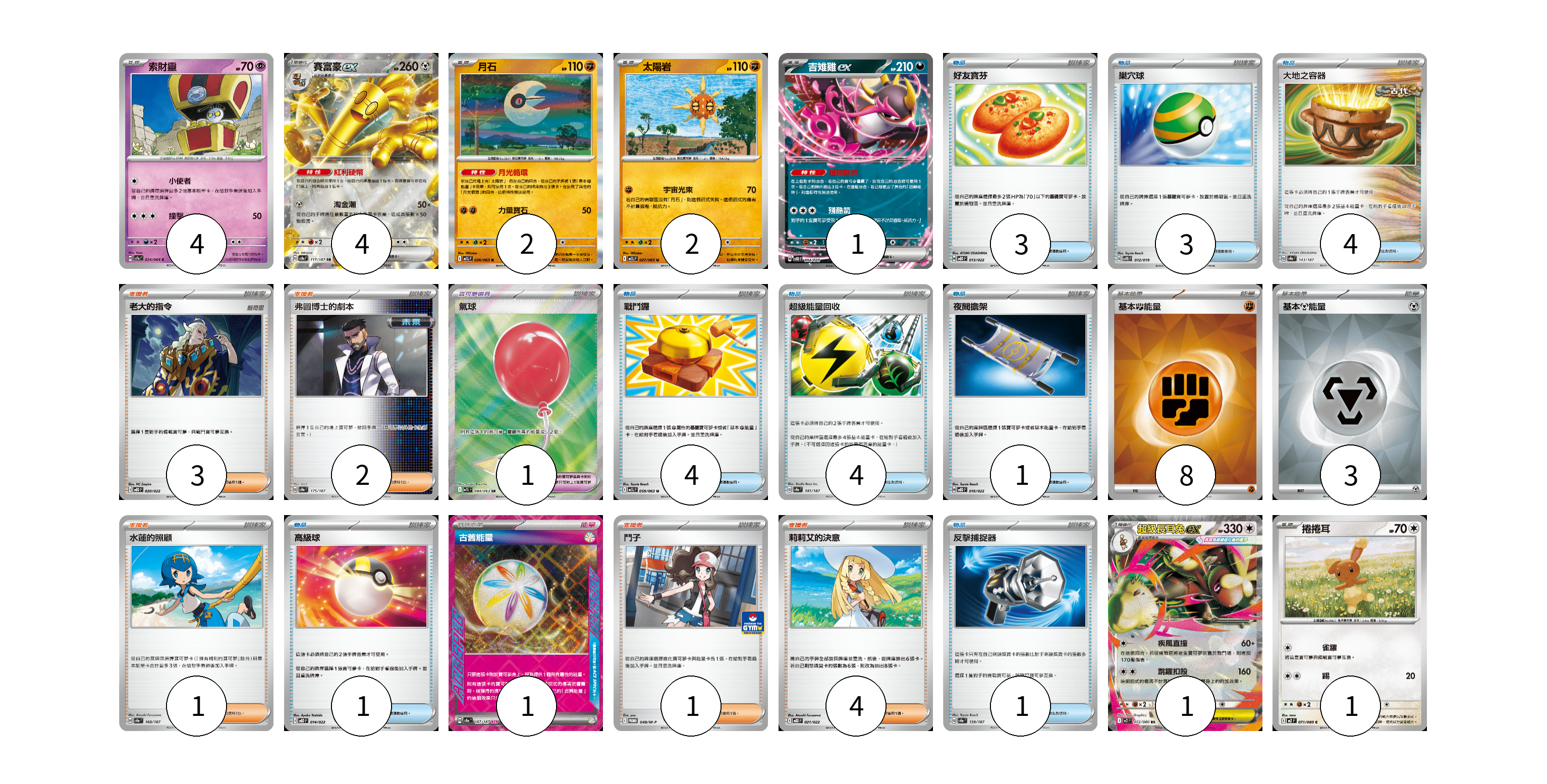 牌組構築方案 以此牌組為基礎新構築牌組 顯示卡面 顯示列表 寶可夢卡(15) 4 4 2 2 1 1 1 寶可夢道具(1) 1 物品卡(21) 3 3 4 4 4 1 1 1 支援者卡(11) 3 2 1 1 4 能量卡(12) 8 3 1 寶可夢卡(15) 卡牌名稱 張數 卡牌名稱 張數 索財靈 SV7a 024/064 04 賽富豪ex SV8a 117/187 04 月石 M1L 026/063 02 太陽岩 M1L 027/063 02 吉雉雞ex SVOD 004/020 01 超級長耳兔ex M2 072/080 01 捲捲耳 M2 071/080 01 寶可夢道具(1) 卡牌名稱 張數 卡牌名稱 張數 氣球 M1L 084/063 01 物品卡(21) 卡牌名稱 張數 卡牌名稱 張數 好友寶芬 MBD 013/022 03 巢穴球 SVTG 012/019 03 大地之容器 SV8a 143/187 04 戰鬥鑼 M1L 059/063 04 超級能量回收 SV8a 141/187 04 夜間擔架 MBD 016/022 01 高級球 MBD 014/022 01 反擊捕捉器 SV8a 139/187 01 支援者卡(11) 卡牌名稱 張數 卡牌名稱 張數 老大的指令 MBD 020/022 03 弗圖博士的劇本 SV8a 175/187 02 水蓮的照顧 SV8a 168/187 01 鬥子 M-P 048/M-P 01 莉莉艾的決意 MBD 021/022 04 能量卡(12) 卡牌名稱 張數 卡牌名稱 張數 基本【鬥】能量 SVK FIG 08 基本【鋼】能量 SVOD MET 03 古舊能量 SV8a 187/187 01 以此牌組為基礎新構築牌組 牌組編碼 VqlyvH-amjUdC-QrdOUy copy 列印牌組單 牌組編碼已複製 分享至SNS