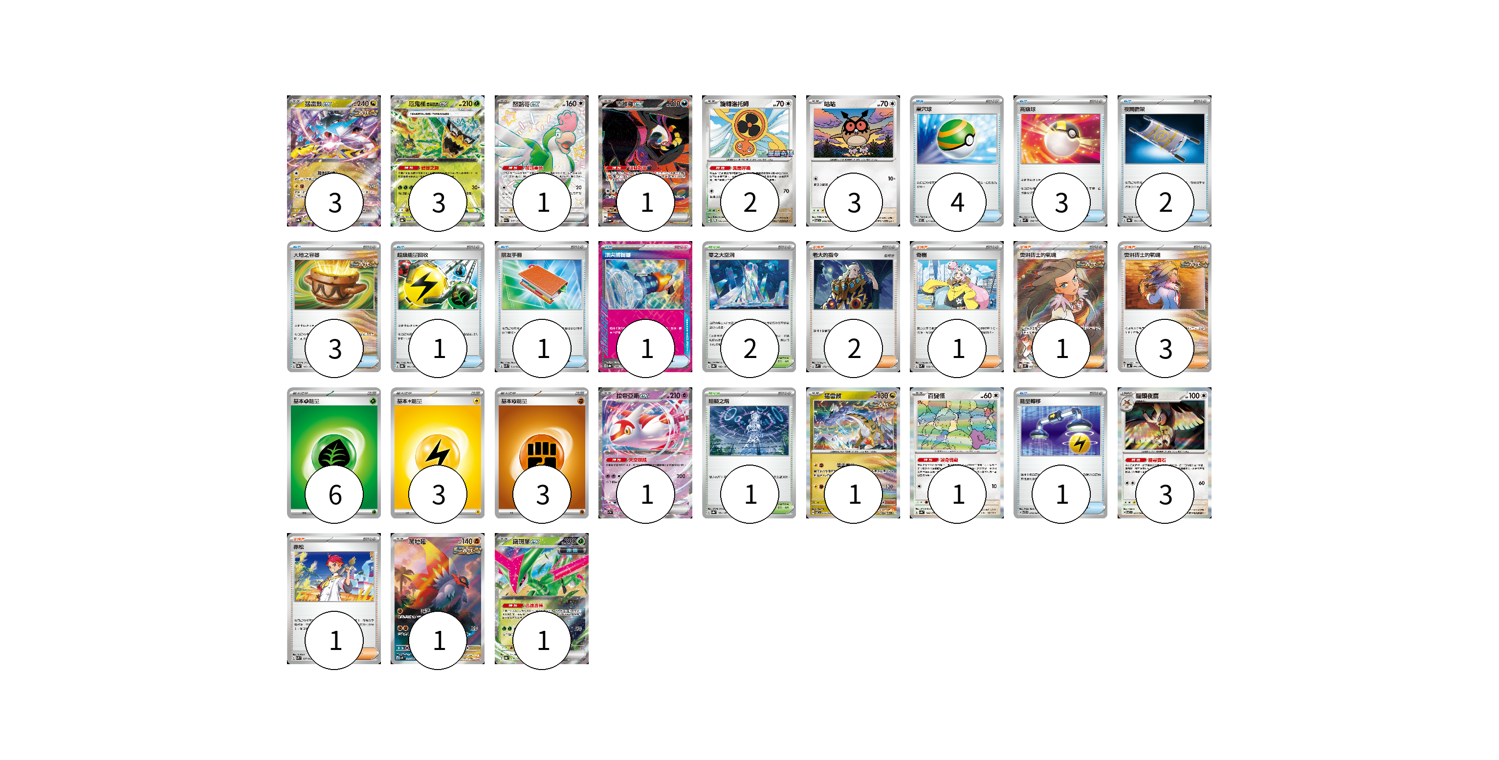 牌組構築方案 以此牌組為基礎新構築牌組 顯示卡面 顯示列表 寶可夢卡(21) 3 3 1 1 2 3 1 1 1 3 1 1 物品卡(16) 4 3 2 3 1 1 1 1 支援者卡(8) 2 1 1 3 1 競技場卡(3) 2 1 能量卡(12) 6 3 3 寶可夢卡(21) 卡牌名稱 張數 卡牌名稱 張數 猛雷鼓ex SV8a 124/187 03 厄鬼椪 碧草面具ex SV8a 020/187 03 怒鸚哥ex SV4a 337/190 01 吉雉雞ex SV6a 089/064 01 旋轉洛托姆 SV-P 146/SV-P 02 咕咕 SV7 076/102 03 拉帝亞斯ex SV7a 019/064 01 猛雷鼓 SV7 075/102 01 百變怪 SV4a 144/190 01 貓頭夜鷹 SV7 077/102 03 爬地翅 SV4K 074/066 01 鐵斑葉ex SV8a 016/187 01 物品卡(16) 卡牌名稱 張數 卡牌名稱 張數 巢穴球 SVEL 011/020 04 高級球 SVM 134/175 03 夜間擔架 SV8a 151/187 02 大地之容器 SV8a 143/187 03 超級能量回收 SV8a 141/187 01 朋友手冊 SVK 014/042 01 頂尖捕捉器 SV8a 148/187 01 能量轉移 SVTR 010/021 01 支援者卡(8) 卡牌名稱 張數 卡牌名稱 張數 老大的指令 SVM 172/175 02 奇樹 SVM 160/175 01 奧琳博士的氣魄 SV4K 085/066 01 奧琳博士的氣魄 SV4K 064/066 03 赤松 SVK 027/042 01 競技場卡(3) 卡牌名稱 張數 卡牌名稱 張數 零之大空洞 SV8a 182/187 02 阻礙之塔 SV8a 181/187 01 能量卡(12) 卡牌名稱 張數 卡牌名稱 張數 基本【草】能量 SVTM GRA 06 基本【雷】能量 SVTR LIG 03 基本【鬥】能量 SVTG FIG 03 以此牌組為基礎新構築牌組 牌組編碼 VsvJZs-oCdcjD-BWEOzC copy 列印牌組單 牌組編碼已複製 分享至SNS