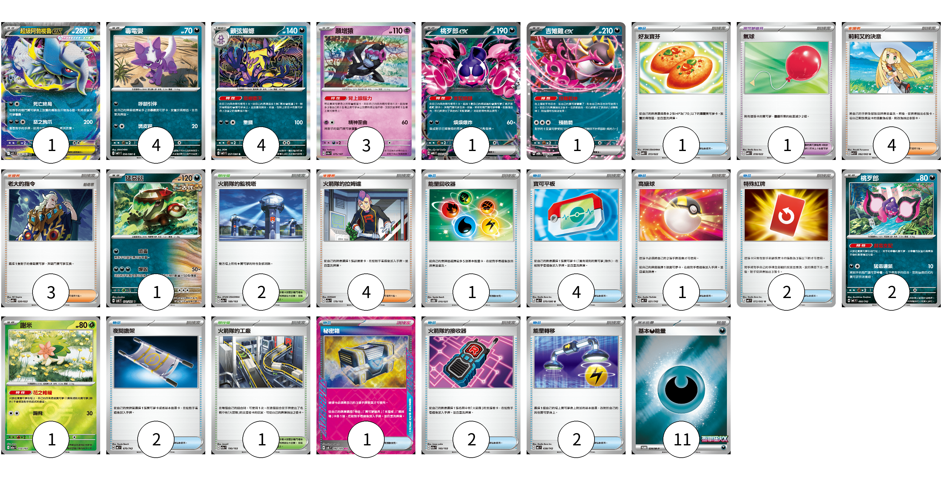 牌組構築方案 以此牌組為基礎新構築牌組 顯示卡面 顯示列表 寶可夢卡(18) 1 4 4 3 1 1 1 2 1 物品卡(17) 1 1 1 4 1 2 2 1 2 2 支援者卡(11) 4 3 4 競技場卡(3) 2 1 能量卡(11) 11 寶可夢卡(18) 卡牌名稱 張數 卡牌名稱 張數 超級阿勃梭魯ex M1L 038/063 01 毒電嬰 M2 056/080 04 顫弦蠑螈 M2 057/080 04 願增猿 SV8a 075/187 03 桃歹郎ex MBG 009/022 01 吉雉雞ex SVOM 009/021 01 猛惡菇 SV6 071/101 01 桃歹郎 MC 490/742 02 謝米 M2a 012/193 01 物品卡(17) 卡牌名稱 張數 卡牌名稱 張數 好友寶芬 MBD 013/022 01 氣球 MBD 018/022 01 能量回收器 SVOM 010/021 01 寶可平板 M3 070/080 04 高級球 MC 651/742 01 特殊紅牌 M4 072/083 02 夜間擔架 MC 670/742 02 秘密箱 SV6 092/101 01 火箭隊的接收器 M2a 160/193 02 能量轉移 MC 638/742 02 支援者卡(11) 卡牌名稱 張數 卡牌名稱 張數 莉莉艾的決意 M1L 062/063 04 老大的指令 MBD 020/022 03 火箭隊的拉姆達 M2a 179/193 04 競技場卡(3) 卡牌名稱 張數 卡牌名稱 張數 火箭隊的監視塔 M2a 189/193 02 火箭隊的工廠 M2a 190/193 01 能量卡(11) 卡牌名稱 張數 卡牌名稱 張數 基本【惡】能量 M-P 034/M-P 11 以此牌組為基礎新構築牌組 牌組編碼 VuqbHU-MPXSaS-oHBaDq copy 列印牌組單 牌組編碼已複製 分享至SNS
