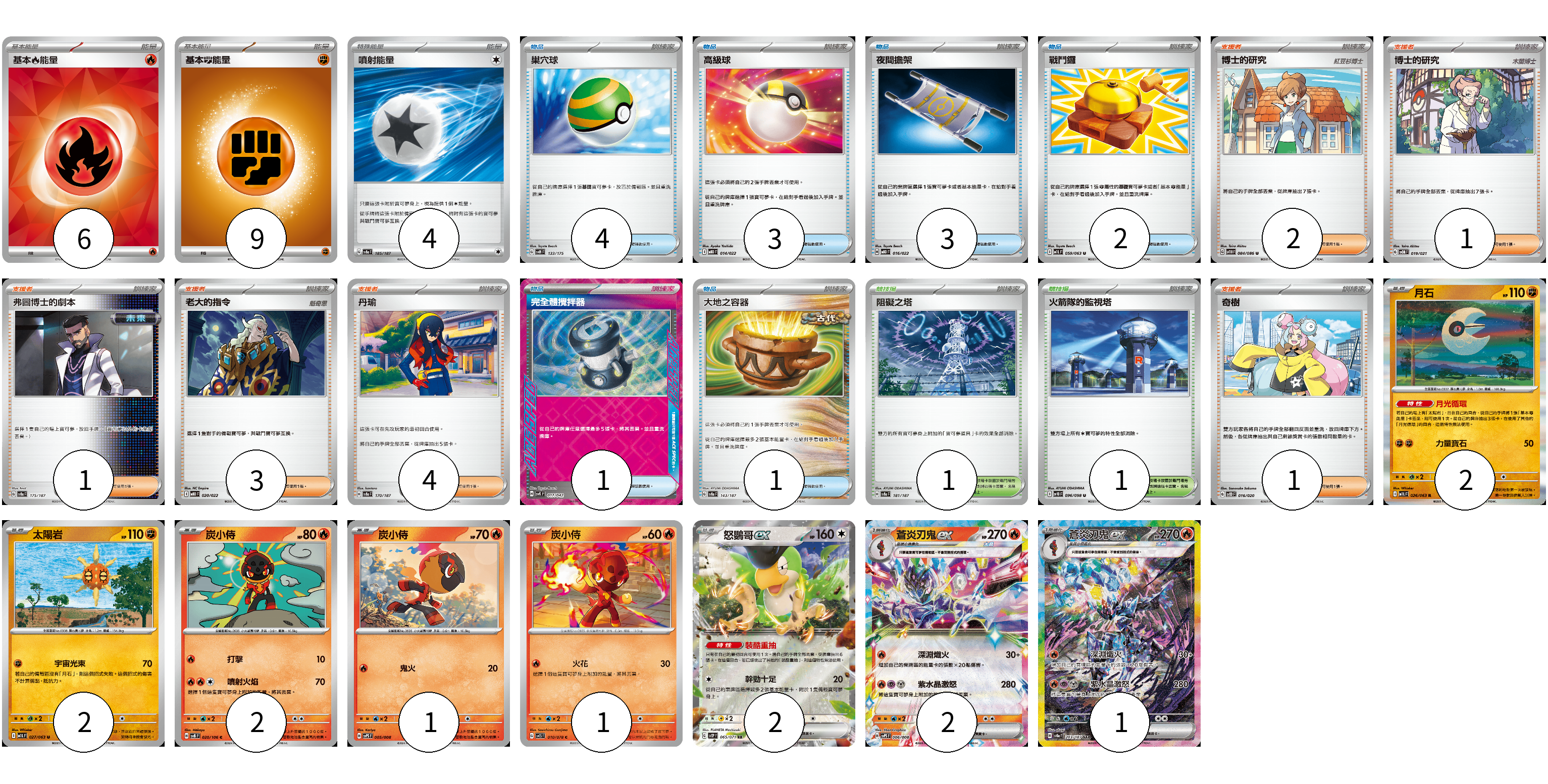 牌組構築方案 以此牌組為基礎新構築牌組 顯示卡面 顯示列表 寶可夢卡(13) 2 2 2 1 1 2 2 1 物品卡(14) 4 3 3 2 1 1 支援者卡(12) 2 1 1 3 4 1 競技場卡(2) 1 1 能量卡(19) 6 9 4 寶可夢卡(13) 卡牌名稱 張數 卡牌名稱 張數 月石 M1L 026/063 02 太陽岩 M1L 027/063 02 炭小侍 SV8 020/106 02 炭小侍 SVPS 005/008 01 炭小侍 SV1S 010/078 01 怒鸚哥ex SV2P 065/071 02 蒼炎刃鬼ex SVPS 006/008 02 蒼炎刃鬼ex SV8a 203/187 01 物品卡(14) 卡牌名稱 張數 卡牌名稱 張數 巢穴球 SVM 133/175 04 高級球 MBD 014/022 03 夜間擔架 MBD 016/022 03 戰鬥鑼 M1L 059/063 02 完全體攪拌器 SVK 017/042 01 大地之容器 SV8a 143/187 01 支援者卡(12) 卡牌名稱 張數 卡牌名稱 張數 博士的研究 SV11B 084/086 02 博士的研究 SVOM 019/021 01 弗圖博士的劇本 SV8a 175/187 01 老大的指令 MBD 020/022 03 丹瑜 SV8a 170/187 04 奇樹 SVOD 016/020 01 競技場卡(2) 卡牌名稱 張數 卡牌名稱 張數 阻礙之塔 SV8a 181/187 01 火箭隊的監視塔 SV10 096/098 01 能量卡(19) 卡牌名稱 張數 卡牌名稱 張數 基本【火】能量 SVQL FIR 06 基本【鬥】能量 M-P FIG 09 噴射能量 SV8a 185/187 04 以此牌組為基礎新構築牌組 牌組編碼 VvrCVM-KTfSPz-txmrbd copy 列印牌組單 牌組編碼已複製 分享至SNS