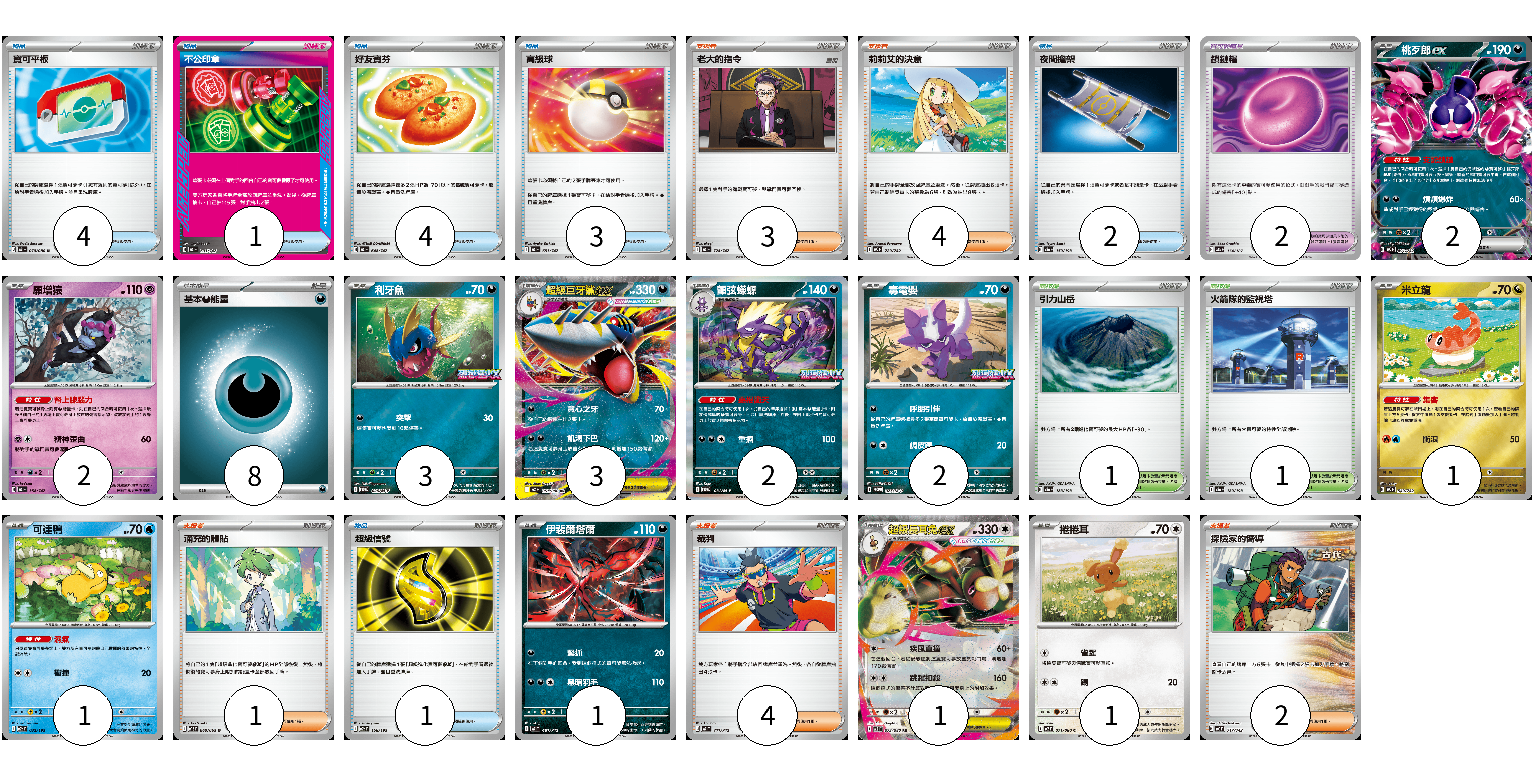牌組構築方案 以此牌組為基礎新構築牌組 顯示卡面 顯示列表 寶可夢卡(19) 2 2 3 3 2 2 1 1 1 1 1 寶可夢道具(2) 2 物品卡(15) 4 1 4 3 2 1 支援者卡(14) 3 4 1 4 2 競技場卡(2) 1 1 能量卡(8) 8 寶可夢卡(19) 卡牌名稱 張數 卡牌名稱 張數 桃歹郎ex MC 491/742 02 願增猿 MC 358/742 02 利牙魚 M-P 026/M-P 03 超級巨牙鯊ex M2 051/080 03 顫弦蠑螈 M-P 031/M-P 02 毒電嬰 M-P 027/M-P 02 米立龍 MC 549/742 01 可達鴨 M2a 032/193 01 伊裴爾塔爾 MC 481/742 01 超級長耳兔ex M2 072/080 01 捲捲耳 M2 071/080 01 寶可夢道具(2) 卡牌名稱 張數 卡牌名稱 張數 鎖鏈糬 SV8a 154/187 02 物品卡(15) 卡牌名稱 張數 卡牌名稱 張數 寶可平板 M3 070/080 04 不公印章 MC 633/742 01 好友寶芬 MC 648/742 04 高級球 MC 651/742 03 夜間擔架 M2a 159/193 02 超級信號 M2a 158/193 01 支援者卡(14) 卡牌名稱 張數 卡牌名稱 張數 老大的指令 MC 724/742 03 莉莉艾的決意 MC 729/742 04 滿充的體貼 M1S 060/063 01 裁判 MC 711/742 04 探險家的嚮導 MC 717/742 02 競技場卡(2) 卡牌名稱 張數 卡牌名稱 張數 引力山岳 M2a 183/193 01 火箭隊的監視塔 M2a 189/193 01 能量卡(8) 卡牌名稱 張數 卡牌名稱 張數 基本【惡】能量 MC DAR 08 以此牌組為基礎新構築牌組 牌組編碼 WCSQBj-SIAopd-GLfqSr copy 列印牌組單 牌組編碼已複製 分享至SNS