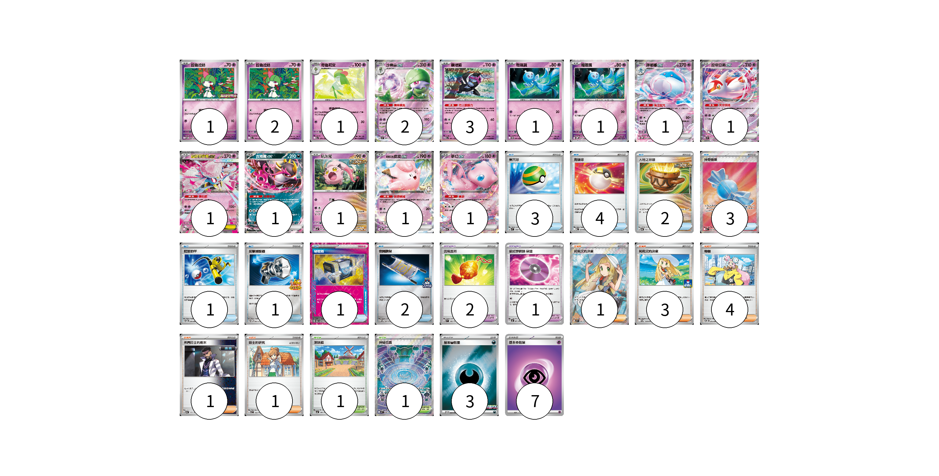 牌組構築方案 以此牌組為基礎新構築牌組 顯示卡面 顯示列表 寶可夢卡(18) 1 2 1 2 3 1 1 1 1 1 1 1 1 1 寶可夢道具(3) 2 1 物品卡(17) 3 4 2 3 1 1 1 2 支援者卡(10) 1 3 4 1 1 競技場卡(2) 1 1 能量卡(10) 3 7 寶可夢卡(18) 卡牌名稱 張數 卡牌名稱 張數 拉魯拉絲 M-P 005/M-P 01 拉魯拉絲 M2a 069/193 02 奇魯莉安 M2a 070/193 01 沙奈朵ex SV4a 082/190 02 願增猿 M2a 081/193 03 輕飄飄 SV11W 041/086 01 輕飄飄 SV11W 041/086 01 胖嘟嘟ex SV11W 042/086 01 拉帝亞斯ex SV7a 019/064 01 超級蒂安希ex MBD 006/022 01 吉雉雞ex M2a 114/193 01 吼叫尾 SV4K 032/066 01 莉莉艾的皮皮ex SV9 033/100 01 夢幻ex SV4a 076/190 01 寶可夢道具(3) 卡牌名稱 張數 卡牌名稱 張數 勇氣護符 SVM 142/175 02 招式學習器 衰退 SV4K 063/066 01 物品卡(17) 卡牌名稱 張數 卡牌名稱 張數 巢穴球 SVM 133/175 03 高級球 MBD 014/022 04 大地之容器 SV8a 143/187 02 神奇糖果 M1S 082/063 03 厲害釣竿 SVOD 010/020 01 反擊捕捉器 SV-P 083/SV-P 01 秘密箱 SV6 092/101 01 夜間擔架 SV-P 204/SV-P 02 支援者卡(10) 卡牌名稱 張數 卡牌名稱 張數 莉莉艾的決意 M1L 086/063 01 莉莉艾的決意 M-P 018/M-P 03 奇樹 SVOD 016/020 04 弗圖博士的劇本 SV8a 175/187 01 博士的研究 SVM 166/175 01 競技場卡(2) 卡牌名稱 張數 卡牌名稱 張數 深缽鎮 SV4a 185/190 01 神秘花園 M1S 086/063 01 能量卡(10) 卡牌名稱 張數 卡牌名稱 張數 基本【惡】能量 M-P 034/M-P 03 基本【超】能量 SVEM PSY 07 以此牌組為基礎新構築牌組 牌組編碼 WCojWr-RKUJcC-EmFDox copy 列印牌組單 牌組編碼已複製 分享至SNS