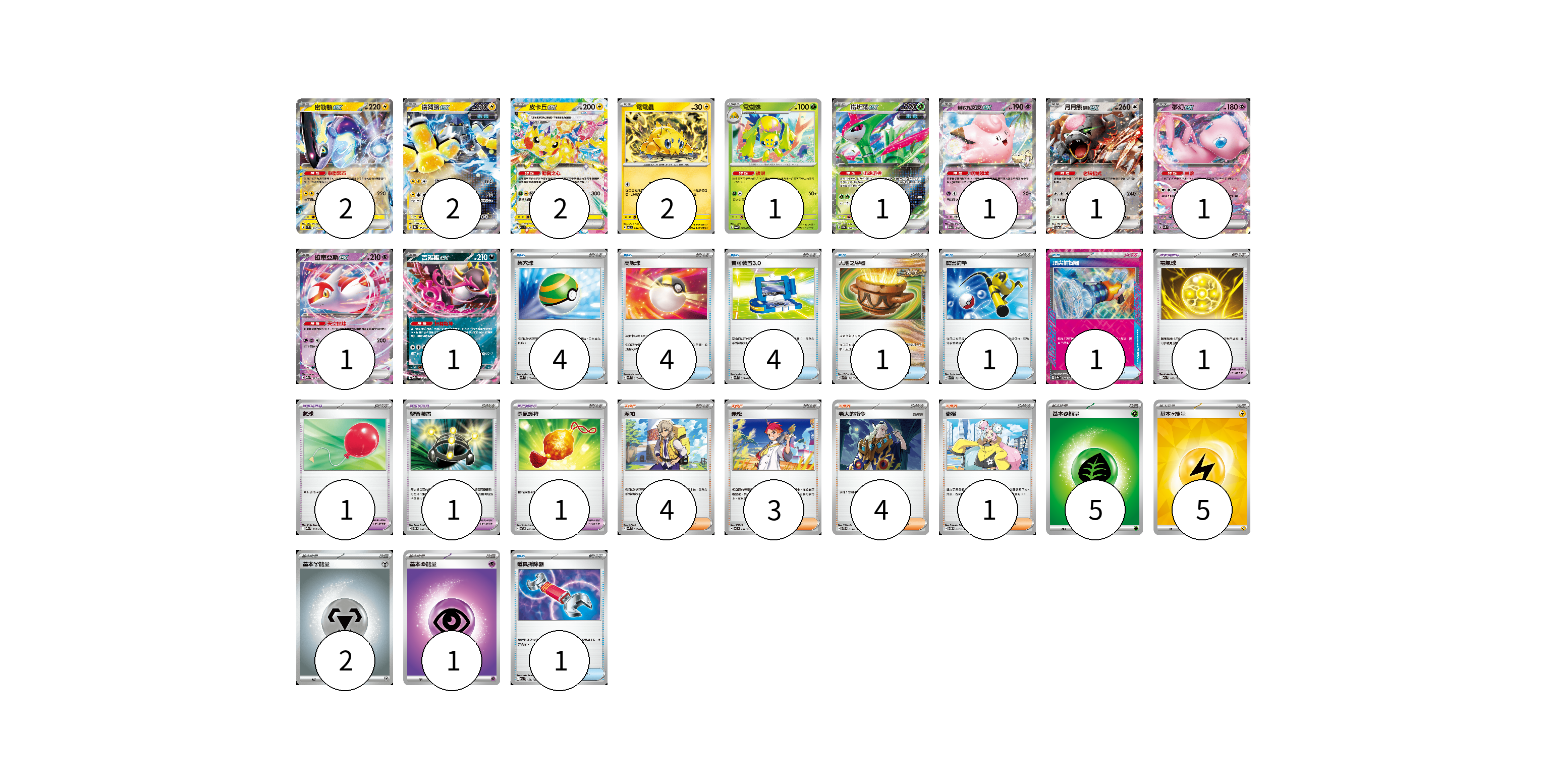 牌組構築方案 以此牌組為基礎新構築牌組 顯示卡面 顯示列表 寶可夢卡(15) 2 2 2 2 1 1 1 1 1 1 1 寶可夢道具(4) 1 1 1 1 物品卡(16) 4 4 4 1 1 1 1 支援者卡(12) 4 3 4 1 能量卡(13) 5 5 2 1 寶可夢卡(15) 卡牌名稱 張數 卡牌名稱 張數 密勒頓ex SV1V 037/078 02 鐵臂膀ex SV8a 054/187 02 皮卡丘ex M2a 044/193 02 電電蟲 SV7 032/102 02 電蜘蛛 SV6a 002/064 01 鐵斑葉ex SV5M 016/071 01 莉莉艾的皮皮ex M2a 060/193 01 月月熊 赫月 ex SV5a 052/066 01 夢幻ex SVK 001/042 01 拉帝亞斯ex M2a 075/193 01 吉雉雞ex M2a 114/193 01 寶可夢道具(4) 卡牌名稱 張數 卡牌名稱 張數 電氣球 M2a 163/193 01 氣球 M2a 165/193 01 學習裝置 SVTM 016/022 01 勇氣護符 SVTR 015/021 01 物品卡(16) 卡牌名稱 張數 卡牌名稱 張數 巢穴球 SVK 016/042 04 高級球 SVK 018/042 04 寶可裝置3.0 SVK 021/042 04 大地之容器 SVK 012/042 01 厲害釣竿 SVK 011/042 01 頂尖捕捉器 SV8a 148/187 01 道具拆除器 M2a 151/193 01 支援者卡(12) 卡牌名稱 張數 卡牌名稱 張數 派帕 SVK 035/042 04 赤松 SV7 097/102 03 老大的指令 SVTG 019/019 04 奇樹 SVTM 017/022 01 能量卡(13) 卡牌名稱 張數 卡牌名稱 張數 基本【草】能量 M-P GRA 05 基本【雷】能量 SVQP LIG 05 基本【鋼】能量 M-P MET 02 基本【超】能量 M-P PSY 01 以此牌組為基礎新構築牌組 牌組編碼 WNqSMJ-pzAqSu-YSmAJu copy 列印牌組單 牌組編碼已複製 分享至SNS