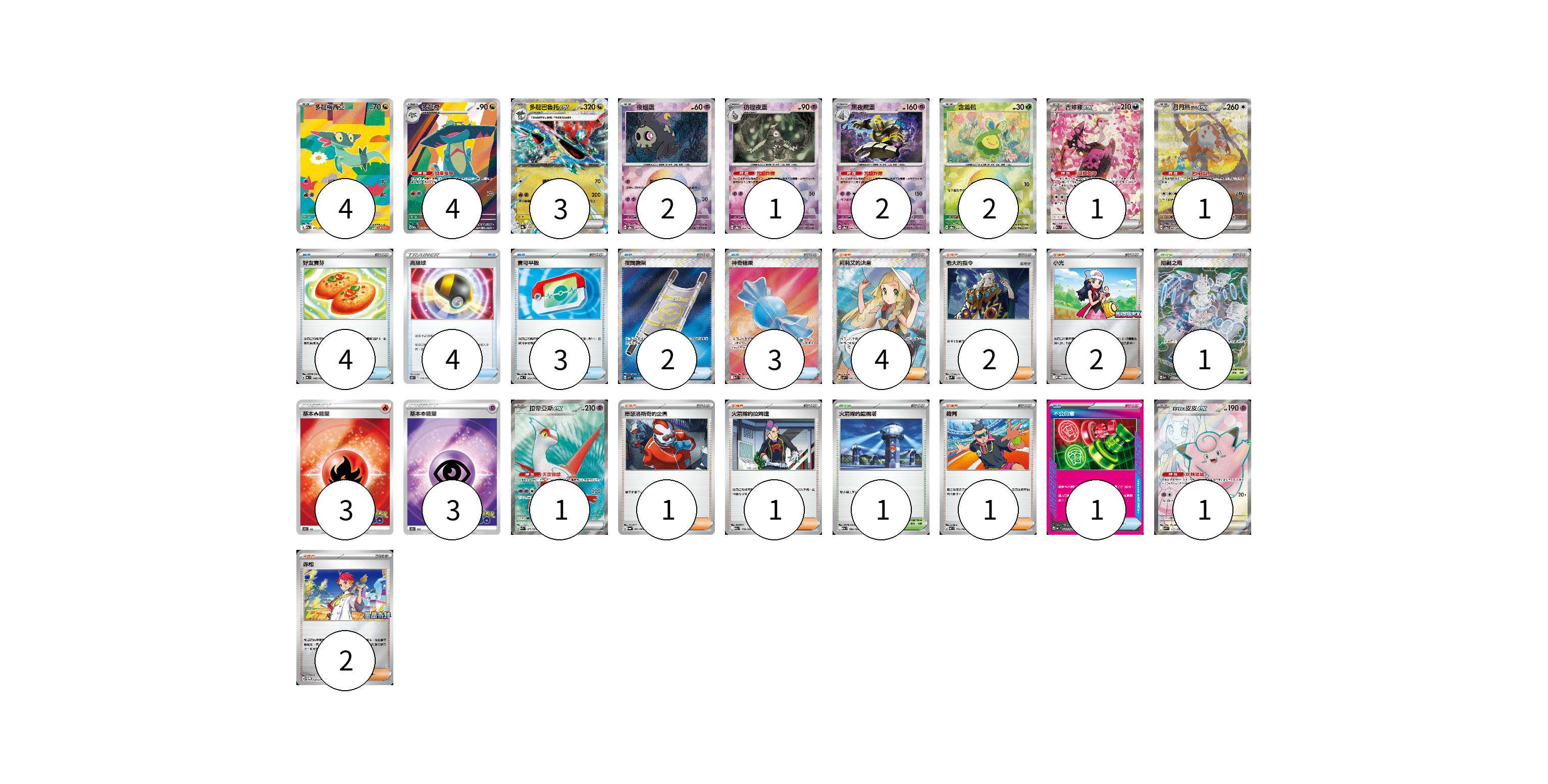 牌組構築方案 以此牌組為基礎新構築牌組 顯示卡面 顯示列表 寶可夢卡(22) 4 4 3 2 1 2 2 1 1 1 1 物品卡(17) 4 4 3 2 3 1 支援者卡(13) 4 2 2 1 1 1 2 競技場卡(2) 1 1 能量卡(6) 3 3 寶可夢卡(22) 卡牌名稱 張數 卡牌名稱 張數 多龍梅西亞 M2a 211/193 04 多龍奇 M2a 212/193 04 多龍巴魯托ex SV8a 120/187 03 夜巡靈 SV8a 064/187 02 彷徨夜靈 SV8a 065/187 01 黑夜魔靈 SV8a 066/187 02 含羞苞 SV8a 001/187 02 吉雉雞ex M2a 244/193 01 月月熊 赫月 ex SV5a 091/066 01 拉帝亞斯ex SV7a 078/064 01 莉莉艾的皮皮ex SV9 115/100 01 物品卡(17) 卡牌名稱 張數 卡牌名稱 張數 好友寶芬 MC 648/742 04 高級球 SN 016/024 04 寶可平板 MC 662/742 03 夜間擔架 M1L 083/063 02 神奇糖果 M1S 082/063 03 不公印章 MC 633/742 01 支援者卡(13) 卡牌名稱 張數 卡牌名稱 張數 莉莉艾的決意 M1L 086/063 04 老大的指令 SVM 172/175 02 小光 M-P 028/M-P 02 庫瑟洛斯奇的企圖 SV6a 062/064 01 火箭隊的拉姆達 M2a 179/193 01 裁判 MC 711/742 01 赤松 SV-P 150/SV-P 02 競技場卡(2) 卡牌名稱 張數 卡牌名稱 張數 阻礙之塔 M2a 222/193 01 火箭隊的監視塔 M2a 189/193 01 能量卡(6) 卡牌名稱 張數 卡牌名稱 張數 基本火能量 S10b FIR 03 基本超能量 S10b PSY 03 以此牌組為基礎新構築牌組 牌組編碼 WOatjl-nvyqtD-hcDDoa copy 列印牌組單 牌組編碼已複製 分享至SNS