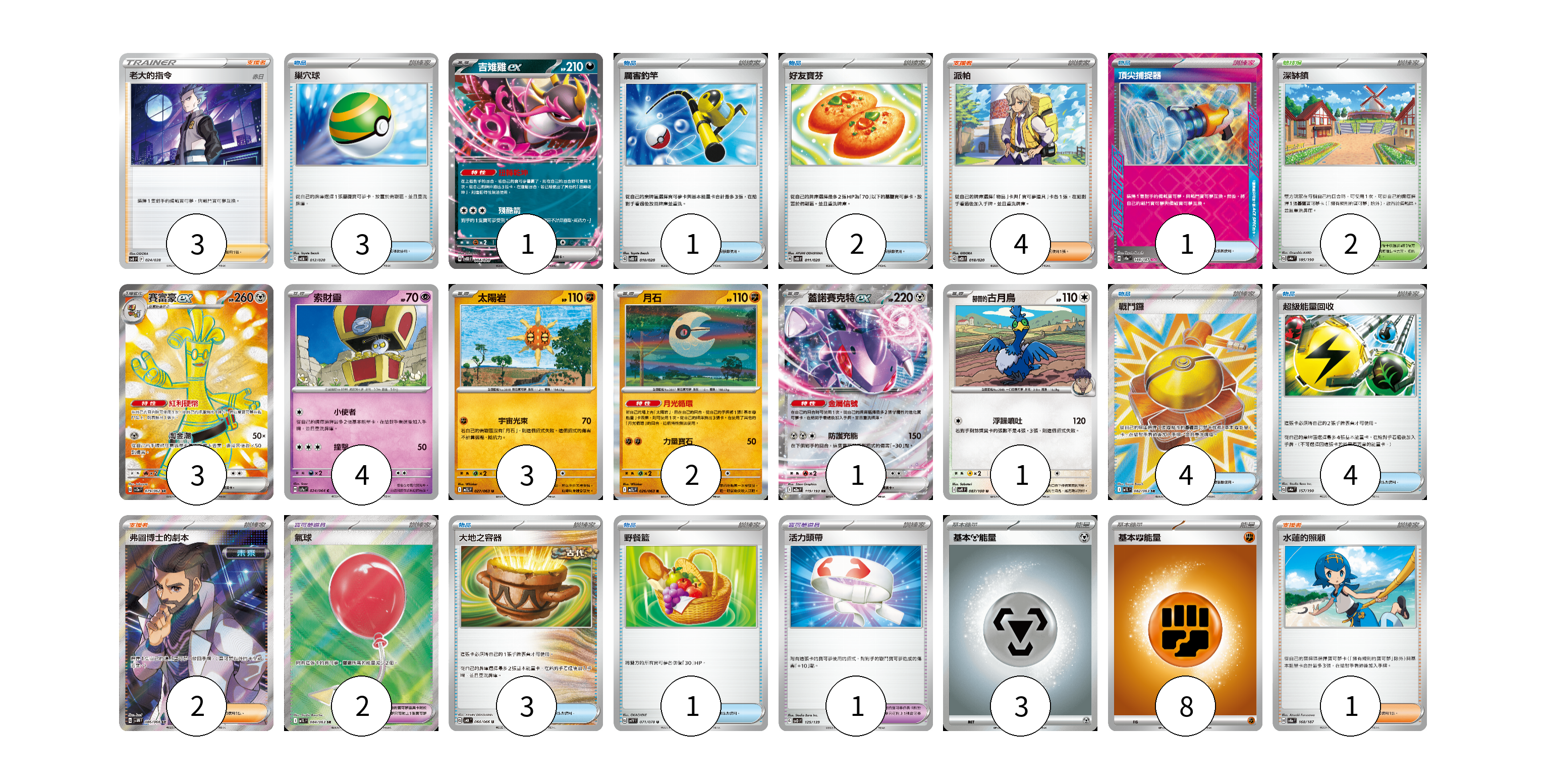 牌組構築方案 以此牌組為基礎新構築牌組 顯示卡面 顯示列表 寶可夢卡(15) 1 3 4 3 2 1 1 寶可夢道具(3) 2 1 物品卡(19) 3 1 2 1 4 4 3 1 支援者卡(10) 3 4 2 1 競技場卡(2) 2 能量卡(11) 3 8 寶可夢卡(15) 卡牌名稱 張數 卡牌名稱 張數 吉雉雞ex SVOD 004/020 01 賽富豪ex SV3a 079/062 03 索財靈 SV7a 024/064 04 太陽岩 M1L 027/063 03 月石 M1L 026/063 02 蓋諾賽克特ex M2a 119/193 01 赫普的古月鳥 SV9 087/100 01 寶可夢道具(3) 卡牌名稱 張數 卡牌名稱 張數 氣球 M1L 084/063 02 活力頭帶 SVD 125/139 01 物品卡(19) 卡牌名稱 張數 卡牌名稱 張數 巢穴球 SVEM 012/020 03 厲害釣竿 SVOD 010/020 01 好友寶芬 SVOD 011/020 02 頂尖捕捉器 SV8a 148/187 01 戰鬥鑼 M1L 082/063 04 超級能量回收 SV4a 157/190 04 大地之容器 SV4K 060/066 03 野餐籃 SV1V 071/078 01 支援者卡(10) 卡牌名稱 張數 卡牌名稱 張數 老大的指令(赤日) SVB 024/028 03 派帕 SVOD 018/020 04 弗圖博士的劇本 SV4M 086/066 02 水蓮的照顧 SV8a 168/187 01 競技場卡(2) 卡牌名稱 張數 卡牌名稱 張數 深缽鎮 SV4a 185/190 02 能量卡(11) 卡牌名稱 張數 卡牌名稱 張數 基本【鋼】能量 M-P MET 03 基本【鬥】能量 M-P FIG 08 以此牌組為基礎新構築牌組 牌組編碼 WOhwQM-Ahmjhr-HQRFxp copy 列印牌組單 牌組編碼已複製 分享至SNS