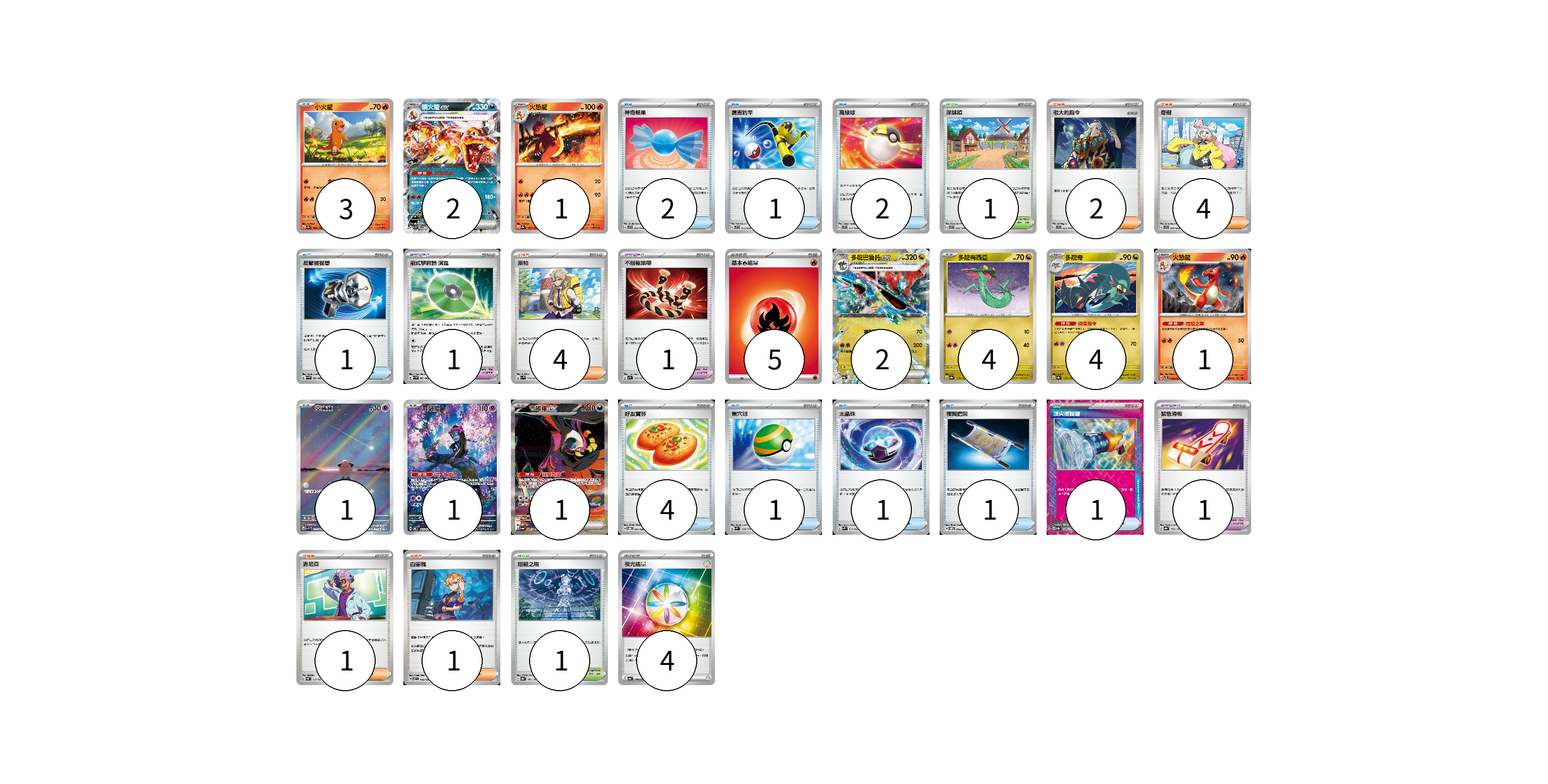 牌組構築方案 以此牌組為基礎新構築牌組 顯示卡面 顯示列表 寶可夢卡(20) 3 2 1 2 4 4 1 1 1 1 寶可夢道具(3) 1 1 1 物品卡(14) 2 1 2 1 4 1 1 1 1 支援者卡(12) 2 4 4 1 1 競技場卡(2) 1 1 能量卡(9) 5 4 寶可夢卡(20) 卡牌名稱 張數 卡牌名稱 張數 小火龍 SV2a 004/165 03 噴火龍ex SV3 066/108 02 火恐龍 SV2a 005/165 01 多龍巴魯托ex SV8a 120/187 02 多龍梅西亞 SV8a 118/187 04 多龍奇 SV8a 119/187 04 火恐龍 SVTL 002/021 01 皮寶寶 SV3 113/108 01 願增猿 SV6 107/101 01 吉雉雞ex SV6a 089/064 01 寶可夢道具(3) 卡牌名稱 張數 卡牌名稱 張數 招式學習器 演進 SV4M 063/066 01 不服輸頭帶 SV1S 073/078 01 緊急滑板 SV8a 153/187 01 物品卡(14) 卡牌名稱 張數 卡牌名稱 張數 神奇糖果 SVF 020/038 02 厲害釣竿 SVF 013/038 01 高級球 SVF 017/038 02 反擊捕捉器 SV4M 059/066 01 好友寶芬 SVOD 011/020 04 巢穴球 SVM 133/175 01 太晶珠 SVK 013/042 01 夜間擔架 SVOM 016/021 01 頂尖捕捉器 SV8a 148/187 01 支援者卡(12) 卡牌名稱 張數 卡牌名稱 張數 老大的指令 SVF 032/038 02 奇樹 SVF 029/038 04 派帕 SV1V 076/078 04 吉尼亞 SVAL 017/021 01 白蕾雅 SV7 100/102 01 競技場卡(2) 卡牌名稱 張數 卡牌名稱 張數 深缽鎮 SVF 036/038 01 阻礙之塔 SV8a 181/187 01 能量卡(9) 卡牌名稱 張數 卡牌名稱 張數 基本【火】能量 SVF FIR 05 夜光能量 SV4a 190/190 04 以此牌組為基礎新構築牌組 牌組編碼 WOnurZ-LrHgcv-bLuSNK copy 列印牌組單 牌組編碼已複製 分享至SNS