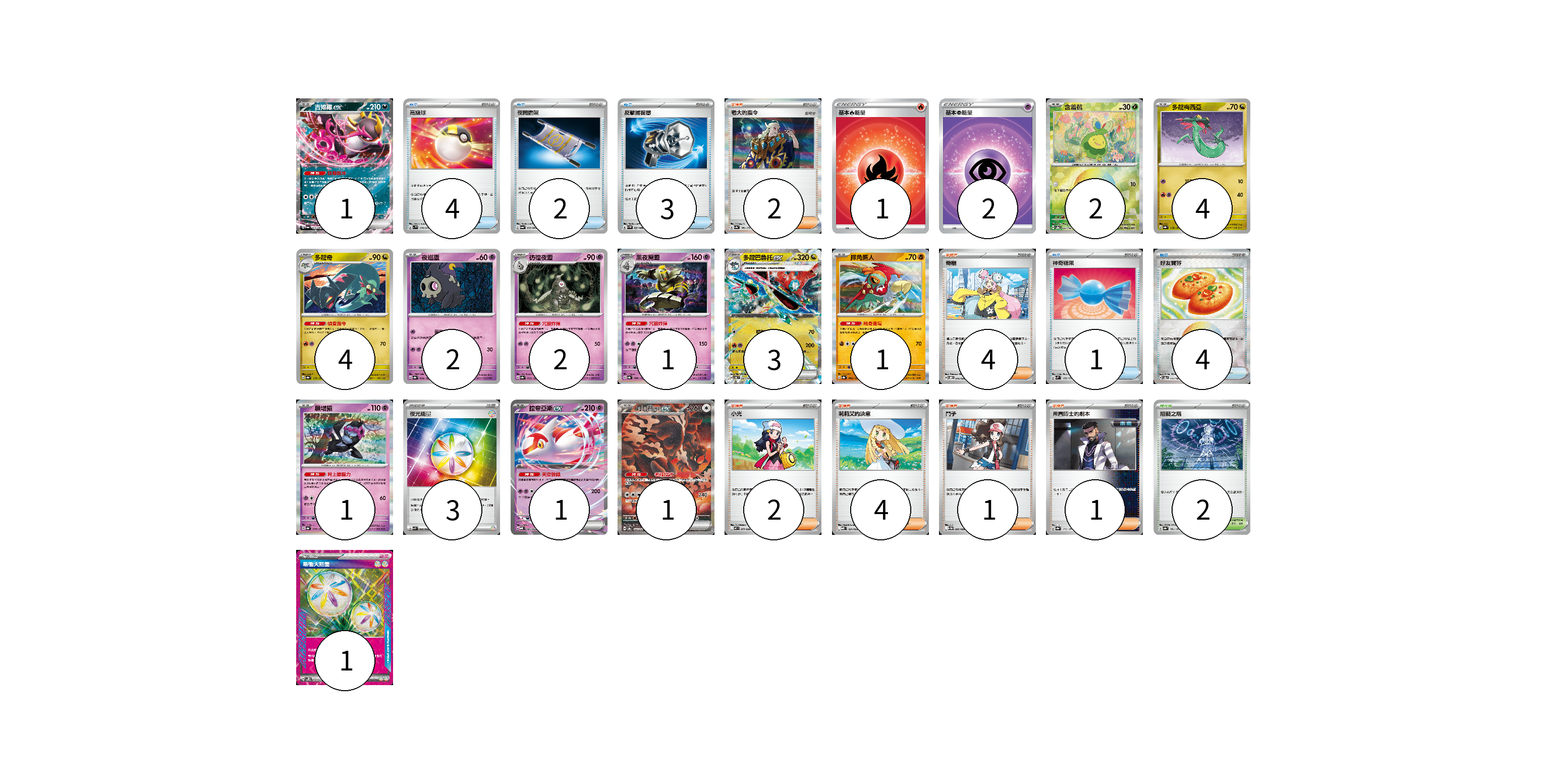 牌組構築方案 以此牌組為基礎新構築牌組 顯示卡面 顯示列表 寶可夢卡(23) 1 2 4 4 2 2 1 3 1 1 1 1 物品卡(14) 4 2 3 1 4 支援者卡(14) 2 4 2 4 1 1 競技場卡(2) 2 能量卡(7) 1 2 3 1 寶可夢卡(23) 卡牌名稱 張數 卡牌名稱 張數 吉雉雞ex SV6a 038/064 01 含羞苞 SV8a 001/187 02 多龍梅西亞 SV8a 118/187 04 多龍奇 SV8a 119/187 04 夜巡靈 SV8a 064/187 02 彷徨夜靈 SV8a 065/187 02 黑夜魔靈 SV8a 066/187 01 多龍巴魯托ex SV6 081/101 03 摔角鷹人 SV8a 084/187 01 願增猿 SV8a 075/187 01 拉帝亞斯ex MBD 003/022 01 月月熊 赫月ex SV8a 225/187 01 物品卡(14) 卡牌名稱 張數 卡牌名稱 張數 高級球 SV1V 070/078 04 夜間擔架 SV6a 056/064 02 反擊捕捉器 SV4M 059/066 03 神奇糖果 SVM 135/175 01 好友寶芬 SV8a 147/187 04 支援者卡(14) 卡牌名稱 張數 卡牌名稱 張數 老大的指令 SV4a 181/190 02 奇樹 SVOD 016/020 04 小光 M2 077/080 02 莉莉艾的決意 MBD 021/022 04 鬥子 SV11W 085/086 01 弗圖博士的劇本 SV8a 175/187 01 競技場卡(2) 卡牌名稱 張數 卡牌名稱 張數 阻礙之塔 SV8a 181/187 02 能量卡(7) 卡牌名稱 張數 卡牌名稱 張數 基本【炎】能量 SI FIR 01 基本【超】能量 SI PSY 02 夜光能量 SVK 042/042 03 新衝天能量 SV5K 071/071 01 以此牌組為基礎新構築牌組 牌組編碼 WXzbZP-wRoWLM-YqWZgI copy 列印牌組單 牌組編碼已複製 分享至SNS