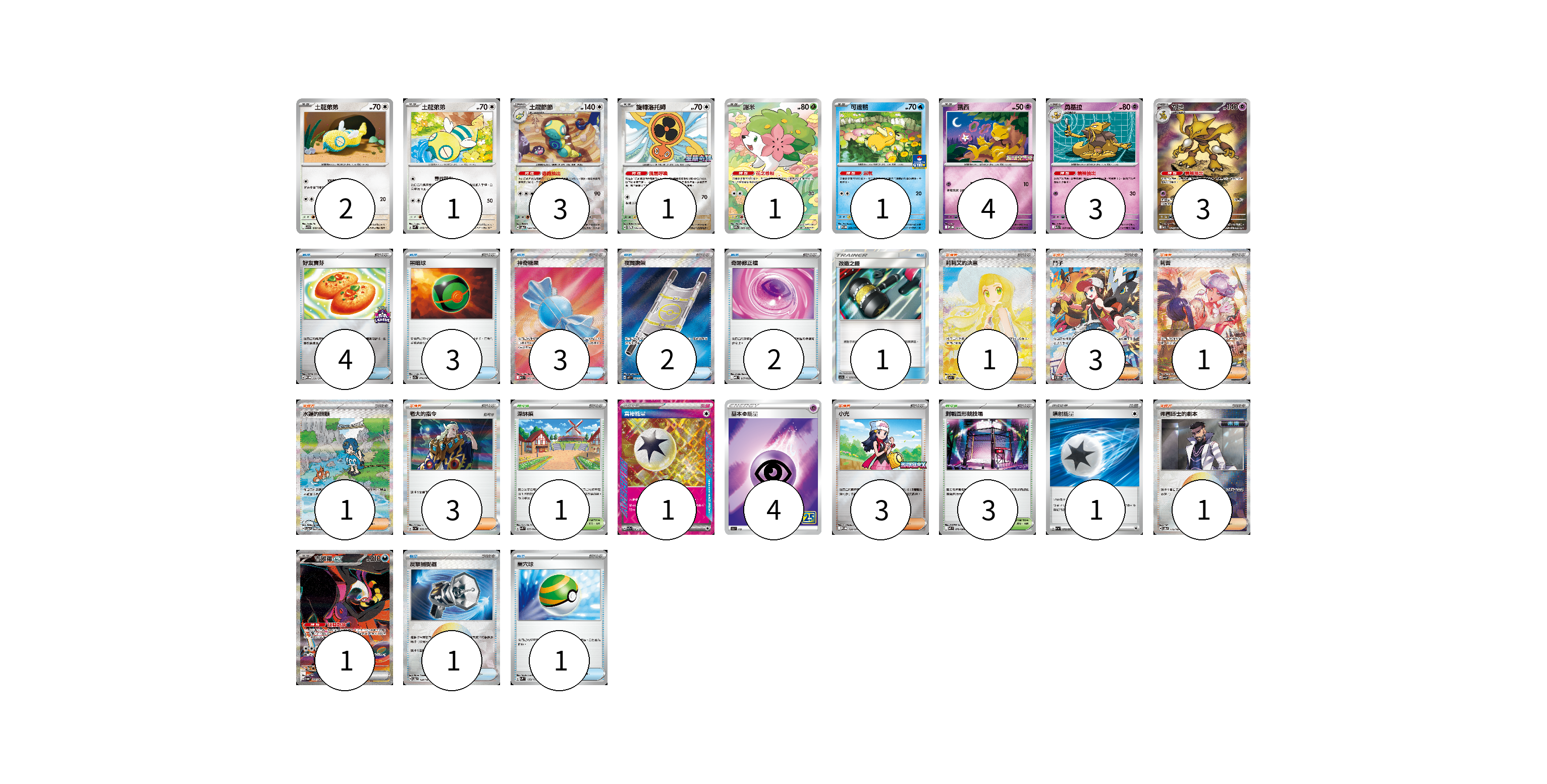 牌組構築方案 以此牌組為基礎新構築牌組 顯示卡面 顯示列表 寶可夢卡(20) 2 1 3 1 1 1 4 3 3 1 物品卡(17) 4 3 3 2 2 1 1 1 支援者卡(13) 1 3 1 1 3 3 1 競技場卡(4) 1 3 能量卡(6) 1 4 1 寶可夢卡(20) 卡牌名稱 張數 卡牌名稱 張數 土龍弟弟 SV9 078/100 02 土龍弟弟 SVM 095/175 01 土龍節節 SV8a 130/187 03 旋轉洛托姆 SV-P 146/SV-P 01 謝米 SV9a 066/063 01 可達鴨 SV-P 220/SV-P 01 凱西 M-P 004/M-P 04 勇基拉 M1S 037/063 03 胡地 M1S 071/063 03 吉雉雞ex SV6a 089/064 01 物品卡(17) 卡牌名稱 張數 卡牌名稱 張數 好友寶芬 SV-P 230/SV-P 04 黑暗球 SV7a 054/064 03 神奇糖果 M1S 082/063 03 夜間擔架 M1L 083/063 02 奇跡修正檔 MBD 017/022 02 改造之錘 AS5a 177/184 01 反擊捕捉器 SV8a 139/187 01 巢穴球 SVM 133/175 01 支援者卡(13) 卡牌名稱 張數 卡牌名稱 張數 莉莉艾的決意 M1L 091/063 01 鬥子 SV11W 173/086 03 莉普 SV4M 092/066 01 水蓮的照顧 SV5a 093/066 01 老大的指令 SV1a 069/073 03 小光 M-P 028/M-P 03 弗圖博士的劇本 SV8a 175/187 01 競技場卡(4) 卡牌名稱 張數 卡牌名稱 張數 深缽鎮 SVK 039/042 01 對戰圓形競技場 M2 079/080 03 能量卡(6) 卡牌名稱 張數 卡牌名稱 張數 富裕能量 SV7a 064/064 01 基本超能量 S8a PSY 04 噴射能量 SV1a 072/073 01 以此牌組為基礎新構築牌組 牌組編碼 WatVtg-xuhFcx-oQHhwX copy 列印牌組單 牌組編碼已複製 分享至SNS