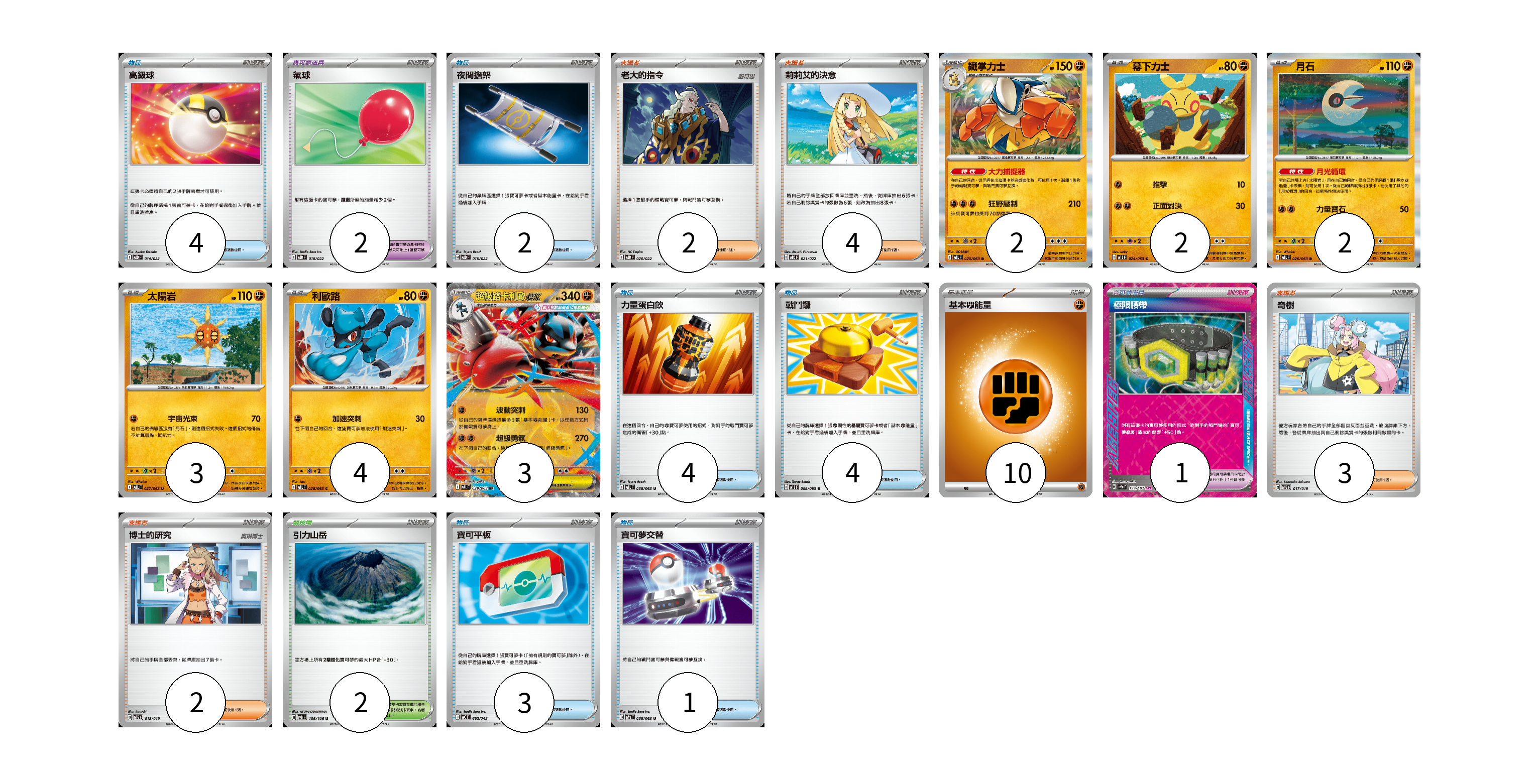 牌組構築方案 以此牌組為基礎新構築牌組 顯示卡面 顯示列表 寶可夢卡(16) 2 2 2 3 4 3 寶可夢道具(1) 1 物品卡(20) 4 2 2 4 4 3 1 支援者卡(11) 2 4 3 2 競技場卡(2) 2 能量卡(10) 10 寶可夢卡(16) 卡牌名稱 張數 卡牌名稱 張數 鐵掌力士 M1L 025/063 02 幕下力士 M1L 024/063 02 月石 M1L 026/063 02 太陽岩 M1L 027/063 03 利歐路 M1L 028/063 04 超級路卡利歐ex M1L 029/063 03 寶可夢道具(1) 卡牌名稱 張數 卡牌名稱 張數 極限腰帶 SV8a 159/187 01 物品卡(20) 卡牌名稱 張數 卡牌名稱 張數 高級球 MBD 014/022 04 氣球 MBD 018/022 02 夜間擔架 MBD 016/022 02 力量蛋白飲 M1L 058/063 04 戰鬥鑼 M1L 059/063 04 寶可平板 MC 662/742 03 寶可夢交替 SV9a 058/063 01 支援者卡(11) 卡牌名稱 張數 卡牌名稱 張數 老大的指令 MBD 020/022 02 莉莉艾的決意 MBD 021/022 04 奇樹 SVTG 017/019 03 博士的研究 SVTG 018/019 02 競技場卡(2) 卡牌名稱 張數 卡牌名稱 張數 引力山岳 SV8 106/106 02 能量卡(10) 卡牌名稱 張數 卡牌名稱 張數 基本【鬥】能量 M-P FIG 10 以此牌組為基礎新構築牌組 牌組編碼 WdqZug-DUbcCa-MRPjsv copy 列印牌組單 牌組編碼已複製 分享至SNS