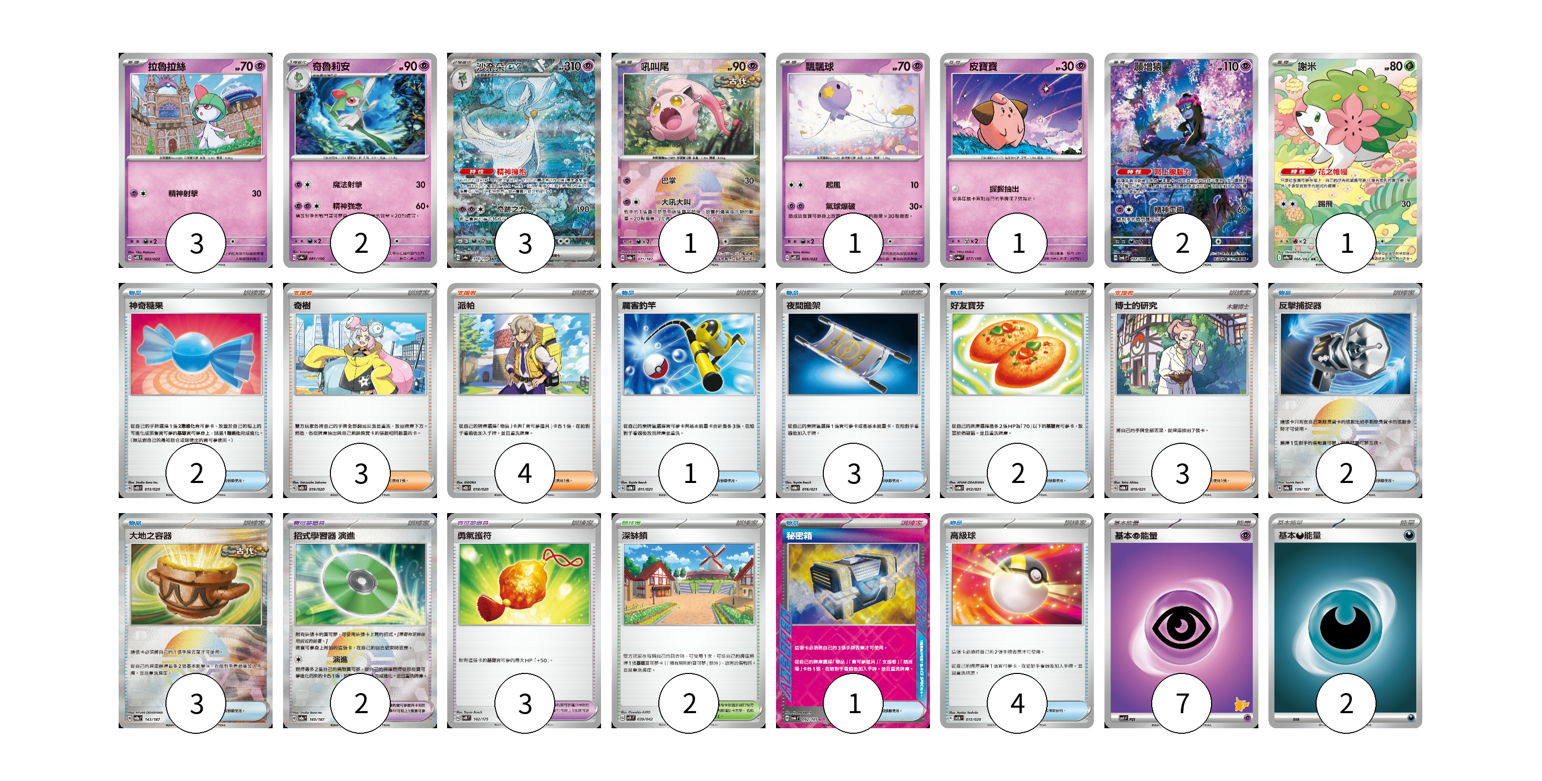 牌組構築方案 以此牌組為基礎新構築牌組 顯示卡面 顯示列表 寶可夢卡(14) 3 2 3 1 1 1 2 1 寶可夢道具(5) 2 3 物品卡(18) 2 1 3 2 2 3 1 4 支援者卡(10) 3 4 3 競技場卡(2) 2 能量卡(9) 7 2 寶可夢卡(14) 卡牌名稱 張數 卡牌名稱 張數 拉魯拉絲 SVTS 002/022 03 奇魯莉安 SV4a 081/190 02 沙奈朵ex SV4a 348/190 03 吼叫尾 SV8a 071/187 01 飄飄球 SVTS 005/022 01 皮寶寶 SV4a 077/190 01 願增猿 SV6 107/101 02 謝米 SV9a 066/063 01 寶可夢道具(5) 卡牌名稱 張數 卡牌名稱 張數 招式學習器 演進 SV8a 160/187 02 勇氣護符 SVM 142/175 03 物品卡(18) 卡牌名稱 張數 卡牌名稱 張數 神奇糖果 SVOD 013/020 02 厲害釣竿 SVOM 011/021 01 夜間擔架 SVOM 016/021 03 好友寶芬 SVOM 012/021 02 反擊捕捉器 SV8a 139/187 02 大地之容器 SV8a 143/187 03 秘密箱 SV6 092/101 01 高級球 SVEM 013/020 04 支援者卡(10) 卡牌名稱 張數 卡牌名稱 張數 奇樹 SVOD 016/020 03 派帕 SVOD 018/020 04 博士的研究 SVOM 019/021 03 競技場卡(2) 卡牌名稱 張數 卡牌名稱 張數 深缽鎮 SVK 039/042 02 能量卡(9) 卡牌名稱 張數 卡牌名稱 張數 基本【超】能量 SVI PSY 07 基本【惡】能量 SVF DAR 02 以此牌組為基礎新構築牌組 牌組編碼 WeVhym-vnuHHU-OJromZ copy 列印牌組單 牌組編碼已複製 分享至SNS