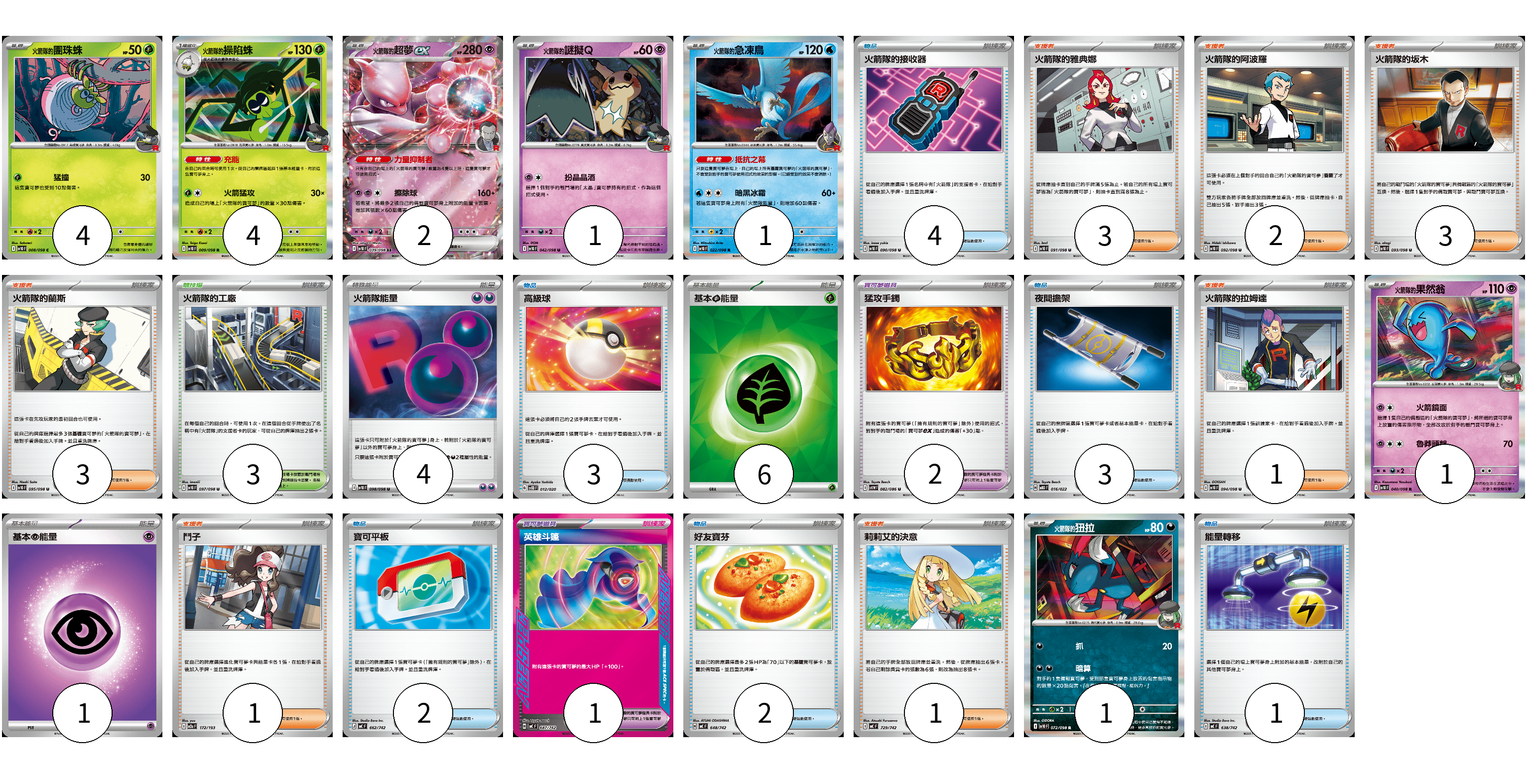 牌組構築方案 以此牌組為基礎新構築牌組 顯示卡面 顯示列表 寶可夢卡(14) 4 4 2 1 1 1 1 寶可夢道具(3) 2 1 物品卡(15) 4 3 3 2 2 1 支援者卡(14) 3 2 3 3 1 1 1 競技場卡(3) 3 能量卡(11) 4 6 1 寶可夢卡(14) 卡牌名稱 張數 卡牌名稱 張數 <火箭隊的>團珠蛛 SV10 008/098 04 <火箭隊的>操陷蛛 SV10 009/098 04 <火箭隊的>超夢ex SV10 039/098 02 <火箭隊的>謎擬Q SV10 042/098 01 <火箭隊的>急凍鳥 SV10 022/098 01 <火箭隊的>果然翁 SV10 040/098 01 <火箭隊的>狃拉 SV10 072/098 01 寶可夢道具(3) 卡牌名稱 張數 卡牌名稱 張數 猛攻手鐲 SV11W 082/086 02 英雄斗篷 MC 687/742 01 物品卡(15) 卡牌名稱 張數 卡牌名稱 張數 火箭隊的接收器 SV10 090/098 04 高級球 SVOD 012/020 03 夜間擔架 MBD 016/022 03 寶可平板 MC 662/742 02 好友寶芬 MC 648/742 02 能量轉移 MC 638/742 01 支援者卡(14) 卡牌名稱 張數 卡牌名稱 張數 火箭隊的雅典娜 SV10 091/098 03 火箭隊的阿波羅 SV10 092/098 02 火箭隊的坂木 SV10 093/098 03 火箭隊的蘭斯 SV10 095/098 03 火箭隊的拉姆達 SV10 094/098 01 鬥子 M2a 172/193 01 莉莉艾的決意 MC 729/742 01 競技場卡(3) 卡牌名稱 張數 卡牌名稱 張數 火箭隊的工廠 SV10 097/098 03 能量卡(11) 卡牌名稱 張數 卡牌名稱 張數 火箭隊能量 SV10 098/098 04 基本【草】能量 SVM GRA 06 基本【超】能量 MBD PSY 01 以此牌組為基礎新構築牌組 牌組編碼 WlnLdg-DgUaOl-ndxGXb copy 列印牌組單 牌組編碼已複製 分享至SNS