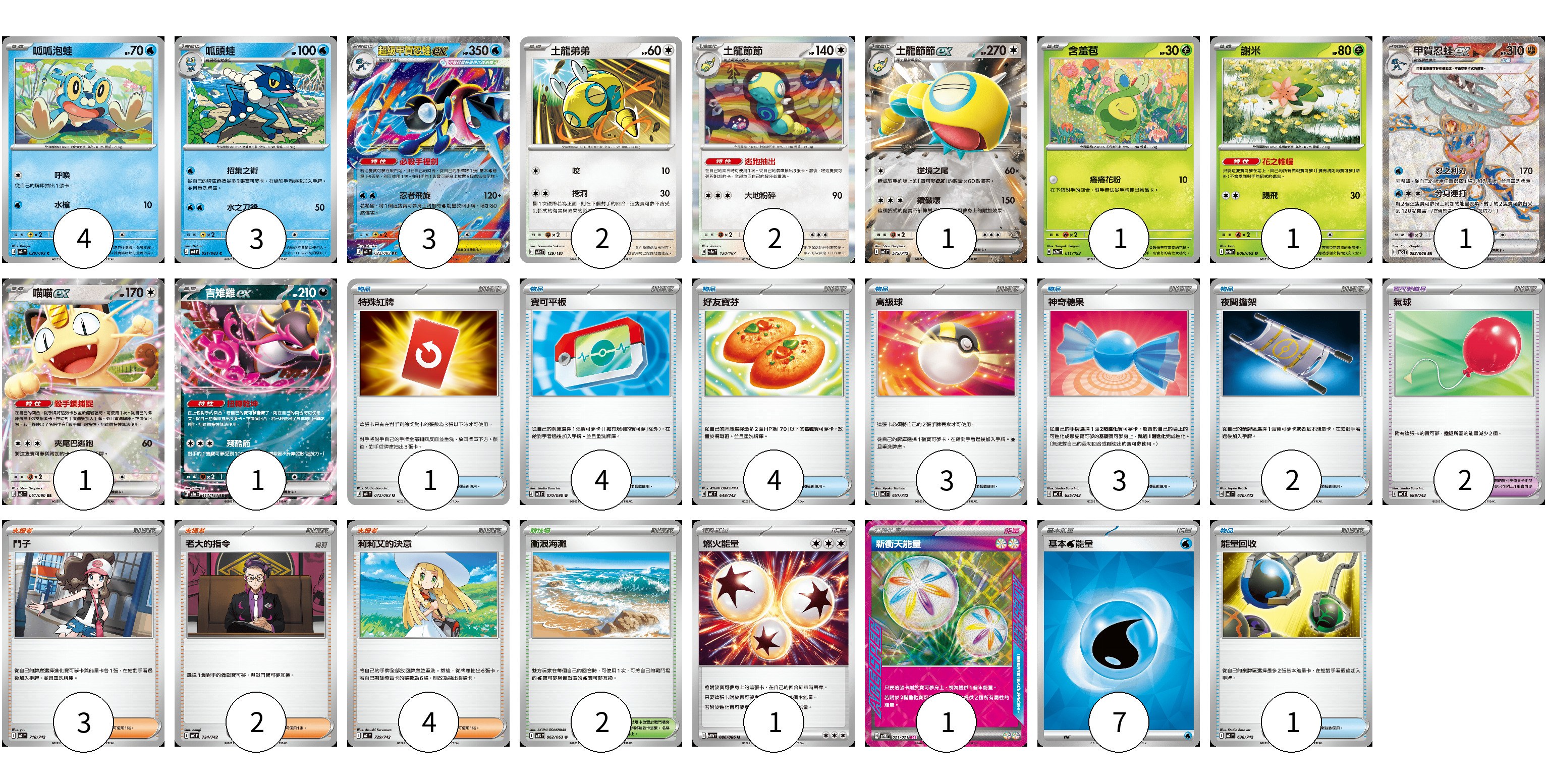牌組構築方案 以此牌組為基礎新構築牌組 顯示卡面 顯示列表 寶可夢卡(20) 4 3 3 2 2 1 1 1 1 1 1 寶可夢道具(2) 2 物品卡(18) 1 4 4 3 3 2 1 支援者卡(9) 3 2 4 競技場卡(2) 2 能量卡(9) 1 1 7 寶可夢卡(20) 卡牌名稱 張數 卡牌名稱 張數 呱呱泡蛙 M4 020/083 04 呱頭蛙 M4 021/083 03 超級甲賀忍蛙ex M4 022/083 03 土龍弟弟 SV8a 129/187 02 土龍節節 SV8a 130/187 02 土龍節節ex MC 575/742 01 含羞苞 M2a 011/193 01 謝米 SV9a 006/063 01 甲賀忍蛙ex SV5a 083/066 01 喵喵ex M3 061/080 01 吉雉雞ex M2a 114/193 01 寶可夢道具(2) 卡牌名稱 張數 卡牌名稱 張數 氣球 MC 688/742 02 物品卡(18) 卡牌名稱 張數 卡牌名稱 張數 特殊紅牌 M4 072/083 01 寶可平板 M3 070/080 04 好友寶芬 MC 648/742 04 高級球 MC 651/742 03 神奇糖果 MC 655/742 03 夜間擔架 MC 670/742 02 能量回收 MC 636/742 01 支援者卡(9) 卡牌名稱 張數 卡牌名稱 張數 鬥子 MC 718/742 03 老大的指令 MC 724/742 02 莉莉艾的決意 MC 729/742 04 競技場卡(2) 卡牌名稱 張數 卡牌名稱 張數 衝浪海灘 M1S 062/063 02 能量卡(9) 卡牌名稱 張數 卡牌名稱 張數 燃火能量 SV11W 086/086 01 新衝天能量 SV5K 071/071 01 基本【水】能量 SVM WAT 07 以此牌組為基礎新構築牌組 牌組編碼 WlvsDw-siNujg-kVSvcV copy 列印牌組單 牌組編碼已複製 分享至SNS