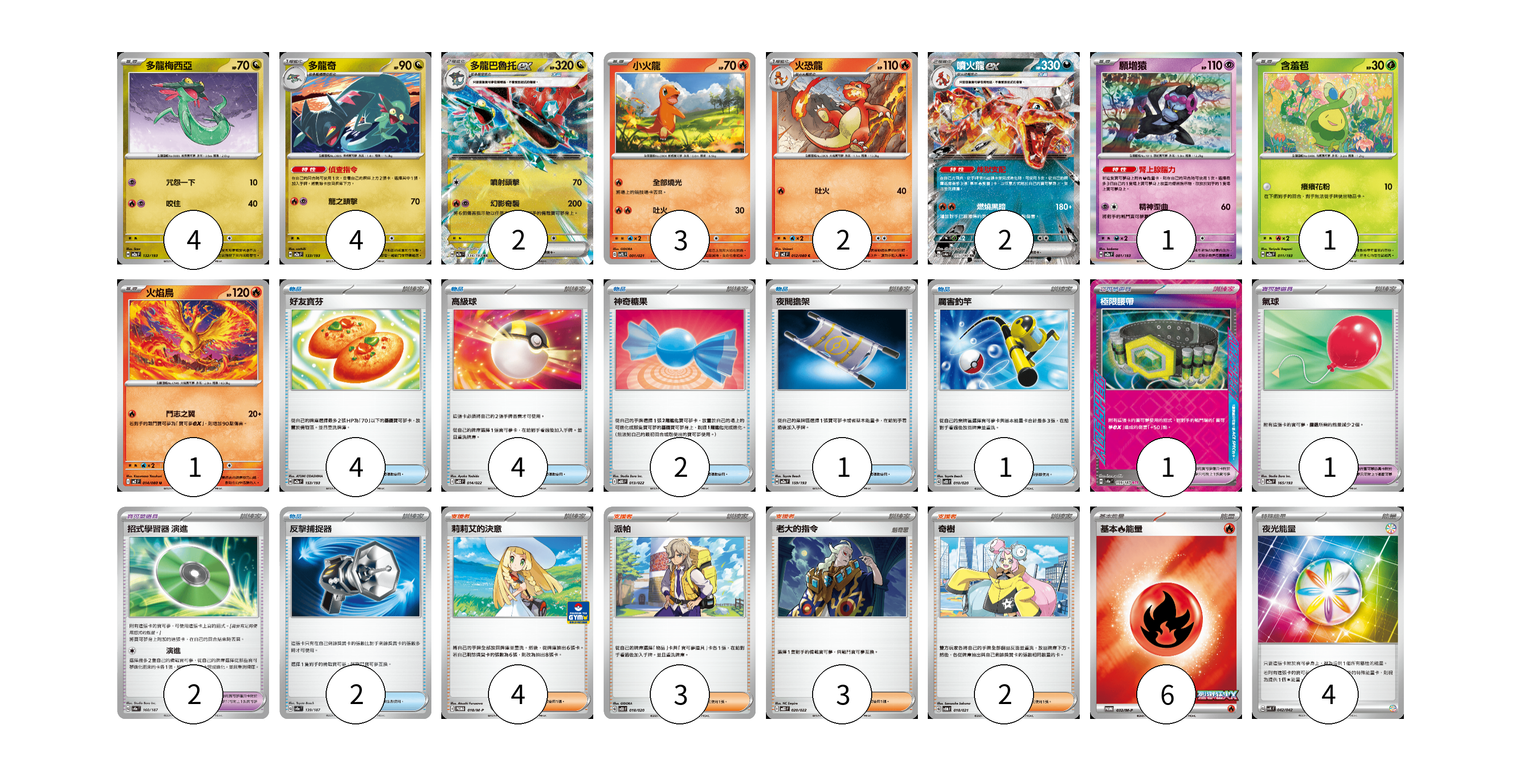 牌組構築方案 以此牌組為基礎新構築牌組 顯示卡面 顯示列表 寶可夢卡(20) 4 4 2 3 2 2 1 1 1 寶可夢道具(4) 1 1 2 物品卡(14) 4 4 2 1 1 2 支援者卡(12) 4 3 3 2 能量卡(10) 6 4 寶可夢卡(20) 卡牌名稱 張數 卡牌名稱 張數 多龍梅西亞 M2a 132/193 04 多龍奇 M2a 133/193 04 多龍巴魯托ex M2a 134/193 02 小火龍 SVTL 001/021 03 火恐龍 M2 012/080 02 噴火龍ex SV4a 115/190 02 願增猿 M2a 081/193 01 含羞苞 M2a 011/193 01 火焰鳥 M2 014/080 01 寶可夢道具(4) 卡牌名稱 張數 卡牌名稱 張數 極限腰帶 SV8a 159/187 01 氣球 M2a 165/193 01 招式學習器 演進 SV8a 160/187 02 物品卡(14) 卡牌名稱 張數 卡牌名稱 張數 好友寶芬 M2a 153/193 04 高級球 MBD 014/022 04 神奇糖果 MBG 013/022 02 夜間擔架 M2a 159/193 01 厲害釣竿 SVOD 010/020 01 反擊捕捉器 SV8a 139/187 02 支援者卡(12) 卡牌名稱 張數 卡牌名稱 張數 莉莉艾的決意 M-P 018/M-P 04 派帕 SVOD 018/020 03 老大的指令 MBD 020/022 03 奇樹 SVOM 018/021 02 能量卡(10) 卡牌名稱 張數 卡牌名稱 張數 基本【火】能量 M-P 032/M-P 06 夜光能量 SVK 042/042 04 以此牌組為基礎新構築牌組 牌組編碼 WmUsmB-jOcFKy-pGLFeH copy 列印牌組單 牌組編碼已複製 分享至SNS