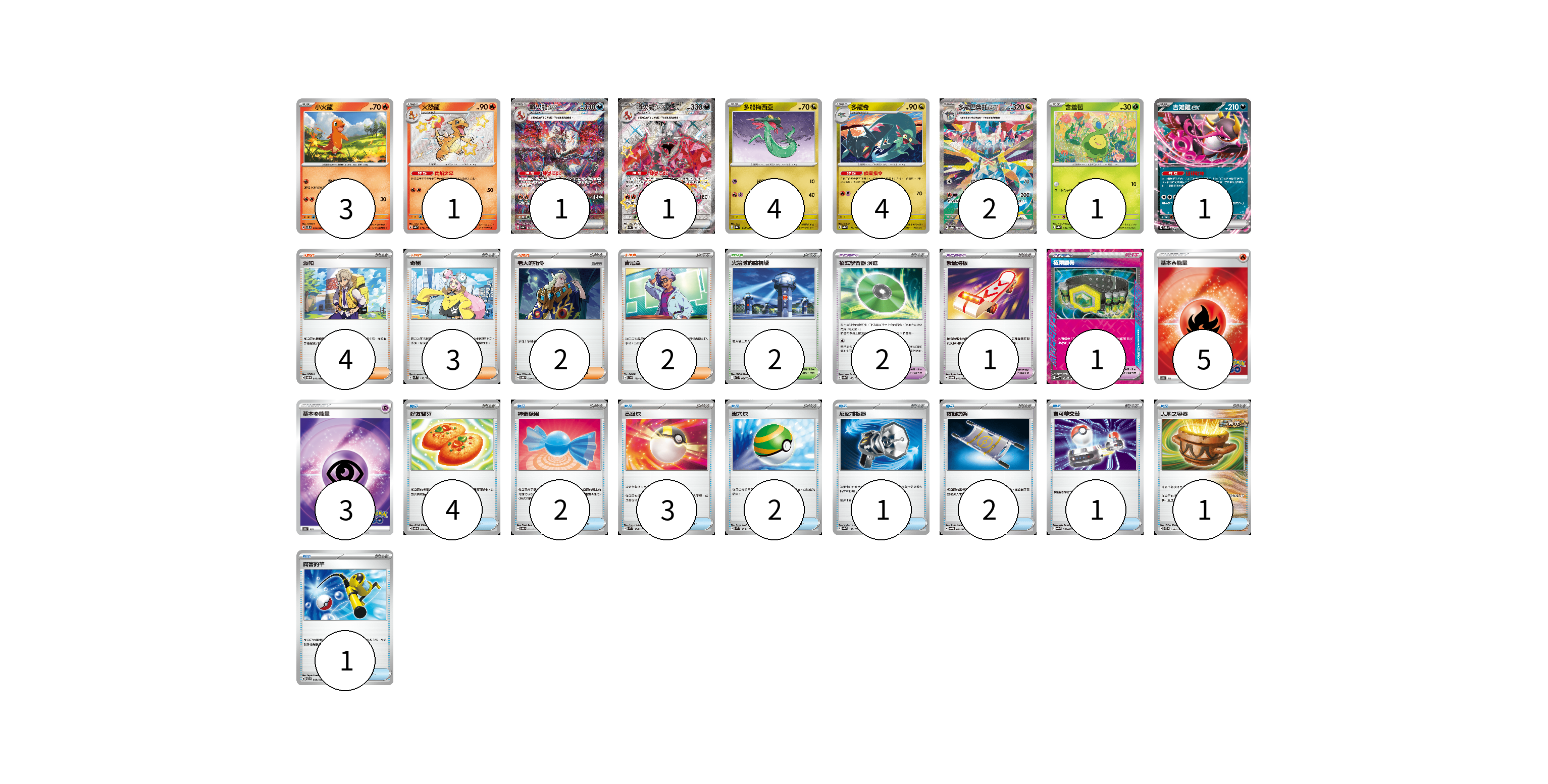 牌組構築方案 以此牌組為基礎新構築牌組 顯示卡面 顯示列表 寶可夢卡(18) 3 1 1 1 4 4 2 1 1 寶可夢道具(4) 2 1 1 物品卡(17) 4 2 3 2 1 2 1 1 1 支援者卡(11) 4 3 2 2 競技場卡(2) 2 能量卡(8) 5 3 寶可夢卡(18) 卡牌名稱 張數 卡牌名稱 張數 小火龍 SVTL 001/021 03 火恐龍 SV4a 211/190 01 噴火龍ex SV4a 349/190 01 噴火龍ex SV4a 331/190 01 多龍梅西亞 SV8a 118/187 04 多龍奇 SV8a 119/187 04 多龍巴魯托ex SV8a 221/187 02 含羞苞 SV8a 001/187 01 吉雉雞ex SVOD 004/020 01 寶可夢道具(4) 卡牌名稱 張數 卡牌名稱 張數 招式學習器 演進 SV8a 160/187 02 緊急滑板 SVOD 015/020 01 極限腰帶 SV5K 066/071 01 物品卡(17) 卡牌名稱 張數 卡牌名稱 張數 好友寶芬 SVOD 011/020 04 神奇糖果 SVOD 013/020 02 高級球 SVM 134/175 03 巢穴球 SVM 133/175 02 反擊捕捉器 SV8a 139/187 01 夜間擔架 SVOM 016/021 02 寶可夢交替 SV9a 058/063 01 大地之容器 SVTG 010/019 01 厲害釣竿 SVTG 009/019 01 支援者卡(11) 卡牌名稱 張數 卡牌名稱 張數 派帕 SVOD 018/020 04 奇樹 SVM 160/175 03 老大的指令 SVOD 019/020 02 吉尼亞 SVD 129/139 02 競技場卡(2) 卡牌名稱 張數 卡牌名稱 張數 火箭隊的監視塔 SV10 096/098 02 能量卡(8) 卡牌名稱 張數 卡牌名稱 張數 基本火能量 S10b FIR 05 基本超能量 S10b PSY 03 以此牌組為基礎新構築牌組 牌組編碼 WmVjZh-MkyZFn-wMVOUG copy 列印牌組單 牌組編碼已複製 分享至SNS