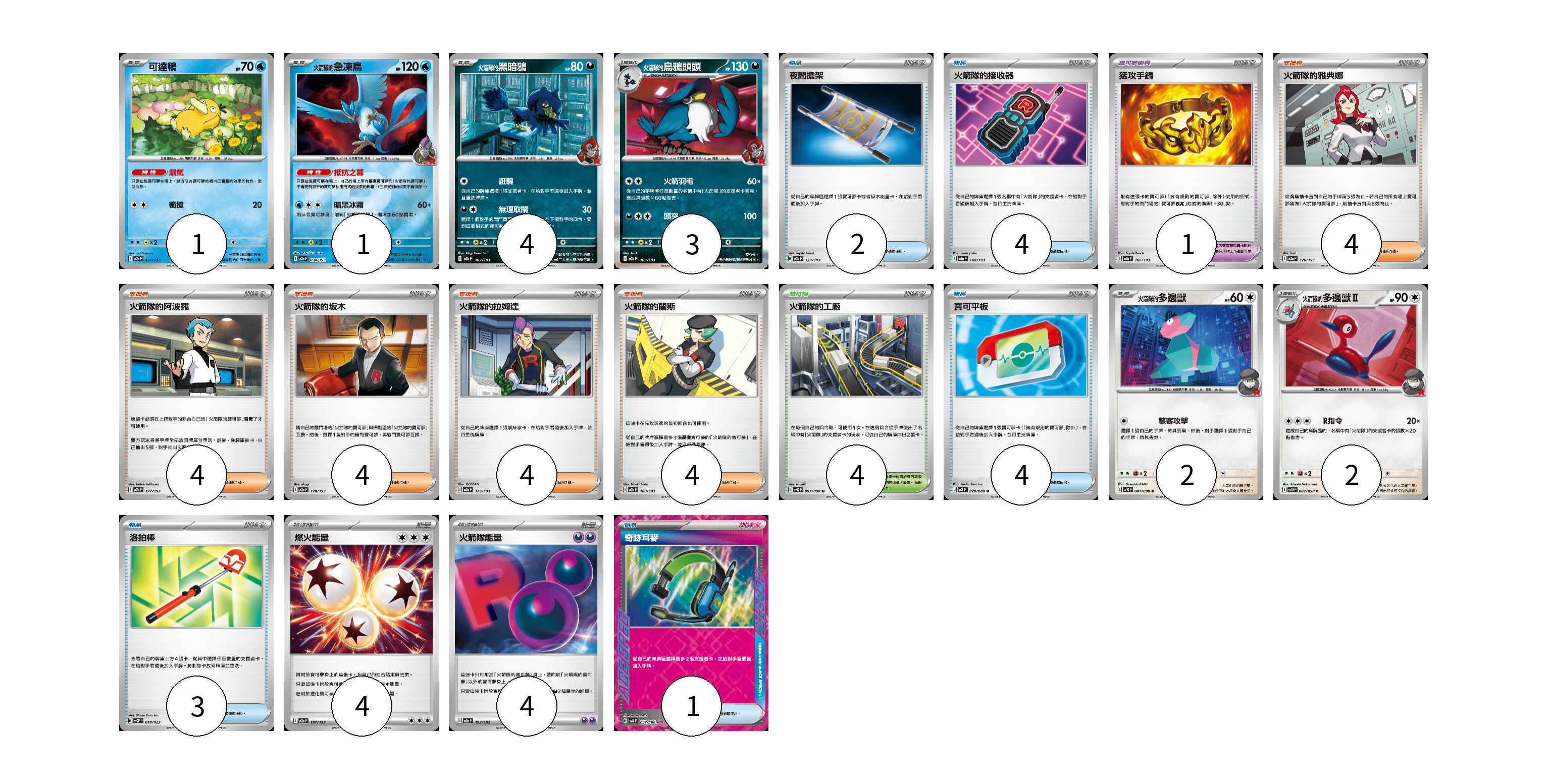 牌組構築方案 以此牌組為基礎新構築牌組 顯示卡面 顯示列表 寶可夢卡(13) 1 1 4 3 2 2 寶可夢道具(1) 1 物品卡(14) 2 4 4 3 1 支援者卡(20) 4 4 4 4 4 競技場卡(4) 4 能量卡(8) 4 4 寶可夢卡(13) 卡牌名稱 張數 卡牌名稱 張數 可達鴨 M2a 032/193 01 <火箭隊的>急凍鳥 M2a 034/193 01 <火箭隊的>黑暗鴉 M2a 102/193 04 火箭隊的烏鴉頭頭 M2a 103/193 03 <火箭隊的>多邊獸 SV10 081/098 02 <火箭隊的>多邊獸Ⅱ SV10 082/098 02 寶可夢道具(1) 卡牌名稱 張數 卡牌名稱 張數 猛攻手鐲 M2a 166/193 01 物品卡(14) 卡牌名稱 張數 卡牌名稱 張數 夜間擔架 M2a 159/193 02 火箭隊的接收器 M2a 160/193 04 寶可平板 M3 070/080 04 洛拍棒 SVQP 018/023 03 奇跡耳麥 SV8 097/106 01 支援者卡(20) 卡牌名稱 張數 卡牌名稱 張數 火箭隊的雅典娜 M2a 176/193 04 火箭隊的阿波羅 M2a 177/193 04 火箭隊的坂木 M2a 178/193 04 火箭隊的拉姆達 M2a 179/193 04 火箭隊的蘭斯 M2a 180/193 04 競技場卡(4) 卡牌名稱 張數 卡牌名稱 張數 火箭隊的工廠 SV10 097/098 04 能量卡(8) 卡牌名稱 張數 卡牌名稱 張數 燃火能量 M2a 191/193 04 火箭隊能量 M2a 193/193 04 以此牌組為基礎新構築牌組 牌組編碼 WnOTGZ-mJdoPG-AWmuEk copy 列印牌組單 牌組編碼已複製 分享至SNS