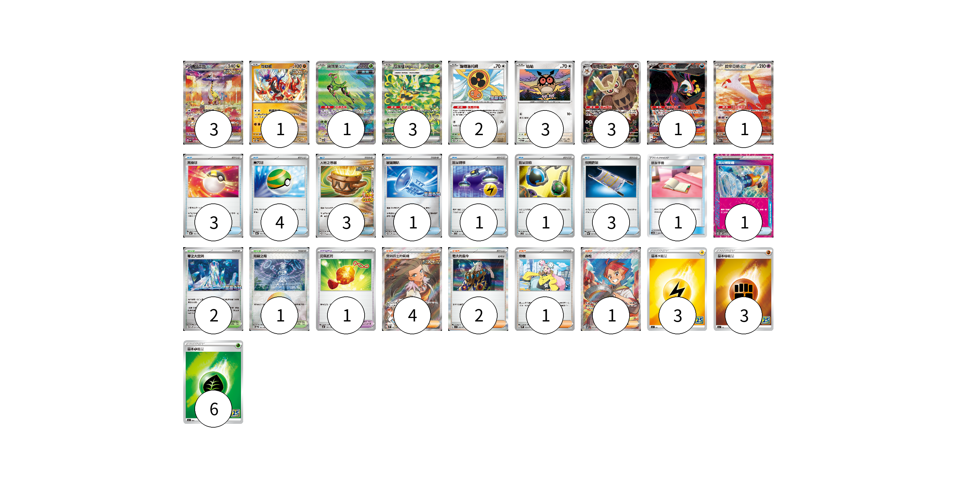 牌組構築方案 以此牌組為基礎新構築牌組 顯示卡面 顯示列表 寶可夢卡(18) 3 1 1 3 2 3 3 1 1 寶可夢道具(1) 1 物品卡(18) 3 4 3 1 1 1 3 1 1 支援者卡(8) 4 2 1 1 競技場卡(3) 2 1 能量卡(12) 3 3 6 寶可夢卡(18) 卡牌名稱 張數 卡牌名稱 張數 猛雷鼓ex SV5K 095/071 03 故勒頓 SV8 069/106 01 鐵斑葉ex SV5M 093/071 01 厄鬼椪 碧草面具ex SV6 125/101 03 旋轉洛托姆 SV-P 146/SV-P 02 咕咕 SV7 076/102 03 貓頭夜鷹 SV7 114/102 03 吉雉雞ex SV6a 089/064 01 拉帝亞斯ex SV7a 087/064 01 寶可夢道具(1) 卡牌名稱 張數 卡牌名稱 張數 勇氣護符 SV4a 169/190 01 物品卡(18) 卡牌名稱 張數 卡牌名稱 張數 高級球 SV4a 161/190 03 巢穴球 SV4a 159/190 04 大地之容器 SV-P 084/SV-P 03 玻璃喇叭 SV-P 149/SV-P 01 能量轉移 SVD 111/139 01 能量回收 SVD 110/139 01 夜間擔架 SV6a 056/064 03 朋友手冊 AS6b 188/194 01 頂尖捕捉器 SV5M 062/071 01 支援者卡(8) 卡牌名稱 張數 卡牌名稱 張數 奧琳博士的氣魄 SV4K 085/066 04 老大的指令 SV1a 069/073 02 奇樹 SV2D 069/071 01 赤松 SV7 123/102 01 競技場卡(3) 卡牌名稱 張數 卡牌名稱 張數 零之大空洞 SV-P 151/SV-P 02 阻礙之塔 SV8a 181/187 01 能量卡(12) 卡牌名稱 張數 卡牌名稱 張數 基本雷能量 S8a LIG 03 基本鬥能量 S8a FIG 03 基本草能量 S8a GRA 06 以此牌組為基礎新構築牌組 牌組編碼 WoBnOt-GpoJUX-SNRRjX copy 列印牌組單 牌組編碼已複製 分享至SNS