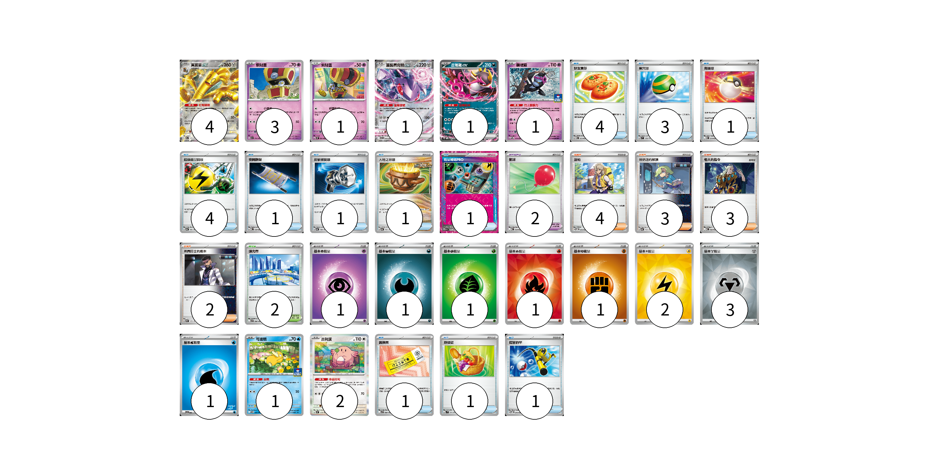 牌組構築方案 以此牌組為基礎新構築牌組 顯示卡面 顯示列表 寶可夢卡(14) 4 3 1 1 1 1 1 2 物品卡(21) 4 3 1 4 1 1 1 1 2 1 1 1 支援者卡(12) 4 3 3 2 競技場卡(2) 2 能量卡(11) 1 1 1 1 1 2 3 1 寶可夢卡(14) 卡牌名稱 張數 卡牌名稱 張數 賽富豪ex SV8a 117/187 04 索財靈 SV7a 024/064 03 索財靈 SV3a 020/062 01 蓋諾賽克特ex SV11B 069/086 01 吉雉雞ex SVOD 004/020 01 願增猿 M-P 014/M-P 01 可達鴨 SV-P 220/SV-P 01 吉利蛋 SV2a 113/165 02 物品卡(21) 卡牌名稱 張數 卡牌名稱 張數 好友寶芬 MBD 013/022 04 巢穴球 SVM 133/175 03 高級球 MBD 014/022 01 超級能量回收 SV8a 141/187 04 夜間擔架 MBD 016/022 01 反擊捕捉器 SV8a 139/187 01 大地之容器 SV8a 143/187 01 能量輸送PRO SV7a 052/064 01 氣球 MBD 018/022 02 調換票 SV9 090/100 01 野餐籃 SV1V 071/078 01 厲害釣竿 SVOD 010/020 01 支援者卡(12) 卡牌名稱 張數 卡牌名稱 張數 派帕 SVOD 018/020 04 暗碼迷的解讀 SV8a 165/187 03 老大的指令 MBD 020/022 03 弗圖博士的劇本 SV8a 175/187 02 競技場卡(2) 卡牌名稱 張數 卡牌名稱 張數 釀光市 SV9 098/100 02 能量卡(11) 卡牌名稱 張數 卡牌名稱 張數 基本【超】能量 MBD PSY 01 基本【惡】能量 MBG DAR 01 基本【草】能量 M-P GRA 01 基本【火】能量 SVQL FIR 01 基本【鬥】能量 M-P FIG 01 基本【雷】能量 SVQP LIG 02 基本【鋼】能量 SVOD MET 03 基本【水】能量 SVI WAT 01 以此牌組為基礎新構築牌組 牌組編碼 WpTRep-RdOyTu-sVxTiE copy 列印牌組單 牌組編碼已複製 分享至SNS