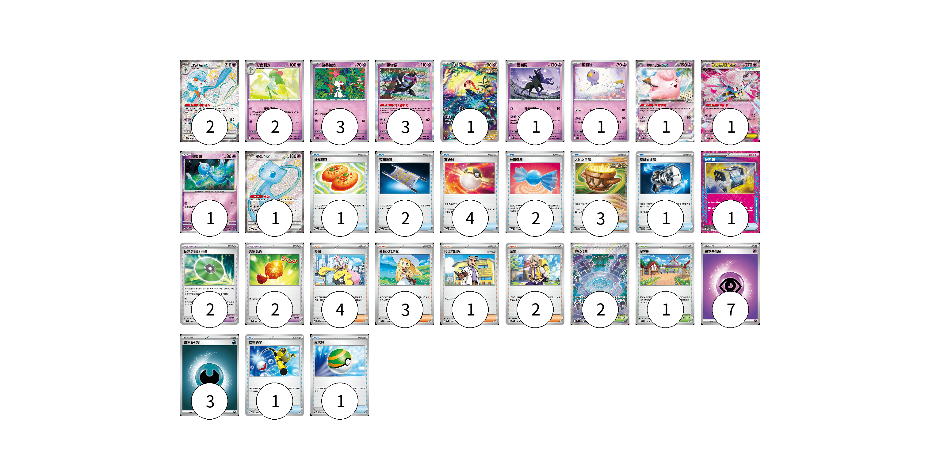 牌組構築方案 以此牌組為基礎新構築牌組 顯示卡面 顯示列表 寶可夢卡(17) 2 2 3 3 1 1 1 1 1 1 1 寶可夢道具(4) 2 2 物品卡(16) 1 2 4 2 3 1 1 1 1 支援者卡(10) 4 3 1 2 競技場卡(3) 2 1 能量卡(10) 7 3 寶可夢卡(17) 卡牌名稱 張數 卡牌名稱 張數 沙奈朵ex SV4a 328/190 02 奇魯莉安 M2a 070/193 02 拉魯拉絲 M2a 069/193 03 願增猿 M2a 081/193 03 吼叫尾 SV4K 071/066 01 靈幽馬 M2a 080/193 01 飄飄球 SVD 052/139 01 莉莉艾的皮皮ex M2a 060/193 01 超級蒂安希ex MBD 006/022 01 輕飄飄 SV11W 041/086 01 夢幻ex SV4a 327/190 01 寶可夢道具(4) 卡牌名稱 張數 卡牌名稱 張數 招式學習器 演進 SV8a 160/187 02 勇氣護符 SVM 142/175 02 物品卡(16) 卡牌名稱 張數 卡牌名稱 張數 好友寶芬 M2a 153/193 01 夜間擔架 M2a 159/193 02 高級球 MBD 014/022 04 神奇糖果 MBG 013/022 02 大地之容器 SVTS 011/022 03 反擊捕捉器 SVTS 009/022 01 秘密箱 SV6 092/101 01 厲害釣竿 SVTR 012/021 01 巢穴球 SVK 016/042 01 支援者卡(10) 卡牌名稱 張數 卡牌名稱 張數 奇樹 SVOD 016/020 04 莉莉艾的決意 M1L 062/063 03 博士的研究 SVM 162/175 01 派帕 SVOD 018/020 02 競技場卡(3) 卡牌名稱 張數 卡牌名稱 張數 神秘花園 M1S 086/063 02 深缽鎮 SV1a 070/073 01 能量卡(10) 卡牌名稱 張數 卡牌名稱 張數 基本【超】能量 MBD PSY 07 基本【惡】能量 MBG DAR 03 以此牌組為基礎新構築牌組 牌組編碼 WrDQLS-yOwnPp-YkFxog copy 列印牌組單 牌組編碼已複製 分享至SNS