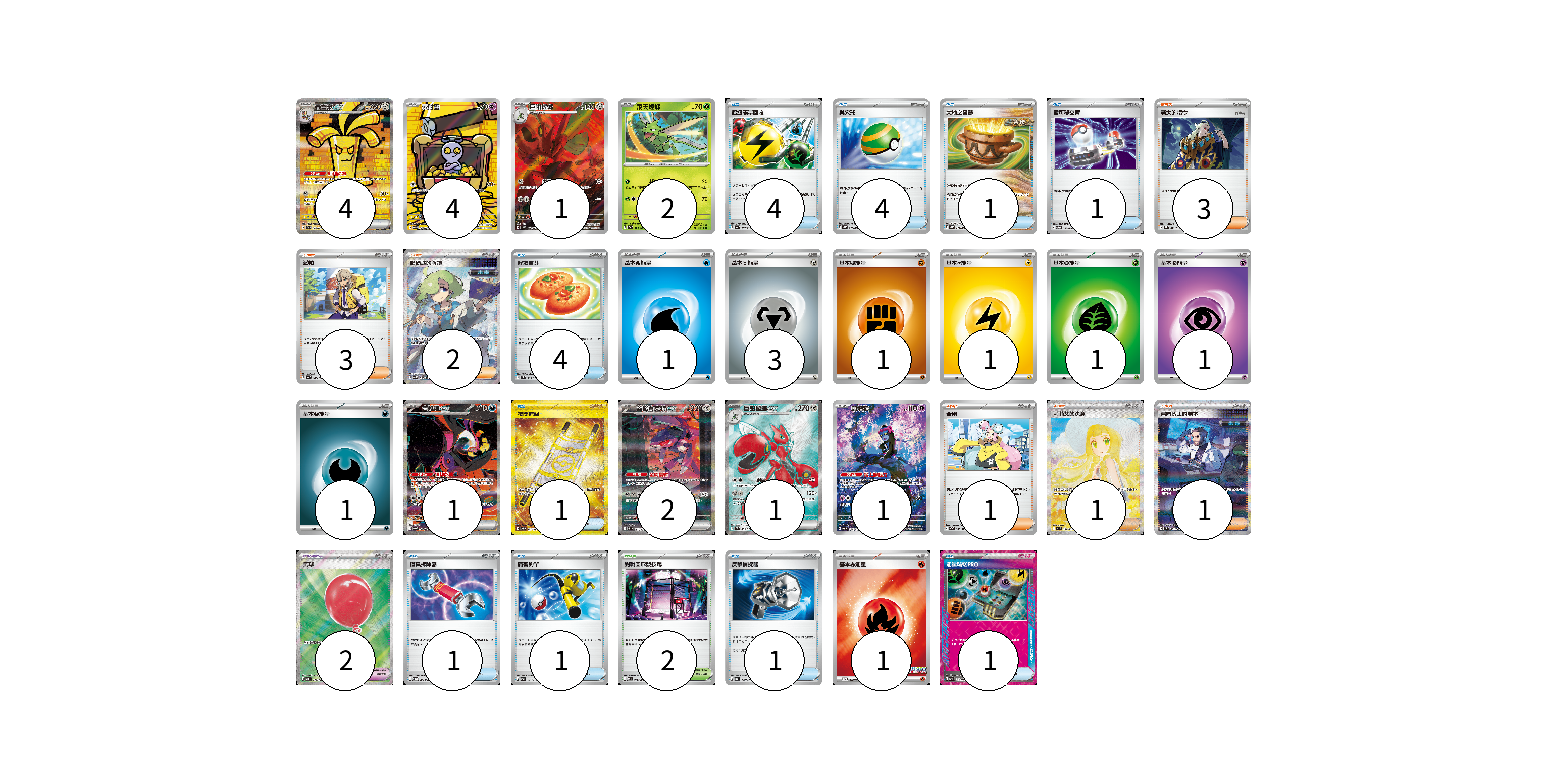 牌組構築方案 以此牌組為基礎新構築牌組 顯示卡面 顯示列表 寶可夢卡(16) 4 4 1 2 1 2 1 1 寶可夢道具(2) 2 物品卡(19) 4 4 1 1 4 1 1 1 1 1 支援者卡(11) 3 3 2 1 1 1 競技場卡(2) 2 能量卡(10) 1 3 1 1 1 1 1 1 寶可夢卡(16) 卡牌名稱 張數 卡牌名稱 張數 賽富豪ex SV3a 087/062 04 索財靈 SV3a 068/062 04 巨鉗螳螂 SV3 116/108 01 飛天螳螂 SV2a 123/165 02 吉雉雞ex SV6a 089/064 01 蓋諾賽克特ex SV11B 172/086 02 巨鉗螳螂ex SV5M 089/071 01 願增猿 SV6 107/101 01 寶可夢道具(2) 卡牌名稱 張數 卡牌名稱 張數 氣球 M1L 084/063 02 物品卡(19) 卡牌名稱 張數 卡牌名稱 張數 超級能量回收 SV4a 157/190 04 巢穴球 SVHK 012/022 04 大地之容器 SVHK 011/022 01 寶可夢交替 SV5a 056/066 01 好友寶芬 SV5K 063/071 04 夜間擔架 SV8 137/106 01 道具拆除器 SV11W 080/086 01 厲害釣竿 SVK 011/042 01 反擊捕捉器 SV8a 139/187 01 能量輸送PRO SV7a 052/064 01 支援者卡(11) 卡牌名稱 張數 卡牌名稱 張數 老大的指令 SVHK 022/022 03 派帕 SV4a 180/190 03 暗碼迷的解讀 SV5M 090/071 02 奇樹 SV2D 069/071 01 莉莉艾的決意 M1L 091/063 01 弗圖博士的劇本 SV4M 091/066 01 競技場卡(2) 卡牌名稱 張數 卡牌名稱 張數 對戰圓形競技場 M2 079/080 02 能量卡(10) 卡牌名稱 張數 卡牌名稱 張數 基本【水】能量 SVF WAT 01 基本【鋼】能量 SVF MET 03 基本鬥能量 sv-p FIG 01 基本雷能量 sv-p LIG 01 基本草能量 sv-p GRA 01 基本超能量 sv-p PSY 01 基本惡能量 sv-p DAR 01 基本【火】能量 M-P 032/M-P 01 以此牌組為基礎新構築牌組 牌組編碼 WrsWha-hOxBlq-LapHui copy 列印牌組單 牌組編碼已複製 分享至SNS