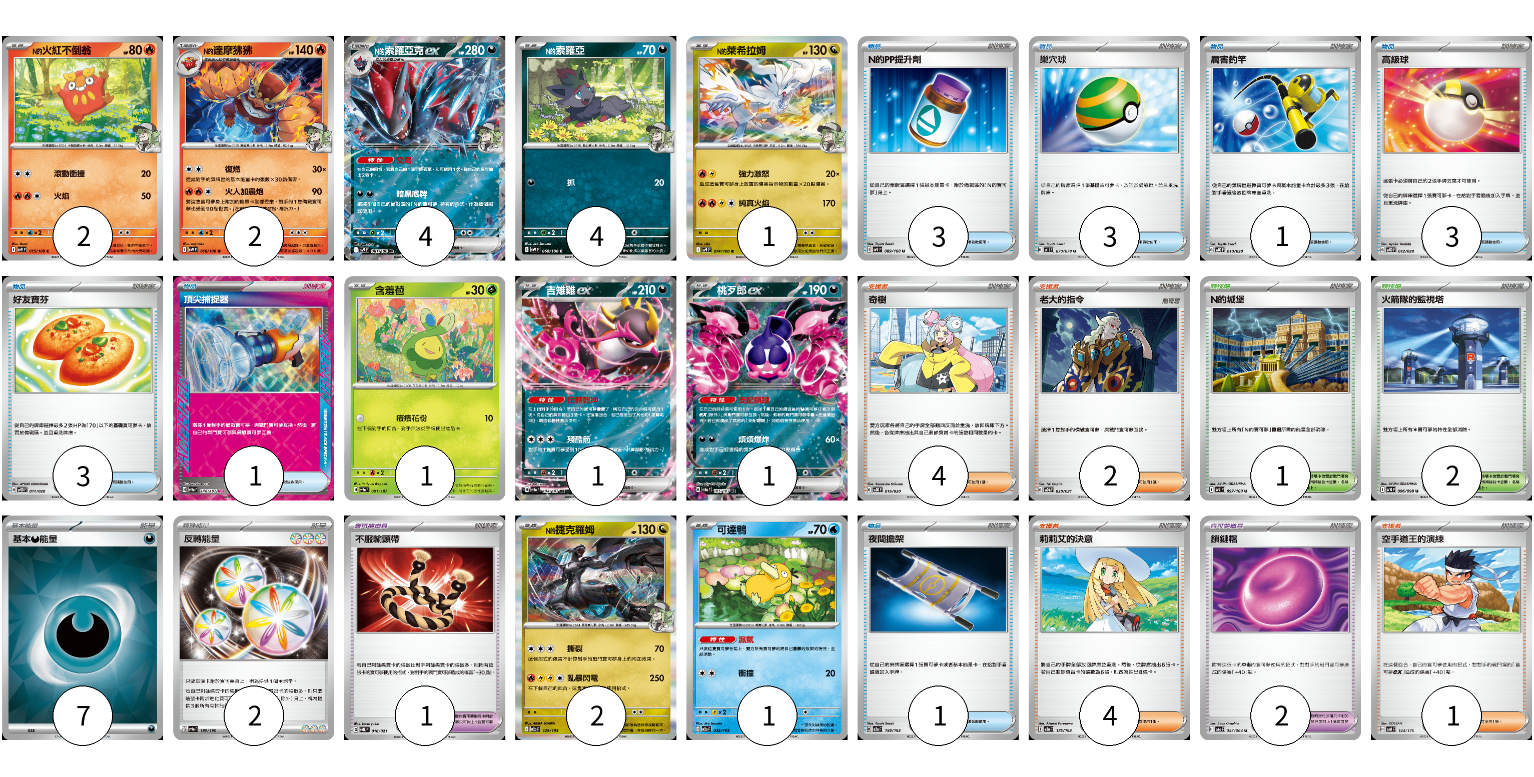 牌組構築方案 以此牌組為基礎新構築牌組 顯示卡面 顯示列表 寶可夢卡(19) 2 2 4 4 1 1 1 1 2 1 寶可夢道具(3) 1 2 物品卡(15) 3 3 1 3 3 1 1 支援者卡(11) 4 2 4 1 競技場卡(3) 1 2 能量卡(9) 7 2 寶可夢卡(19) 卡牌名稱 張數 卡牌名稱 張數 N的火紅不倒翁 SV9 015/100 02 N的達摩狒狒 SV9 016/100 02 N的索羅亞克ex SV9 061/100 04 N的索羅亞 SV9 060/100 04 N的萊希拉姆 SV9 074/100 01 含羞苞 SV8a 001/187 01 吉雉雞ex SV8a 104/187 01 桃歹郎ex SV8a 105/187 01 N的捷克羅姆 M2a 129/193 02 可達鴨 M2a 032/193 01 寶可夢道具(3) 卡牌名稱 張數 卡牌名稱 張數 不服輸頭帶 SVTL 016/021 01 鎖鏈糬 SV6a 057/064 02 物品卡(15) 卡牌名稱 張數 卡牌名稱 張數 N的PP提升劑 SV9 089/100 03 巢穴球 SV1S 070/078 03 厲害釣竿 SVOD 010/020 01 高級球 SVOD 012/020 03 好友寶芬 SVOD 011/020 03 頂尖捕捉器 SV8a 148/187 01 夜間擔架 M2a 159/193 01 支援者卡(11) 卡牌名稱 張數 卡牌名稱 張數 奇樹 SVOD 016/020 04 老大的指令 SVOM 020/021 02 莉莉艾的決意 M2a 175/193 04 空手道王的演練 SVM 144/175 01 競技場卡(3) 卡牌名稱 張數 卡牌名稱 張數 N的城堡 SV9 097/100 01 火箭隊的監視塔 SV10 096/098 02 能量卡(9) 卡牌名稱 張數 卡牌名稱 張數 基本【惡】能量 SVOM DAR 07 反轉能量 SV4a 189/190 02 以此牌組為基礎新構築牌組 牌組編碼 WtAnzR-sRQcny-MLOkiN copy 列印牌組單 牌組編碼已複製 分享至SNS