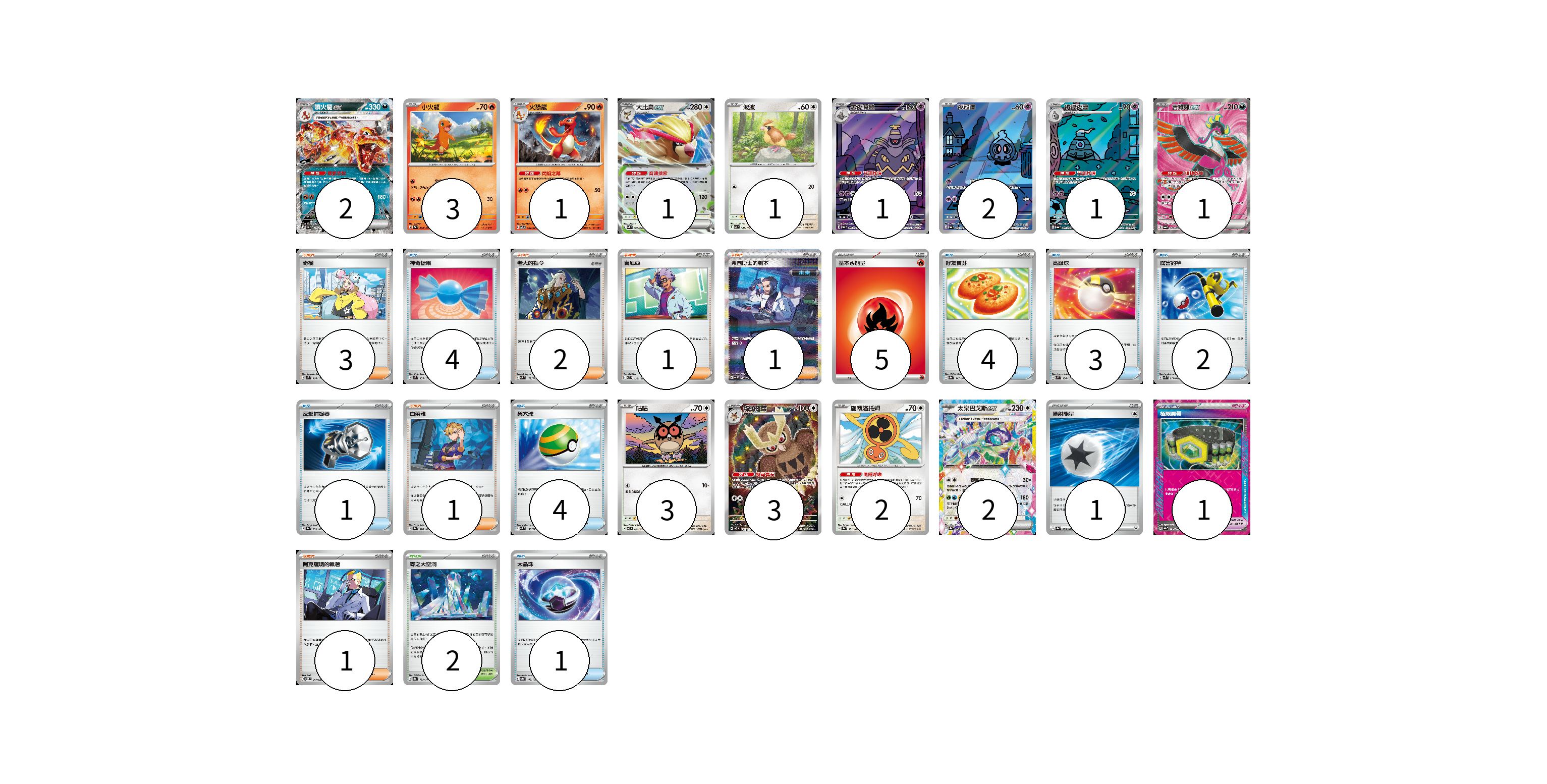 牌組構築方案 以此牌組為基礎新構築牌組 顯示卡面 顯示列表 寶可夢卡(23) 2 3 1 1 1 1 2 1 1 3 3 2 2 寶可夢道具(1) 1 物品卡(19) 4 4 3 2 1 4 1 支援者卡(9) 3 2 1 1 1 1 競技場卡(2) 2 能量卡(6) 5 1 寶可夢卡(23) 卡牌名稱 張數 卡牌名稱 張數 噴火龍ex SV4a 115/190 02 小火龍 SV2a 004/165 03 火恐龍 SVTL 002/021 01 大比鳥ex SVK 005/042 01 波波 SV3 087/108 01 黑夜魔靈 SV6a 070/064 01 夜巡靈 SV6a 068/064 02 彷徨夜靈 SV6a 069/064 01 吉雉雞ex SV6a 081/064 01 咕咕 SV7 076/102 03 貓頭夜鷹 SV7 114/102 03 旋轉洛托姆 SV8a 131/187 02 太樂巴戈斯ex SV8a 136/187 02 寶可夢道具(1) 卡牌名稱 張數 卡牌名稱 張數 極限腰帶 SV8a 159/187 01 物品卡(19) 卡牌名稱 張數 卡牌名稱 張數 神奇糖果 SVM 135/175 04 好友寶芬 SV8a 147/187 04 高級球 SVM 134/175 03 厲害釣竿 SVK 011/042 02 反擊捕捉器 SV8a 139/187 01 巢穴球 SVM 133/175 04 太晶珠 SV8a 145/187 01 支援者卡(9) 卡牌名稱 張數 卡牌名稱 張數 奇樹 SVM 160/175 03 老大的指令 SVM 172/175 02 吉尼亞 SVD 129/139 01 弗圖博士的劇本 SV4M 091/066 01 白蕾雅 SV8a 176/187 01 阿克羅瑪的執著 SVOM 017/021 01 競技場卡(2) 卡牌名稱 張數 卡牌名稱 張數 零之大空洞 SV8a 182/187 02 能量卡(6) 卡牌名稱 張數 卡牌名稱 張數 基本【火】能量 SVTL FIR 05 噴射能量 SV8a 185/187 01 以此牌組為基礎新構築牌組 牌組編碼 WuyhVN-nIHhqV-QOFNeM copy 列印牌組單 牌組編碼已複製 分享至SNS
