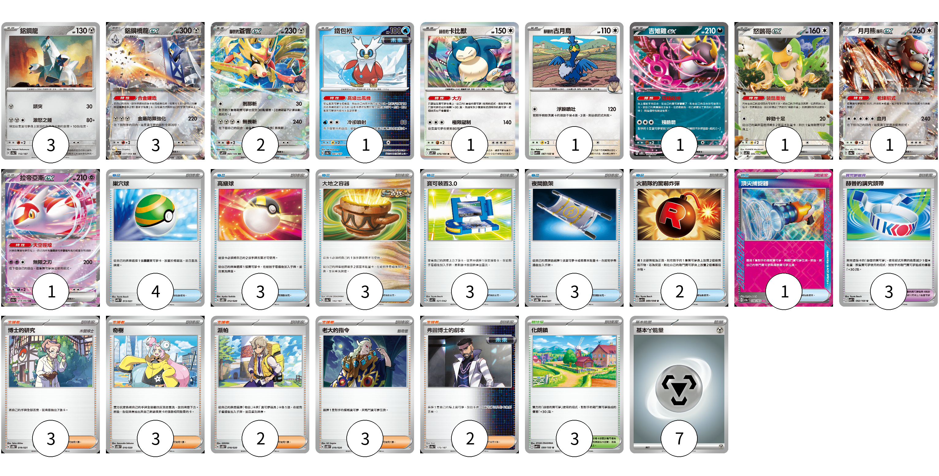牌組構築方案 以此牌組為基礎新構築牌組 顯示卡面 顯示列表 寶可夢卡(15) 3 3 2 1 1 1 1 1 1 1 寶可夢道具(3) 3 物品卡(19) 4 3 3 3 3 2 1 支援者卡(13) 3 3 2 3 2 競技場卡(3) 3 能量卡(7) 7 寶可夢卡(15) 卡牌名稱 張數 卡牌名稱 張數 鋁鋼龍 SV8a 112/187 03 鋁鋼橋龍ex SV7a 037/064 03 赫普的蒼響ex SV9 069/100 02 鐵包袱 SV8a 047/187 01 赫普的卡比獸 SV9 075/100 01 赫普的古月鳥 SV9 087/100 01 吉雉雞ex SVOD 004/020 01 怒鸚哥ex SVK 006/042 01 月月熊 赫月ex SV8a 134/187 01 拉帝亞斯ex SV7a 019/064 01 寶可夢道具(3) 卡牌名稱 張數 卡牌名稱 張數 赫普的講究頭帶 SV9 092/100 03 物品卡(19) 卡牌名稱 張數 卡牌名稱 張數 巢穴球 SVTR 013/021 04 高級球 SVOD 012/020 03 大地之容器 SV8a 143/187 03 寶可裝置3.0 SVK 021/042 03 夜間擔架 SVOM 016/021 03 火箭隊的驚嚇炸彈 SV10 089/098 02 頂尖捕捉器 SV8a 148/187 01 支援者卡(13) 卡牌名稱 張數 卡牌名稱 張數 博士的研究 SVOM 019/021 03 奇樹 SVOD 016/020 03 派帕 SVOD 018/020 02 老大的指令 SVOD 019/020 03 弗圖博士的劇本 SV8a 175/187 02 競技場卡(3) 卡牌名稱 張數 卡牌名稱 張數 化朗鎮 SV9 099/100 03 能量卡(7) 卡牌名稱 張數 卡牌名稱 張數 基本【鋼】能量 SVTH MET 07 以此牌組為基礎新構築牌組 牌組編碼 WymVgI-xJOTdU-XtzqQz copy 列印牌組單 牌組編碼已複製 分享至SNS