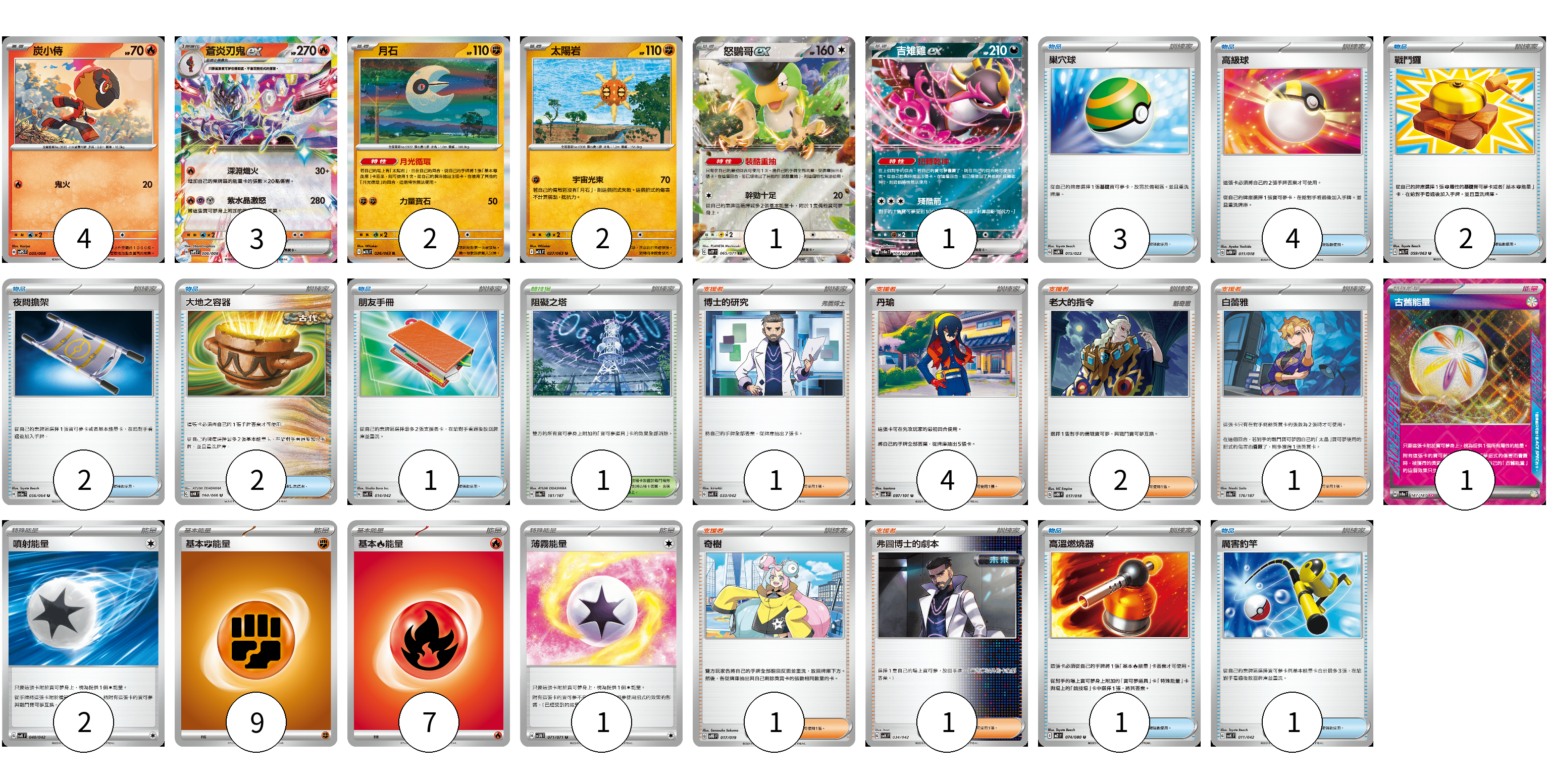 牌組構築方案 以此牌組為基礎新構築牌組 顯示卡面 顯示列表 寶可夢卡(13) 4 3 2 2 1 1 物品卡(16) 3 4 2 2 2 1 1 1 支援者卡(10) 1 4 2 1 1 1 競技場卡(1) 1 能量卡(20) 1 2 9 7 1 寶可夢卡(13) 卡牌名稱 張數 卡牌名稱 張數 炭小侍 SVPS 005/008 04 蒼炎刃鬼ex SVPS 006/008 03 月石 M1L 026/063 02 太陽岩 M1L 027/063 02 怒鸚哥ex SV2P 065/071 01 吉雉雞ex SV8a 104/187 01 物品卡(16) 卡牌名稱 張數 卡牌名稱 張數 巢穴球 SVAM 015/023 03 高級球 SVTH 011/018 04 戰鬥鑼 M1L 059/063 02 夜間擔架 SV6a 056/064 02 大地之容器 SV4K 060/066 02 朋友手冊 SVK 014/042 01 高溫燃燒器 M2 074/080 01 厲害釣竿 SVK 011/042 01 支援者卡(10) 卡牌名稱 張數 卡牌名稱 張數 博士的研究 SVK 033/042 01 丹瑜 SV6 097/101 04 老大的指令 SVTH 017/018 02 白蕾雅 SV8a 176/187 01 奇樹 SVTG 017/019 01 弗圖博士的劇本 SVK 034/042 01 競技場卡(1) 卡牌名稱 張數 卡牌名稱 張數 阻礙之塔 SV8a 181/187 01 能量卡(20) 卡牌名稱 張數 卡牌名稱 張數 古舊能量 SV8a 187/187 01 噴射能量 SVK 040/042 02 基本【鬥】能量 SVTG FIG 09 基本【火】能量 SVTL FIR 07 薄霧能量 SV5M 071/071 01 以此牌組為基礎新構築牌組 牌組編碼 WzBcML-akunUt-CpxfuU copy 列印牌組單 牌組編碼已複製 分享至SNS