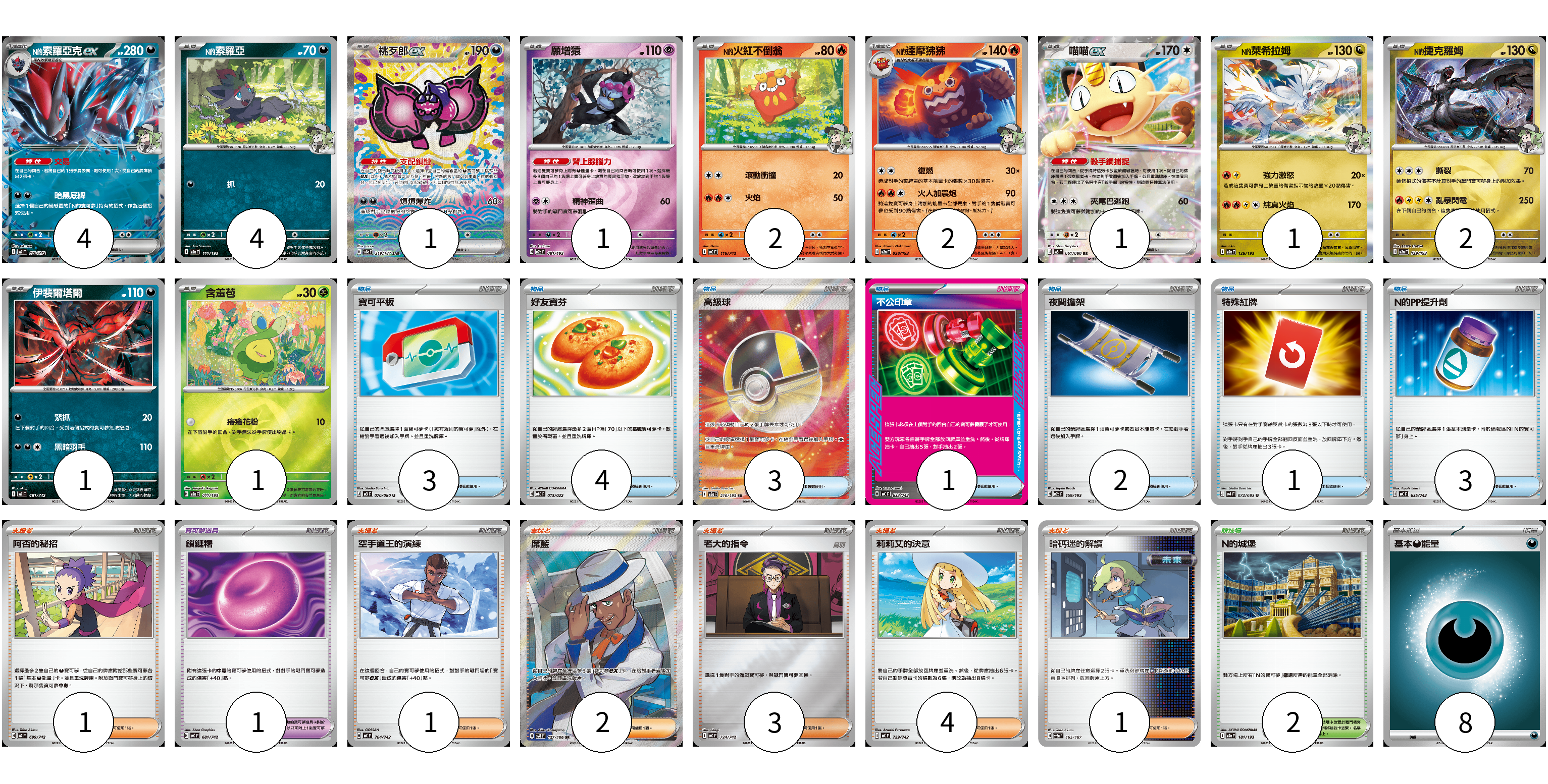 牌組構築方案 以此牌組為基礎新構築牌組 顯示卡面 顯示列表 寶可夢卡(20) 4 4 1 1 2 2 1 1 2 1 1 寶可夢道具(1) 1 物品卡(17) 3 4 3 1 2 1 3 支援者卡(12) 1 1 2 3 4 1 競技場卡(2) 2 能量卡(8) 8 寶可夢卡(20) 卡牌名稱 張數 卡牌名稱 張數 N的索羅亞克ex MC 470/742 04 N的索羅亞 M2a 111/193 04 桃歹郎ex SV8a 219/187 01 願增猿 M2a 081/193 01 N的火紅不倒翁 MC 118/742 02 N的達摩狒狒 M2a 028/193 02 喵喵ex M3 061/080 01 N的萊希拉姆 M2a 128/193 01 N的捷克羅姆 M2a 129/193 02 伊裴爾塔爾 MC 481/742 01 含羞苞 M2a 011/193 01 寶可夢道具(1) 卡牌名稱 張數 卡牌名稱 張數 鎖鏈糬 MC 681/742 01 物品卡(17) 卡牌名稱 張數 卡牌名稱 張數 寶可平板 M3 070/080 03 好友寶芬 MBD 013/022 04 高級球 M2a 216/193 03 不公印章 MC 633/742 01 夜間擔架 M2a 159/193 02 特殊紅牌 M4 072/083 01 N的PP提升劑 MC 635/742 03 支援者卡(12) 卡牌名稱 張數 卡牌名稱 張數 阿杏的秘招 MC 699/742 01 空手道王的演練 MC 704/742 01 席藍 SV8 127/106 02 老大的指令 MC 724/742 03 莉莉艾的決意 MC 729/742 04 暗碼迷的解讀 SV8a 165/187 01 競技場卡(2) 卡牌名稱 張數 卡牌名稱 張數 N的城堡 M2a 181/193 02 能量卡(8) 卡牌名稱 張數 卡牌名稱 張數 基本【惡】能量 MC DAR 08 以此牌組為基礎新構築牌組 牌組編碼 WznRas-FBaKWM-nnJfmH copy 列印牌組單 牌組編碼已複製 分享至SNS