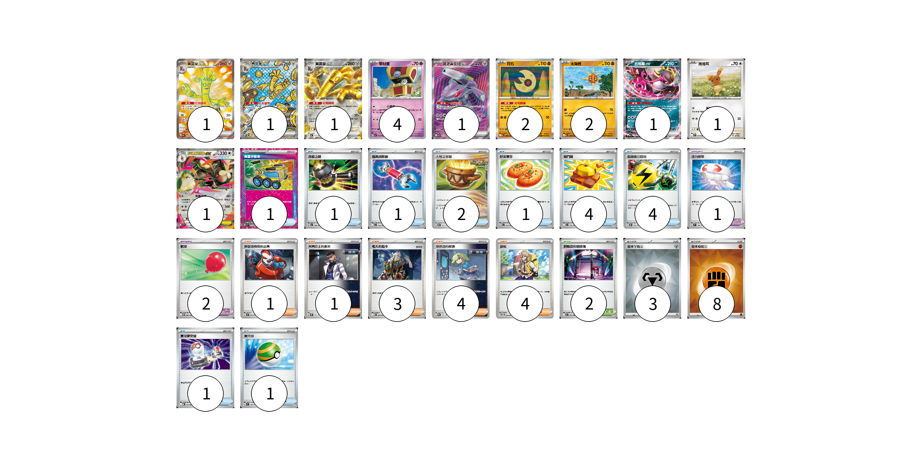 牌組構築方案 以此牌組為基礎新構築牌組 顯示卡面 顯示列表 寶可夢卡(15) 1 1 1 4 1 2 2 1 1 1 寶可夢道具(3) 1 2 物品卡(16) 1 1 1 2 1 4 4 1 1 支援者卡(13) 1 1 3 4 4 競技場卡(2) 2 能量卡(11) 3 8 寶可夢卡(15) 卡牌名稱 張數 卡牌名稱 張數 賽富豪ex SV3a 079/062 01 賽富豪ex SV8a 220/187 01 賽富豪ex SV8a 117/187 01 索財靈 SV7a 024/064 04 蓋諾賽克特ex SV11B 164/086 01 月石 M2a 086/193 02 太陽岩 M2a 087/193 02 吉雉雞ex M2a 114/193 01 捲捲耳 M2 071/080 01 超級長耳兔ex M2 072/080 01 寶可夢道具(3) 卡牌名稱 張數 卡牌名稱 張數 活力頭帶 SVM 140/175 01 氣球 SV11B 082/086 02 物品卡(16) 卡牌名稱 張數 卡牌名稱 張數 貴重手推車 SVK 020/042 01 改造之錘 M2a 148/193 01 道具拆除器 M2a 151/193 01 大地之容器 SV8a 143/187 02 好友寶芬 M2a 153/193 01 戰鬥鑼 M2a 155/193 04 超級能量回收 SV8a 141/187 04 寶可夢交替 MBG 015/022 01 巢穴球 SVM 133/175 01 支援者卡(13) 卡牌名稱 張數 卡牌名稱 張數 庫瑟洛斯奇的企圖 SV6a 062/064 01 弗圖博士的劇本 SV8a 175/187 01 老大的指令 MBD 020/022 03 暗碼迷的解讀 SV8a 165/187 04 派帕 SVOD 018/020 04 競技場卡(2) 卡牌名稱 張數 卡牌名稱 張數 對戰圓形競技場 M2 079/080 02 能量卡(11) 卡牌名稱 張數 卡牌名稱 張數 基本【鋼】能量 SVK MET 03 基本【鬥】能量 SVK FIG 08 以此牌組為基礎新構築牌組 牌組編碼 XBCVLL-Gpkqwe-cXgvAs copy 列印牌組單 牌組編碼已複製 分享至SNS