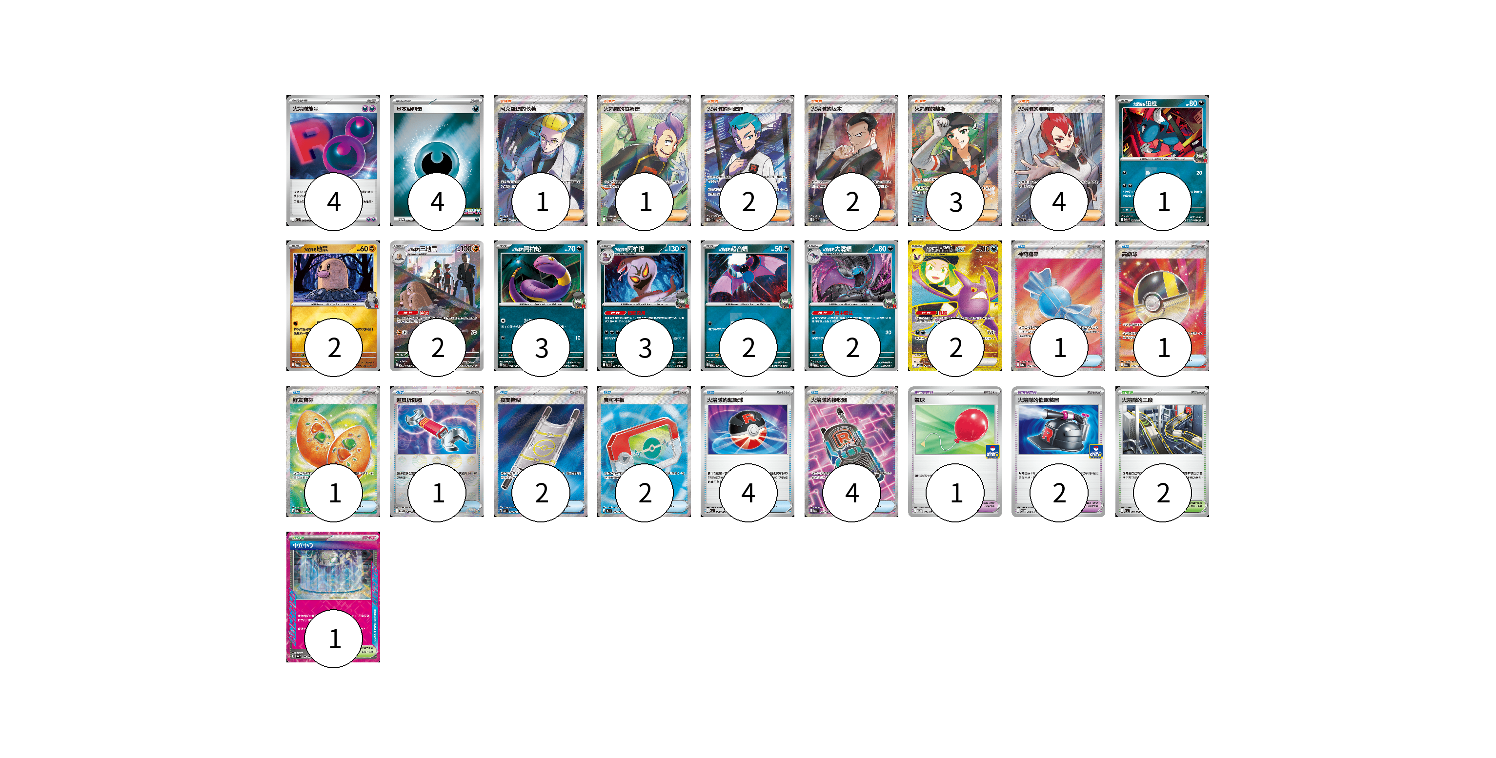 牌組構築方案 以此牌組為基礎新構築牌組 顯示卡面 顯示列表 寶可夢卡(17) 1 2 2 3 3 2 2 2 寶可夢道具(3) 1 2 物品卡(16) 1 1 1 1 2 2 4 4 支援者卡(13) 1 1 2 2 3 4 競技場卡(3) 2 1 能量卡(8) 4 4 寶可夢卡(17) 卡牌名稱 張數 卡牌名稱 張數 <火箭隊的>狃拉 M2a 104/193 01 火箭隊的地鼠 M2a 082/193 02 火箭隊的三地鼠 M2a 206/193 02 <火箭隊的>阿柏蛇 SV10 056/098 03 <火箭隊的>阿柏怪 SV10 057/098 03 火箭隊的超音蝠 M2a 099/193 02 火箭隊的大嘴蝠 M2a 100/193 02 <火箭隊的>叉字蝠ex SV10 131/098 02 寶可夢道具(3) 卡牌名稱 張數 卡牌名稱 張數 氣球 M-P 047/M-P 01 火箭隊的催眠裝置 SV-P 228/SV-P 02 物品卡(16) 卡牌名稱 張數 卡牌名稱 張數 神奇糖果 M1S 082/063 01 高級球 M2a 216/193 01 好友寶芬 M1S 081/063 01 道具拆除器 SV11W 080/086 01 夜間擔架 M1L 083/063 02 寶可平板 M3 103/080 02 火箭隊的超級球 SV10 088/098 04 火箭隊的接收器 M2a 217/193 04 支援者卡(13) 卡牌名稱 張數 卡牌名稱 張數 阿克羅瑪的執著 SV6a 083/064 01 火箭隊的拉姆達 SV10 122/098 01 火箭隊的阿波羅 SV10 120/098 02 火箭隊的坂木 SV10 121/098 02 火箭隊的蘭斯 SV10 123/098 03 火箭隊的雅典娜 SV10 119/098 04 競技場卡(3) 卡牌名稱 張數 卡牌名稱 張數 火箭隊的工廠 SV10 097/098 02 中立中心 SV6a 063/064 01 能量卡(8) 卡牌名稱 張數 卡牌名稱 張數 火箭隊能量 SV10 098/098 04 基本【惡】能量 M-P 034/M-P 04 以此牌組為基礎新構築牌組 牌組編碼 XEfzJP-eWFVYv-JIPnnJ copy 列印牌組單 牌組編碼已複製 分享至SNS