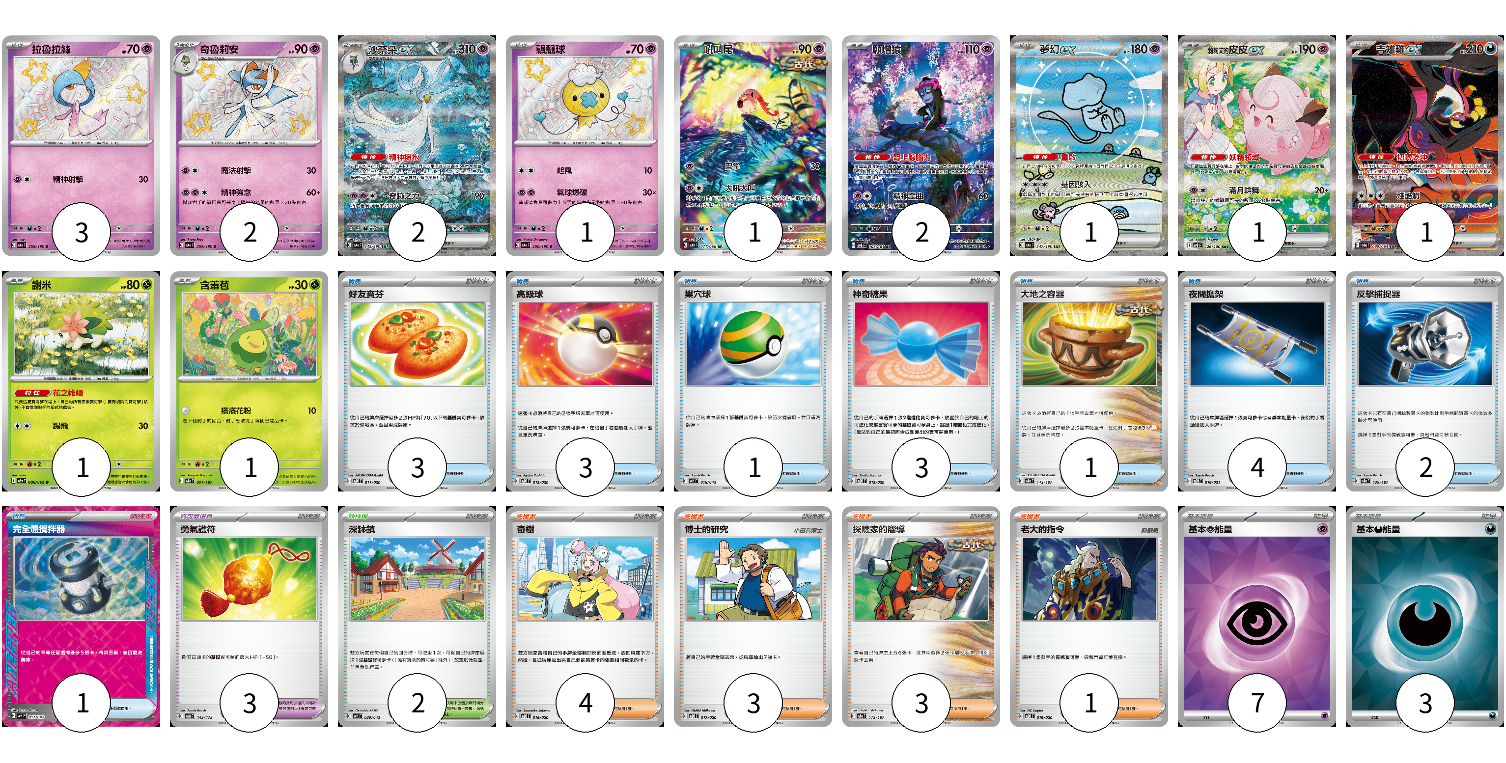 牌組構築方案 以此牌組為基礎新構築牌組 顯示卡面 顯示列表 寶可夢卡(16) 3 2 2 1 1 2 1 1 1 1 1 寶可夢道具(3) 3 物品卡(18) 3 3 1 3 1 4 2 1 支援者卡(11) 4 3 3 1 競技場卡(2) 2 能量卡(10) 7 3 寶可夢卡(16) 卡牌名稱 張數 卡牌名稱 張數 拉魯拉絲 SV4a 258/190 03 奇魯莉安 SV4a 259/190 02 沙奈朵ex SV4a 348/190 02 飄飄球 SV4a 260/190 01 吼叫尾 SV4K 071/066 01 願增猿 SV6 107/101 02 夢幻ex SV4a 347/190 01 莉莉艾的皮皮ex SV9 126/100 01 吉雉雞ex SV6a 089/064 01 謝米 SV9a 006/063 01 含羞苞 SV8a 001/187 01 寶可夢道具(3) 卡牌名稱 張數 卡牌名稱 張數 勇氣護符 SVM 142/175 03 物品卡(18) 卡牌名稱 張數 卡牌名稱 張數 好友寶芬 SVOD 011/020 03 高級球 SVOD 012/020 03 巢穴球 SVK 016/042 01 神奇糖果 SVOD 013/020 03 大地之容器 SV8a 143/187 01 夜間擔架 SVOM 016/021 04 反擊捕捉器 SV8a 139/187 02 完全體攪拌器 SVK 017/042 01 支援者卡(11) 卡牌名稱 張數 卡牌名稱 張數 奇樹 SVOD 016/020 04 博士的研究 SVOD 017/020 03 探險家的嚮導 SV8a 172/187 03 老大的指令 SVOD 019/020 01 競技場卡(2) 卡牌名稱 張數 卡牌名稱 張數 深缽鎮 SVK 039/042 02 能量卡(10) 卡牌名稱 張數 卡牌名稱 張數 基本【超】能量 SVOD PSY 07 基本【惡】能量 SVOM DAR 03 以此牌組為基礎新構築牌組 牌組編碼 XFlKSm-UXAaNe-vKkEWy copy 列印牌組單 牌組編碼已複製 分享至SNS