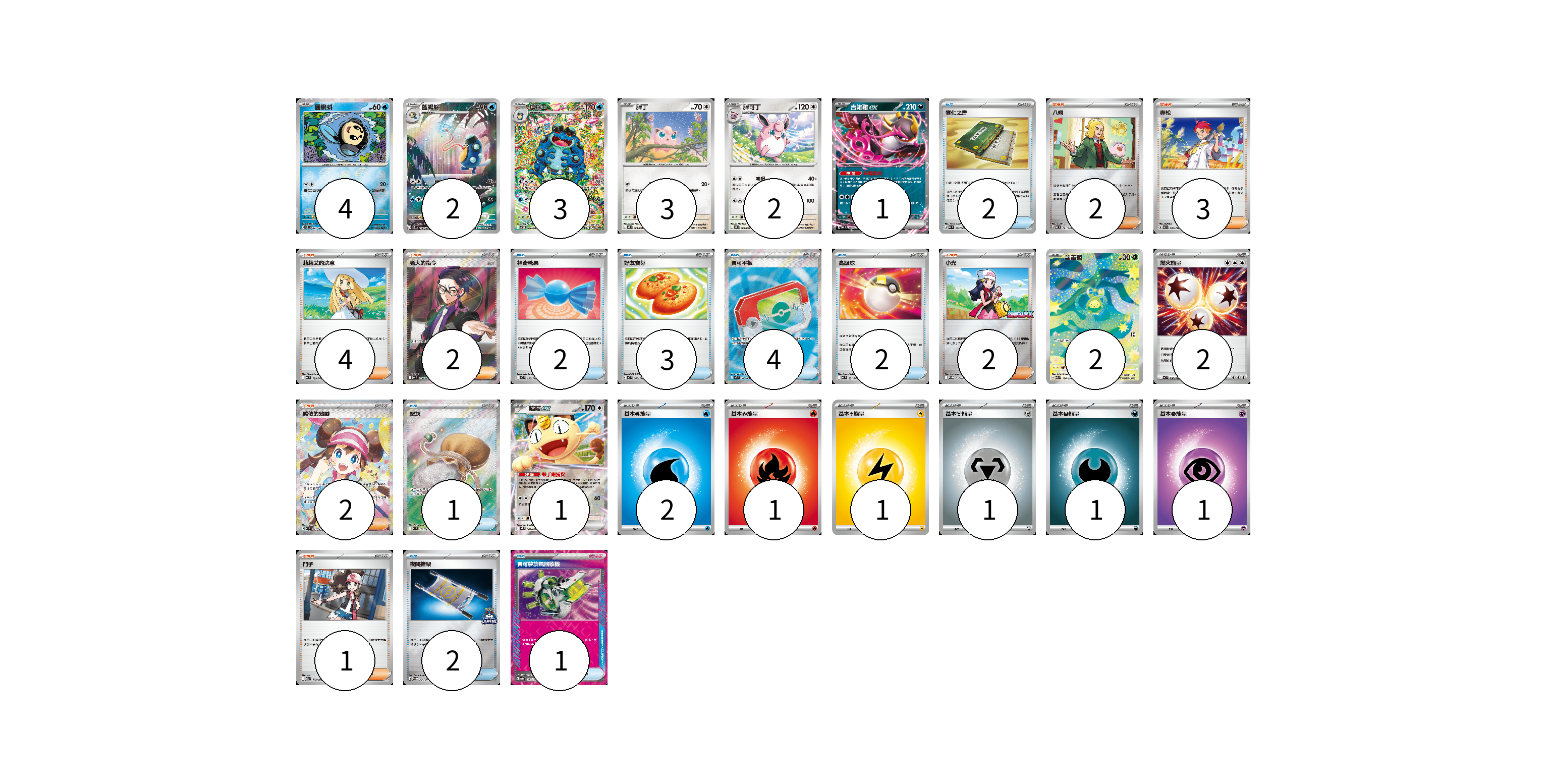 牌組構築方案 以此牌組為基礎新構築牌組 顯示卡面 顯示列表 寶可夢卡(18) 4 2 3 3 2 1 2 1 物品卡(17) 2 2 3 4 2 1 2 1 支援者卡(16) 2 3 4 2 2 2 1 能量卡(9) 2 2 1 1 1 1 1 寶可夢卡(18) 卡牌名稱 張數 卡牌名稱 張數 圓蝌蚪 SV11B 022/086 04 藍蟾蜍 SV11B 108/086 02 蟾蜍王 SV11B 109/086 03 胖丁 M2 064/080 03 胖可丁 M2 065/080 02 吉雉雞ex MC 489/742 01 含羞苞 M2a 196/193 02 喵喵ex M3 061/080 01 物品卡(17) 卡牌名稱 張數 卡牌名稱 張數 變化之書 M4 074/083 02 神奇糖果 MC 655/742 02 好友寶芬 MC 648/742 03 寶可平板 M3 103/080 04 高級球 MC 651/742 02 聖灰 M3 102/080 01 夜間擔架 SV-P 204/SV-P 02 寶可夢旋風回收機 SV8a 149/187 01 支援者卡(16) 卡牌名稱 張數 卡牌名稱 張數 八朔 MC 721/742 02 赤松 MC 696/742 03 莉莉艾的決意 MC 729/742 04 老大的指令(烏羽) MC 760/742 02 小光 M-P 028/M-P 02 鳴依的勉勵 M3 115/080 02 鬥子 M2a 172/193 01 能量卡(9) 卡牌名稱 張數 卡牌名稱 張數 燃火能量 MC 736/742 02 基本【水】能量 MC WAT 02 基本【火】能量 MC FIR 01 基本【雷】能量 MJ LIG 01 基本【鋼】能量 MC MET 01 基本【惡】能量 MC DAR 01 基本【超】能量 MC PSY 01 以此牌組為基礎新構築牌組 牌組編碼 XHvKqE-tTtYct-WxodIq copy 列印牌組單 牌組編碼已複製 分享至SNS