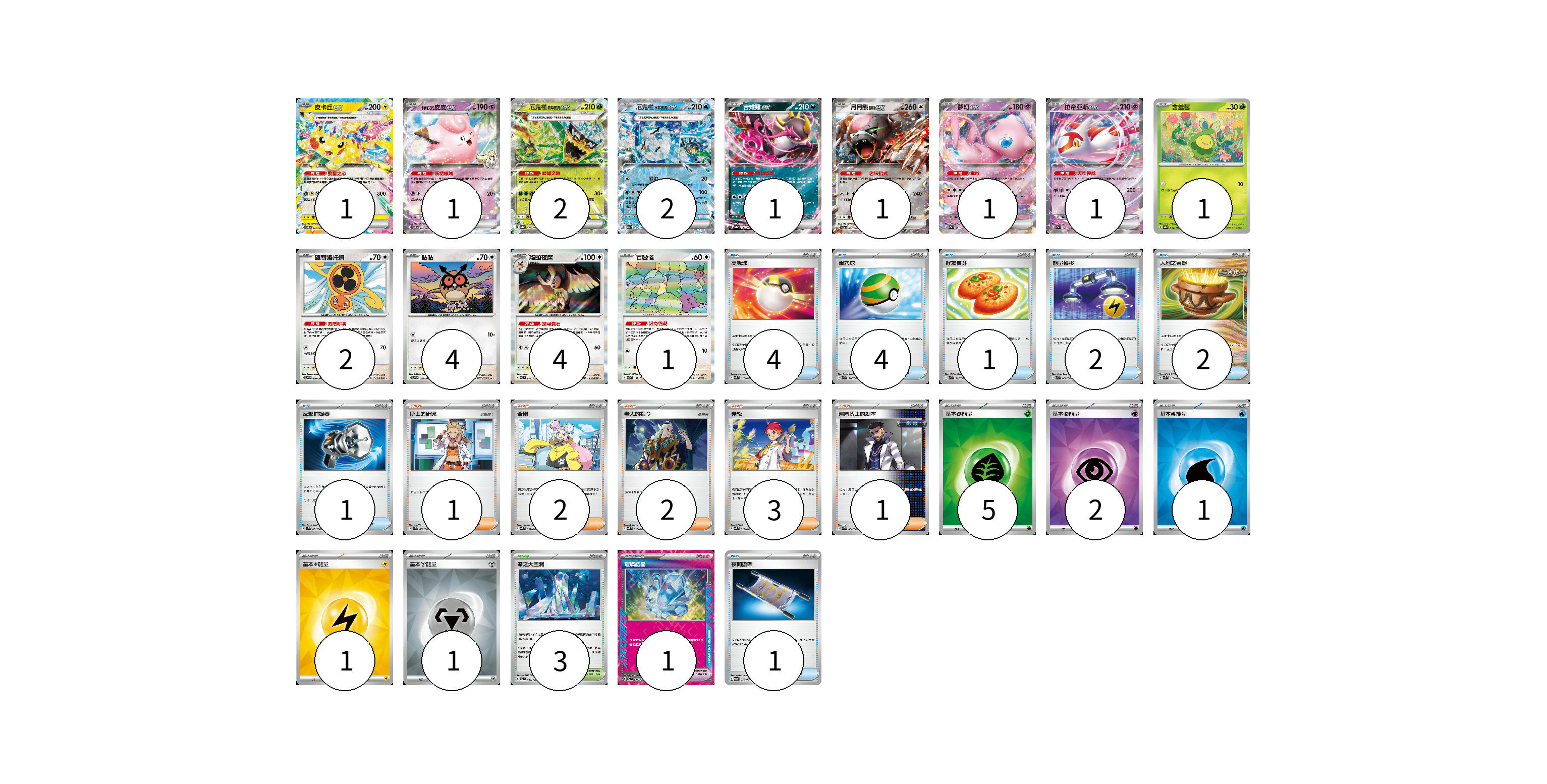 牌組構築方案 以此牌組為基礎新構築牌組 顯示卡面 顯示列表 寶可夢卡(22) 1 1 2 2 1 1 1 1 1 2 4 4 1 寶可夢道具(1) 1 物品卡(15) 4 4 1 2 2 1 1 支援者卡(9) 1 2 2 3 1 競技場卡(3) 3 能量卡(10) 5 2 1 1 1 寶可夢卡(22) 卡牌名稱 張數 卡牌名稱 張數 皮卡丘ex SV8 033/106 01 莉莉艾的皮皮ex SV9 033/100 01 厄鬼椪 碧草面具ex SV8a 020/187 02 厄鬼椪 水井面具ex SV8a 050/187 02 吉雉雞ex SV8a 104/187 01 月月熊 赫月 ex SV5a 052/066 01 夢幻ex SV2a 151/165 01 拉帝亞斯ex SV7a 019/064 01 含羞苞 SV8a 001/187 01 旋轉洛托姆 SV7 080/102 02 咕咕 SV7 076/102 04 貓頭夜鷹 SV7 077/102 04 百變怪 SV2a 132/165 01 寶可夢道具(1) 卡牌名稱 張數 卡牌名稱 張數 璀璨結晶 SV7 094/102 01 物品卡(15) 卡牌名稱 張數 卡牌名稱 張數 高級球 SVK 018/042 04 巢穴球 SVK 016/042 04 好友寶芬 SVK 015/042 01 能量轉移 SVK 008/042 02 大地之容器 SVK 012/042 02 反擊捕捉器 SVK 009/042 01 夜間擔架 SV6a 056/064 01 支援者卡(9) 卡牌名稱 張數 卡牌名稱 張數 博士的研究 SVK 032/042 01 奇樹 SVK 031/042 02 老大的指令 SVK 036/042 02 赤松 SVK 027/042 03 弗圖博士的劇本 SVK 034/042 01 競技場卡(3) 卡牌名稱 張數 卡牌名稱 張數 零之大空洞 SV7 102/102 03 能量卡(10) 卡牌名稱 張數 卡牌名稱 張數 基本【草】能量 SVK GRA 05 基本【超】能量 SVK PSY 02 基本【水】能量 SVK WAT 01 基本【雷】能量 SVK LIG 01 基本【鋼】能量 SVK MET 01 以此牌組為基礎新構築牌組 牌組編碼 XKJQKP-bgkqwN-XDkKgP copy 列印牌組單 牌組編碼已複製 分享至SNS