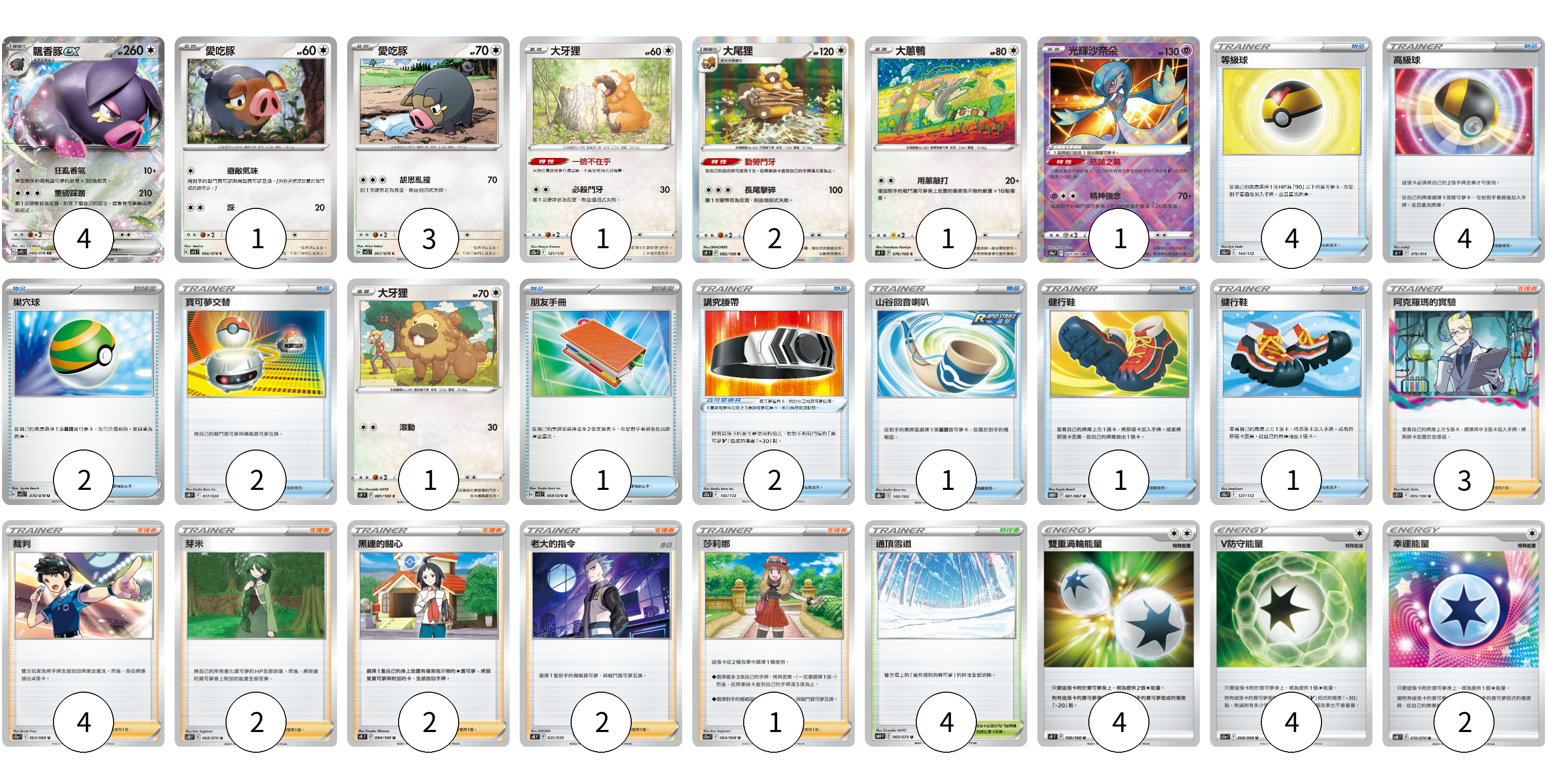 牌組構築方案 以此牌組為基礎新構築牌組 顯示卡面 顯示列表 寶可夢卡(14) 4 1 3 1 2 1 1 1 寶可夢道具(2) 2 物品卡(16) 4 4 2 2 1 1 1 1 支援者卡(14) 3 4 2 2 2 1 競技場卡(4) 4 能量卡(10) 4 4 2 寶可夢卡(14) 卡牌名稱 張數 卡牌名稱 張數 飄香豚ex SV1S 068/078 04 愛吃豚 SV1S 066/078 01 愛吃豚 SV1S 067/078 03 大牙狸 S12a 121/172 01 大尾狸 S9 082/100 02 大蔥鴨 S9 076/100 01 光輝沙奈朵 S10a 027/071 01 大牙狸 S9 081/100 01 寶可夢道具(2) 卡牌名稱 張數 卡牌名稱 張數 講究腰帶 S12a 145/172 02 物品卡(16) 卡牌名稱 張數 卡牌名稱 張數 等級球 S12a 143/172 04 高級球 SI 375/414 04 巢穴球 SV1S 070/078 02 寶可夢交替 SN 017/024 02 朋友手冊 SV1S 069/078 01 山谷回音喇叭 S8b 140/184 01 健行鞋 S10D 061/067 01 健行鞋 S12a 137/172 01 支援者卡(14) 卡牌名稱 張數 卡牌名稱 張數 阿克羅瑪的實驗 S11 095/100 03 裁判 S11a 063/068 04 芽米 S5R 068/070 02 黑連的關心 S9 094/100 02 老大的指令(赤日) SK 025/030 02 莎莉娜 S11a 064/068 01 競技場卡(4) 卡牌名稱 張數 卡牌名稱 張數 通頂雪道 S6H 069/070 04 能量卡(10) 卡牌名稱 張數 卡牌名稱 張數 雙重渦輪能量 S9 100/100 04 V防守能量 S11a 068/068 04 幸運能量 S6K 070/070 02 以此牌組為基礎新構築牌組 牌組編碼 XMmnhO-fWLHiD-bsTVZt copy 列印牌組單 牌組編碼已複製 分享至SNS