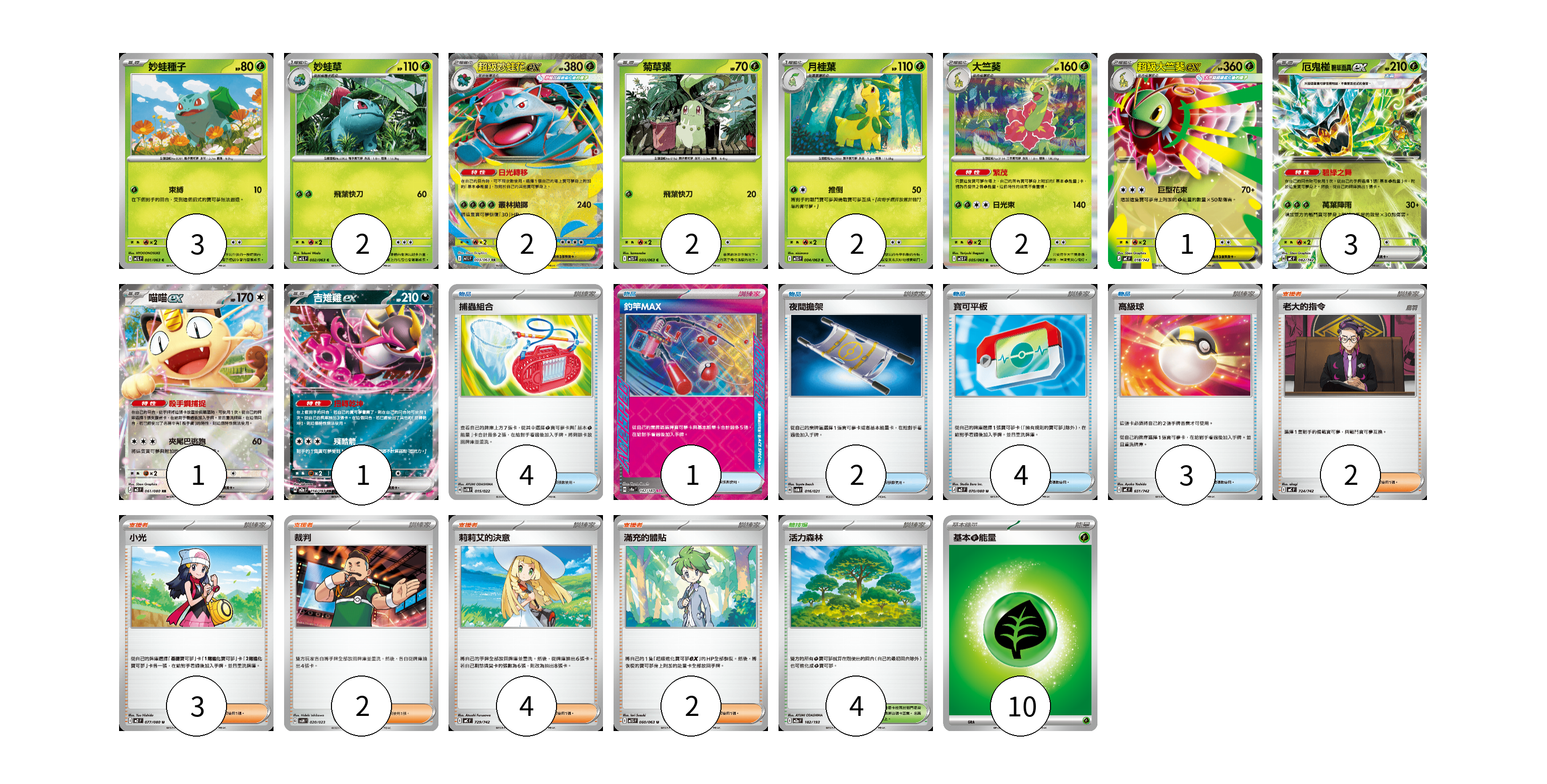 牌組構築方案 以此牌組為基礎新構築牌組 顯示卡面 顯示列表 寶可夢卡(19) 3 2 2 2 2 2 1 3 1 1 物品卡(14) 4 1 2 4 3 支援者卡(13) 2 3 2 4 2 競技場卡(4) 4 能量卡(10) 10 寶可夢卡(19) 卡牌名稱 張數 卡牌名稱 張數 妙蛙種子 M1L 001/063 03 妙蛙草 M1L 002/063 02 超級妙蛙花ex M1L 003/063 02 菊草葉 M1S 003/063 02 月桂葉 M1S 004/063 02 大竺葵 M1S 005/063 02 超級大竺葵ex MC 018/742 01 厄鬼椪 碧草面具ex MC 082/742 03 喵喵ex M3 061/080 01 吉雉雞ex M2a 114/193 01 物品卡(14) 卡牌名稱 張數 卡牌名稱 張數 捕蟲組合 SVTM 015/022 04 釣竿MAX SV8a 142/187 01 夜間擔架 SVOM 016/021 02 寶可平板 M3 070/080 04 高級球 MC 651/742 03 支援者卡(13) 卡牌名稱 張數 卡牌名稱 張數 老大的指令 MC 724/742 02 小光 M2 077/080 03 裁判 SVAM 020/023 02 莉莉艾的決意 MC 729/742 04 滿充的體貼 M1S 060/063 02 競技場卡(4) 卡牌名稱 張數 卡牌名稱 張數 活力森林 M2a 182/193 04 能量卡(10) 卡牌名稱 張數 卡牌名稱 張數 基本【草】能量 M-P GRA 10 以此牌組為基礎新構築牌組 牌組編碼 XPPfSZ-IzNOVf-ugpHXy copy 列印牌組單 牌組編碼已複製 分享至SNS