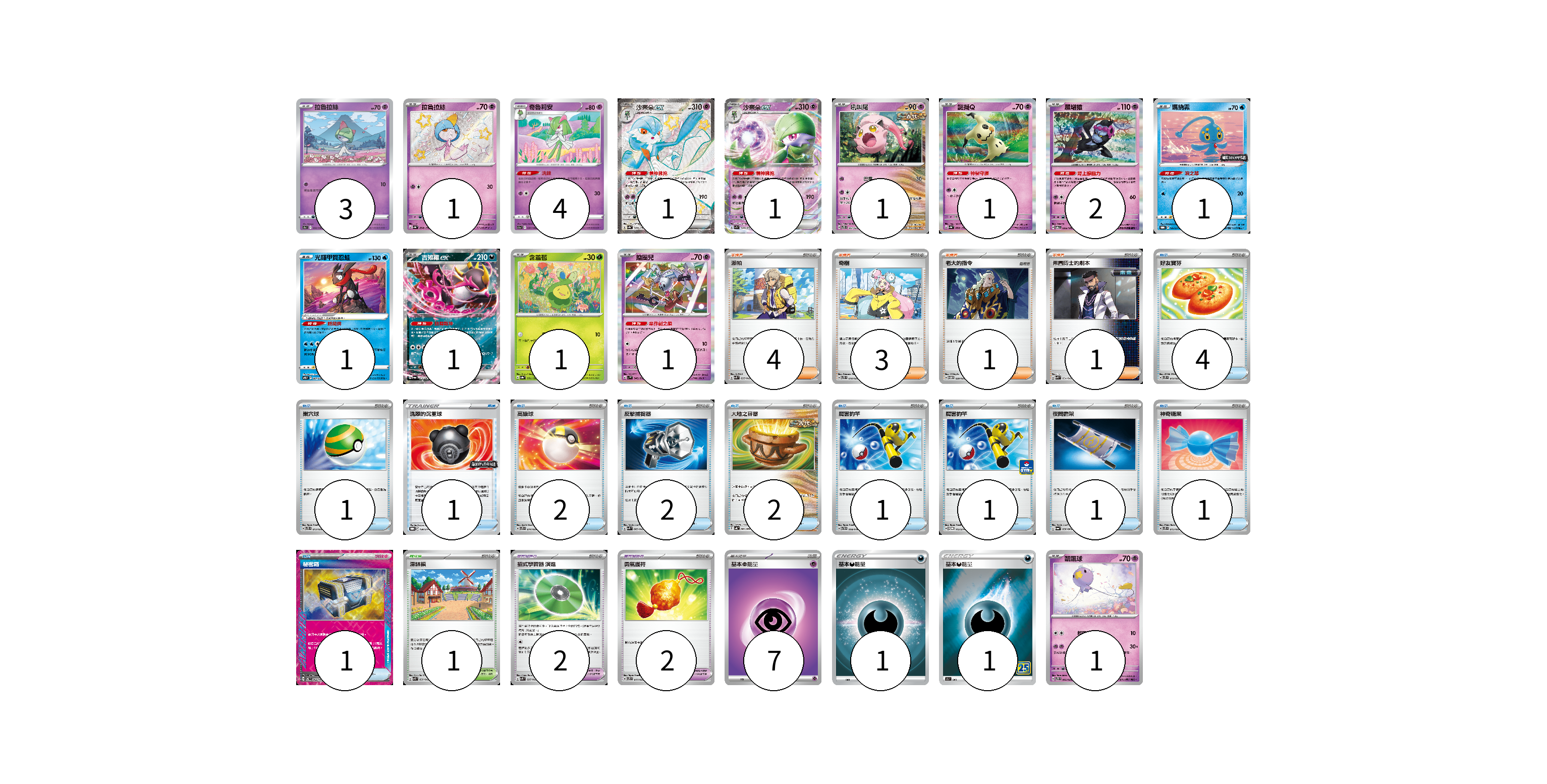 牌組構築方案 以此牌組為基礎新構築牌組 顯示卡面 顯示列表 寶可夢卡(20) 3 1 4 1 1 1 1 2 1 1 1 1 1 1 寶可夢道具(4) 2 2 物品卡(17) 4 1 1 2 2 2 1 1 1 1 1 支援者卡(9) 4 3 1 1 競技場卡(1) 1 能量卡(9) 7 1 1 寶可夢卡(20) 卡牌名稱 張數 卡牌名稱 張數 拉魯拉絲 S9a 032/067 03 拉魯拉絲 SV4a 258/190 01 奇魯莉安 S11a 037/068 04 沙奈朵ex SV4a 328/190 01 沙奈朵ex SV1S 028/078 01 吼叫尾 SVTS 007/022 01 謎擬Q SV4a 088/190 01 願增猿 SV6 055/101 02 瑪納霏 SV-P 135/SV-P 01 光輝甲賀忍蛙 SVTS 001/022 01 吉雉雞ex SV6a 038/064 01 含羞苞 SV8a 001/187 01 鑰圈兒 SV1V 045/078 01 飄飄球 SVTS 005/022 01 寶可夢道具(4) 卡牌名稱 張數 卡牌名稱 張數 招式學習器 演進 SVK 025/042 02 勇氣護符 SVTS 017/022 02 物品卡(17) 卡牌名稱 張數 卡牌名稱 張數 好友寶芬 SVTS 012/022 04 巢穴球 SVTS 013/022 01 洗翠的沉重球 SV-P 138/SV-P 01 高級球 SVTS 014/022 02 反擊捕捉器 SVK 009/042 02 大地之容器 SV4K 060/066 02 厲害釣竿 SVTH 008/018 01 厲害釣竿 SV-P 112/SV-P 01 夜間擔架 SV6a 056/064 01 神奇糖果 SVTS 015/022 01 秘密箱 SV6 092/101 01 支援者卡(9) 卡牌名稱 張數 卡牌名稱 張數 派帕 SVK 035/042 04 奇樹 SVTS 018/022 03 老大的指令 SVTM 020/022 01 弗圖博士的劇本 SVK 034/042 01 競技場卡(1) 卡牌名稱 張數 卡牌名稱 張數 深缽鎮 SVK 039/042 01 能量卡(9) 卡牌名稱 張數 卡牌名稱 張數 基本【超】能量 SVTS PSY 07 基本惡能量 SLD DAR 01 基本惡能量 S8a DAR 01 以此牌組為基礎新構築牌組 牌組編碼 XPtmgH-Znpxbo-mBBJNy copy 列印牌組單 牌組編碼已複製 分享至SNS